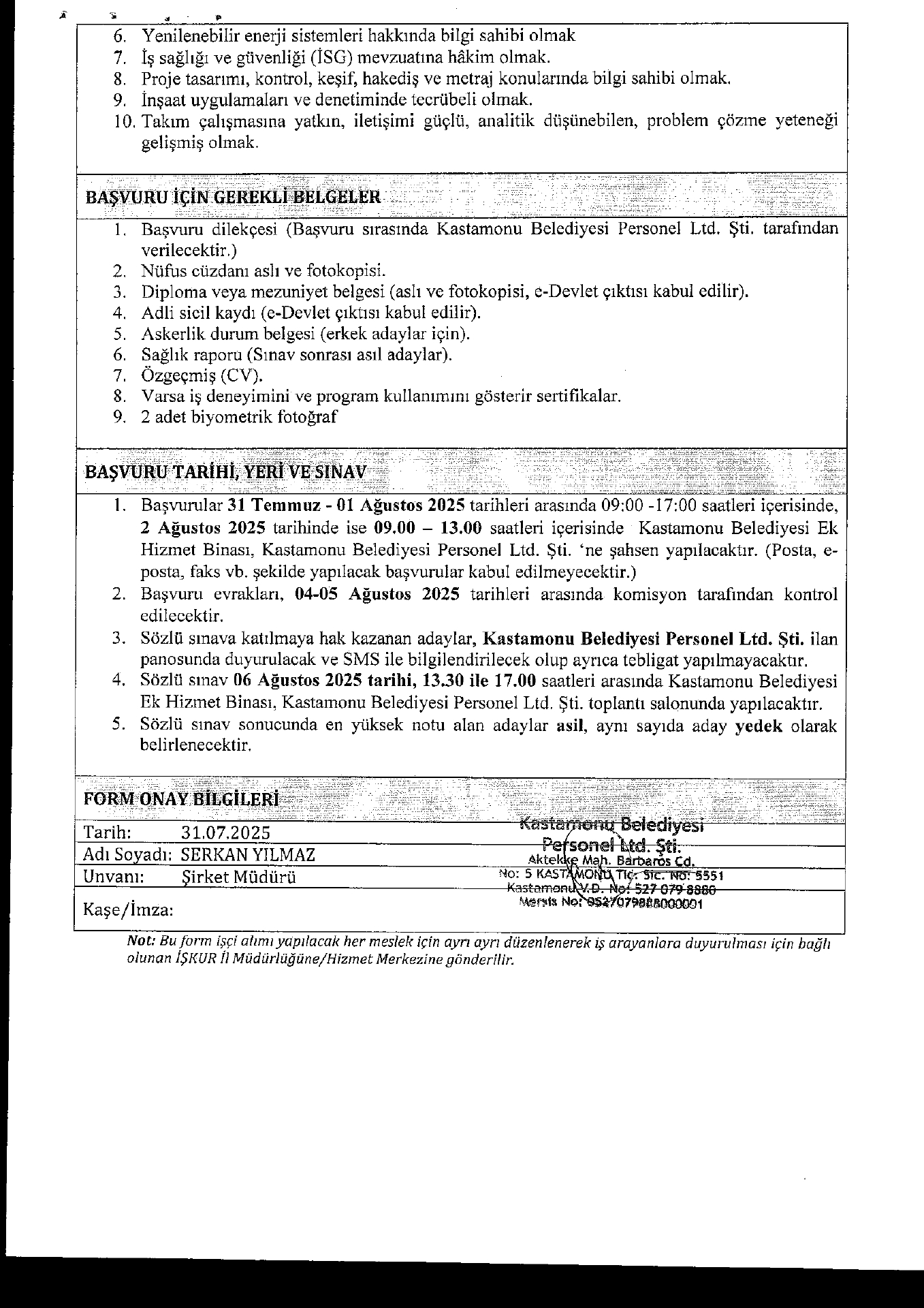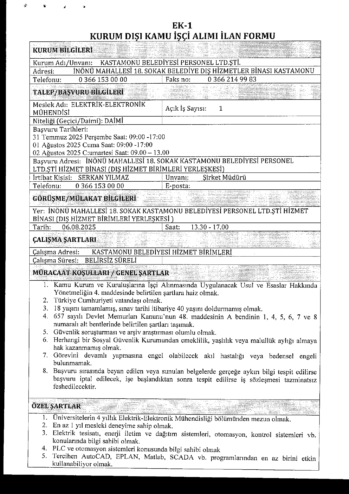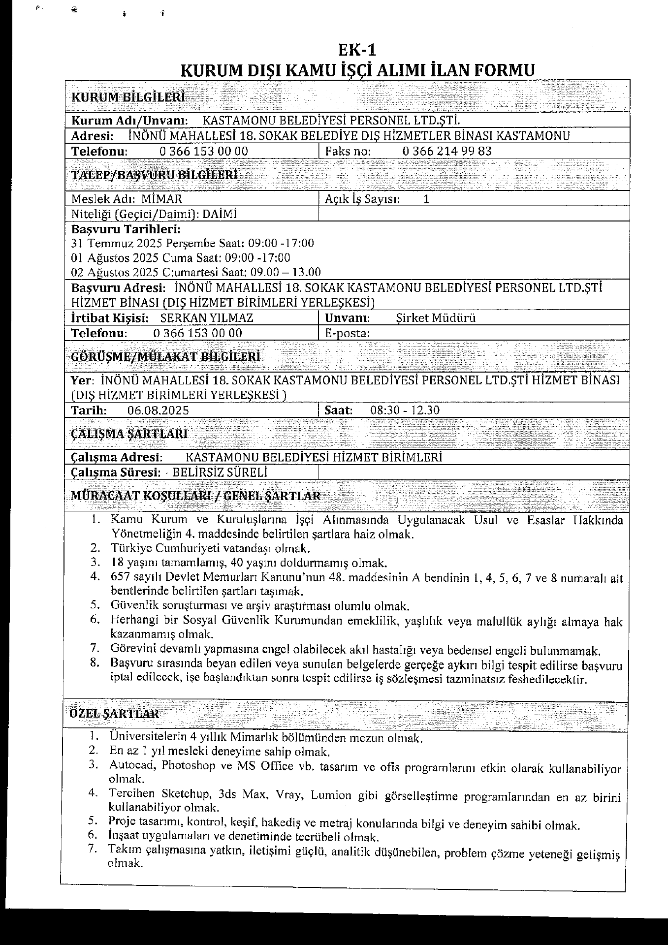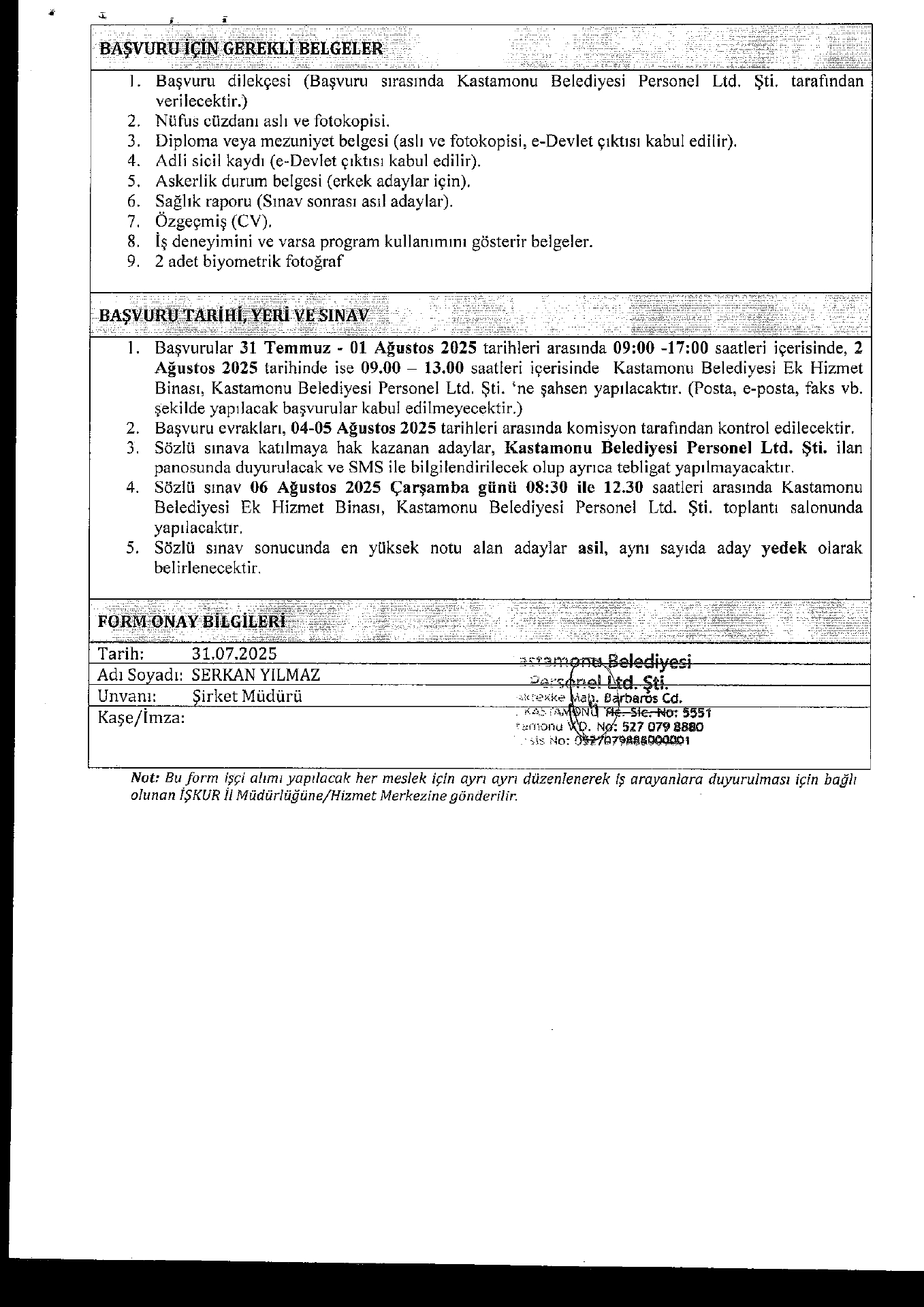 Kastamonu Belediyesi 1 İşçi Alacak. Son başvuru tarihi 02 ağustos 2025