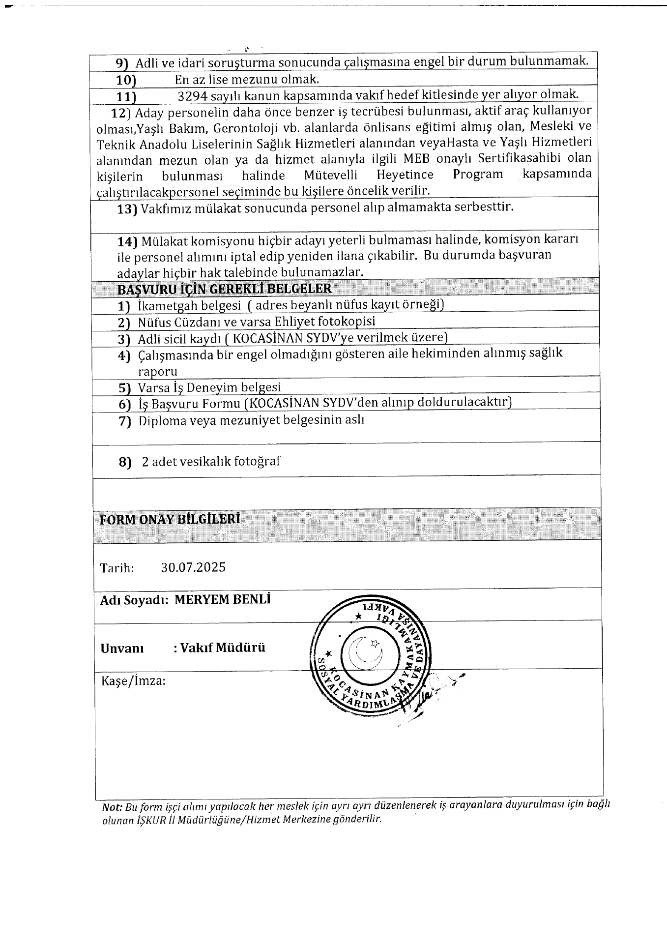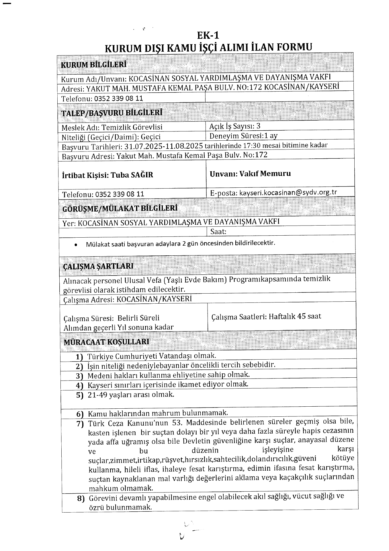 Kayseri Kocasinan SYDV Geçici 1 İşçi Alacak. Son başvuru tarihi 11 ağustos 2025