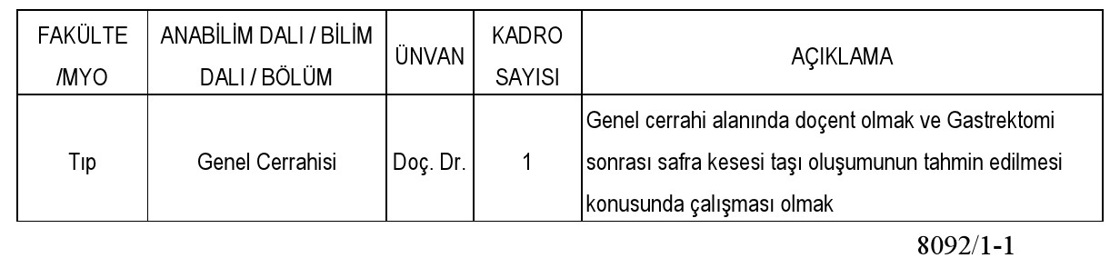 Başvuruda İstenen Belgeler: Özgeçmiş (YÖK formatlı), 2 adet fotoğraf, kimlik fotokopisi, adli sicil kaydı, askerlik durum belgesi, mezuniyet belgeleri, yabancı dil belgesi.