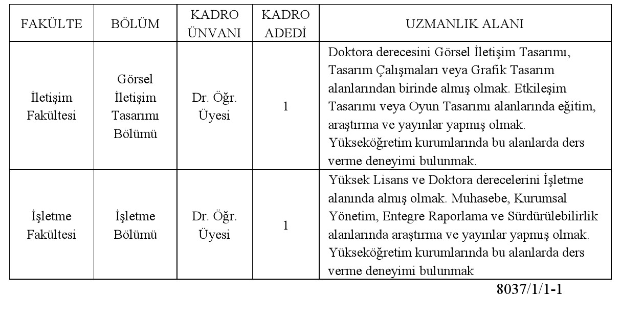 Üniversitemiz ilgili Birimlerine 2547 sayılı Kanun ile bu Kanuna dayanılarak Yükseköğretim Kurulu Başkanlığı'nca 12.06.2018 tarih ve 30449 sayılı Resmi Gazete'de yayımlanan "Öğretim Üyeliğine Yükseltilme ve Atanma Yönetmeliği", Üniversitemiz resmi erişim sayfasında yayımlanan "Akademik Kadrolara Atama ve Yükseltmeler Hakkında Yönerge"de belirtilen kıstasları yerine getirmiş olmak kaydıyla ilgili alanlarda uzmanlaşmış öğretim üyeleri alınacaktır.