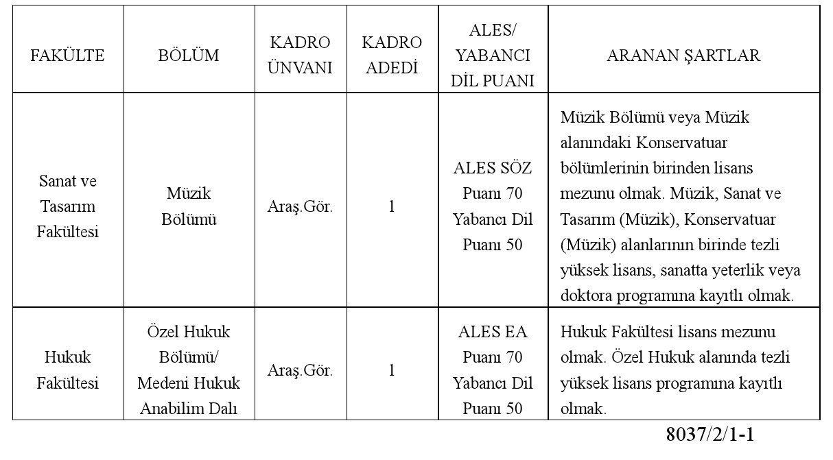*Araştırma görevlisi kadrolarına başvurularda tezli yüksek lisans, doktora veya sanatta yeterlik eğitimi öğrencisi olmak şartı aranır.
