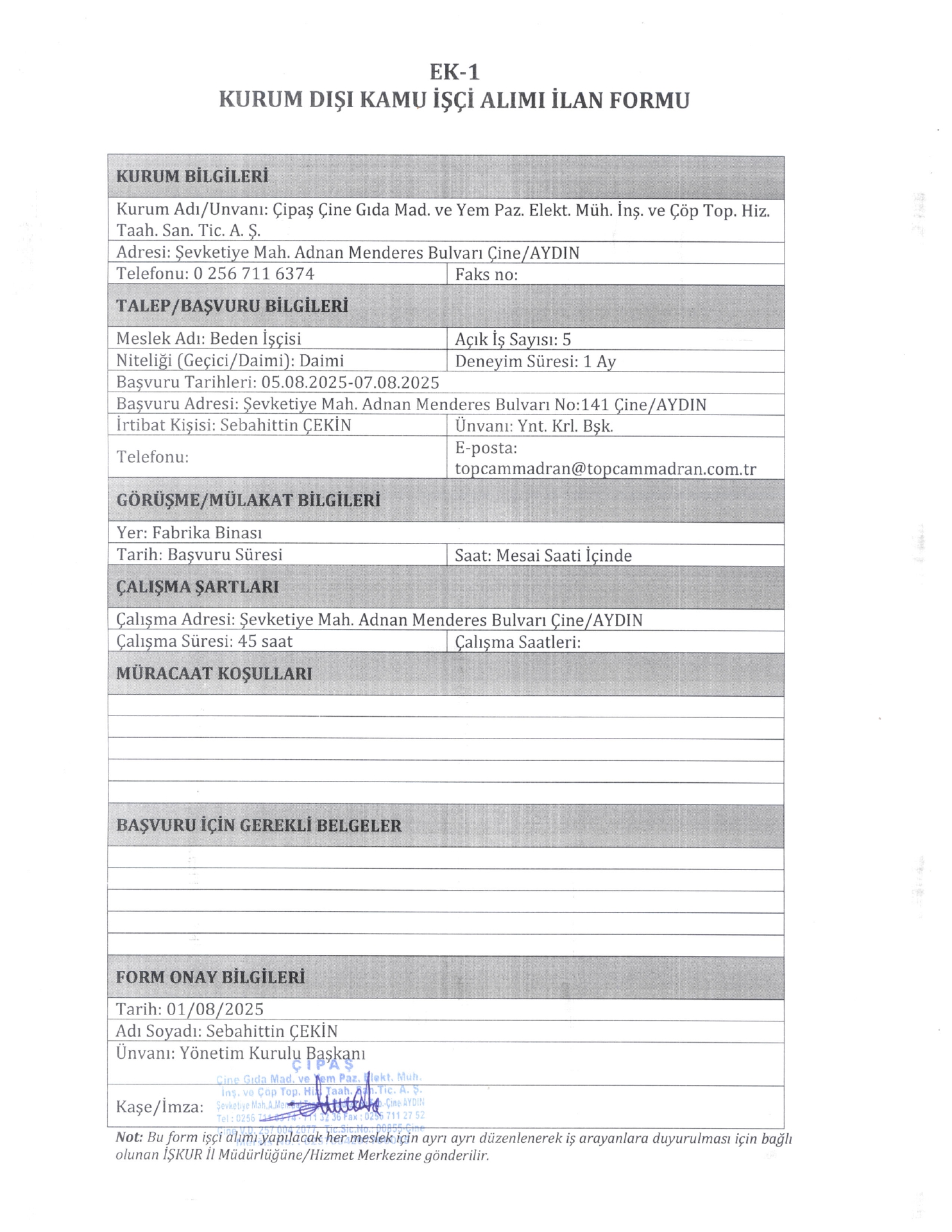 Aydın Çine Çipas Gıda 5 İşçi Alacak. Son başvuru tarihi 7 ağustos 2025