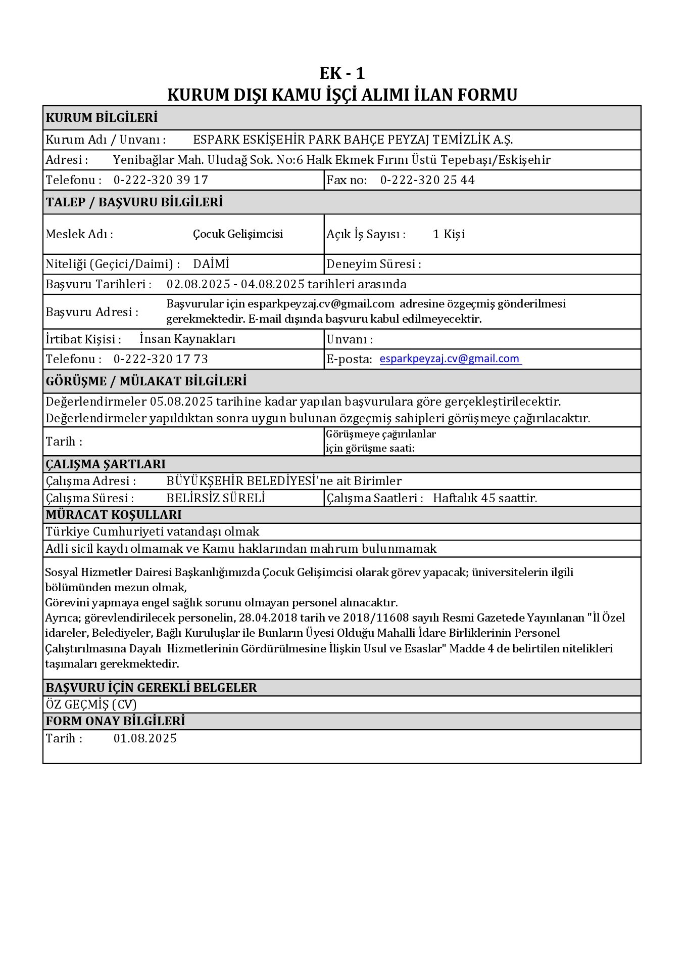 Eskişehir Espark 1 İşçi Alacak. Son başvuru tarihi 4 ağustos 2025