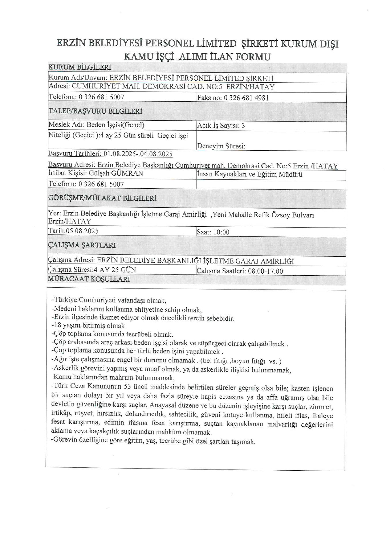 Hatay Erzin Belediyesi Geçici 3 İşçi Alacak. Son başvuru tarihi 4 ağustos 2025