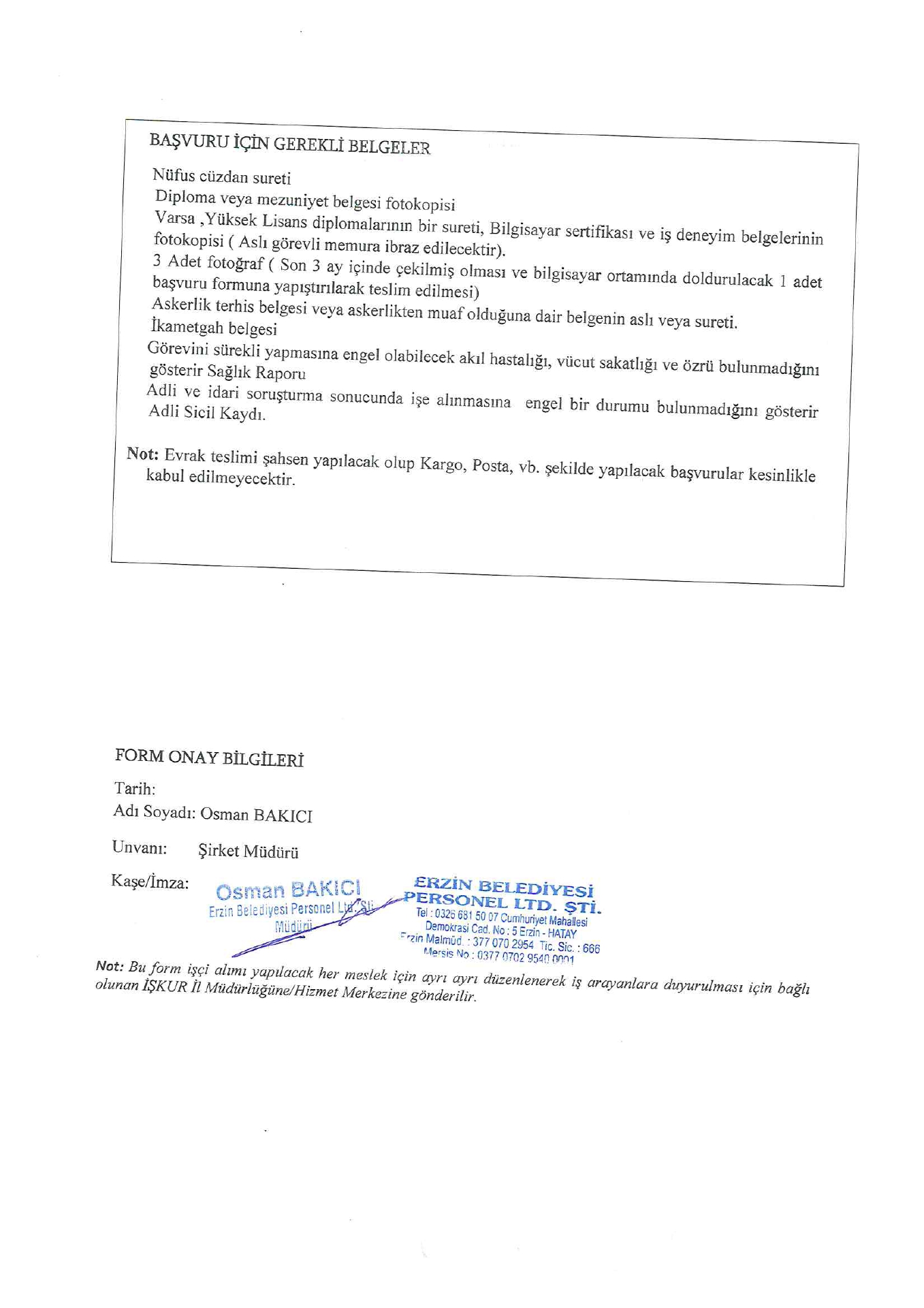 Hatay Erzin Belediyesi Geçici 3 İşçi Alacak