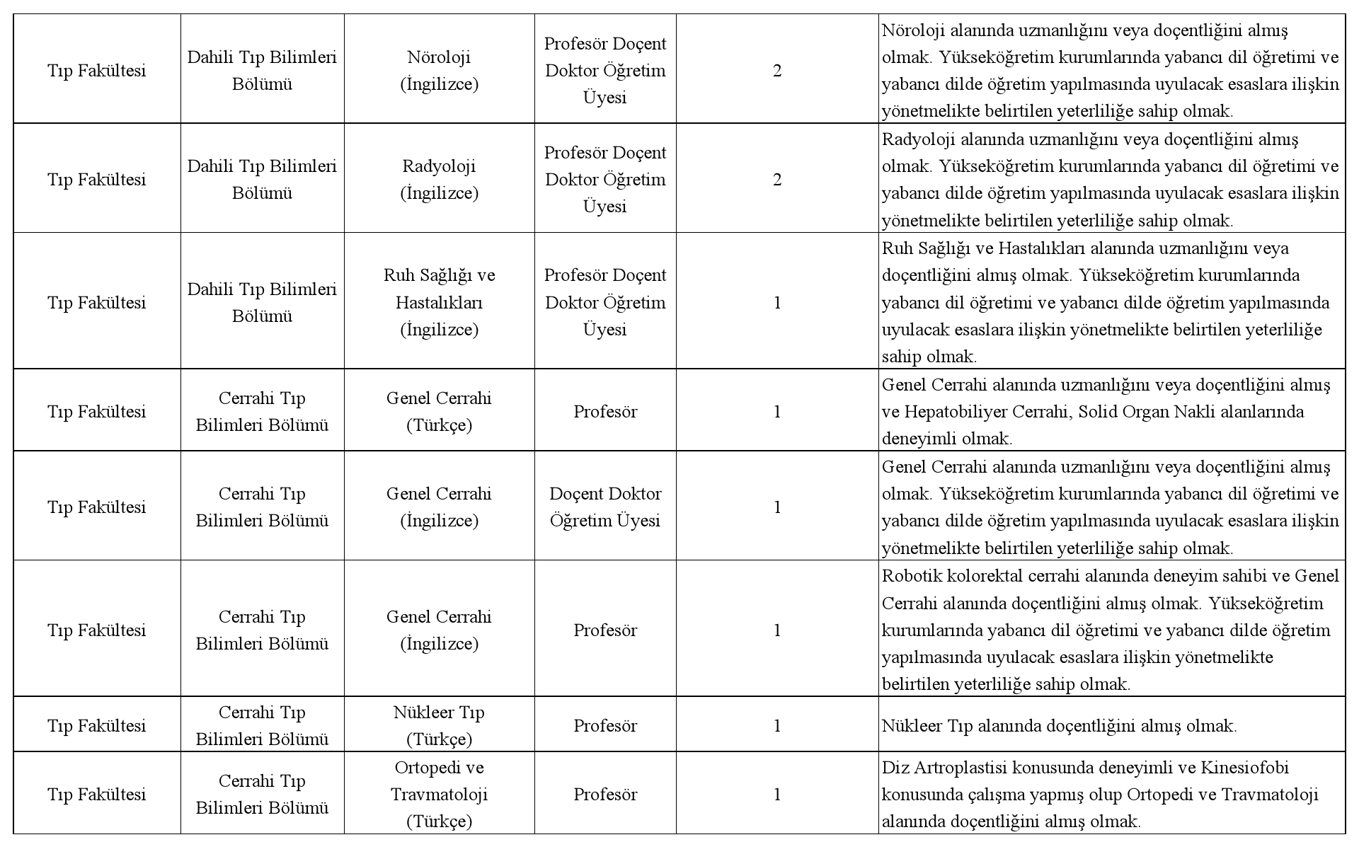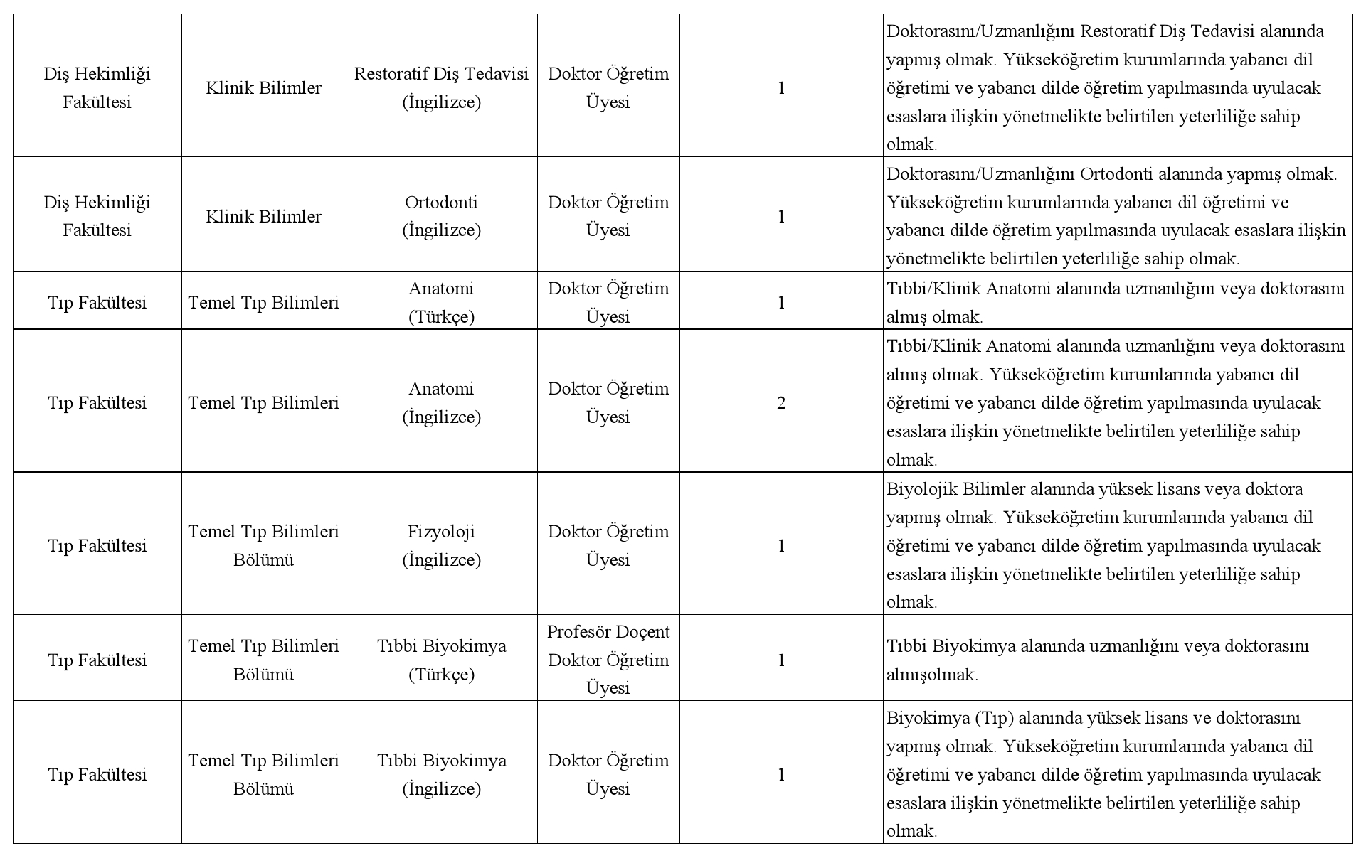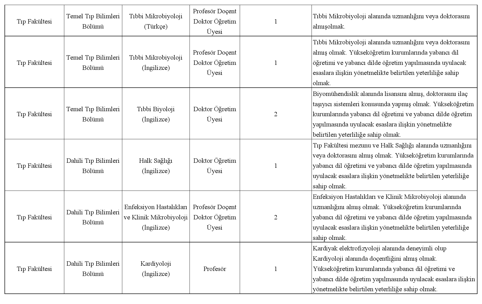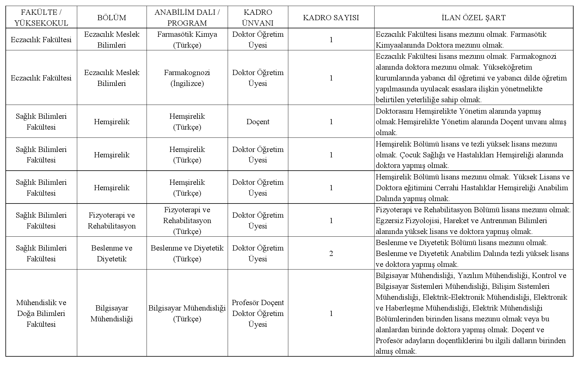 Üniversitemiz 2547 sayılı Yüksek Öğretim Kanunu Öğretim Üyeliğine Yükseltilme ve Atanma Yönetmeliği hükümlerinde aranan koşulları yerine getirmiş olmak kaydı ile aylık ve özlük hakları yönünden 4857 sayılı İş Kanunu hükümlerine tabi olarak, Üniversitemizin aşağıda belirtilen akademik birimlerine öğretim üyesi alınacaktır.