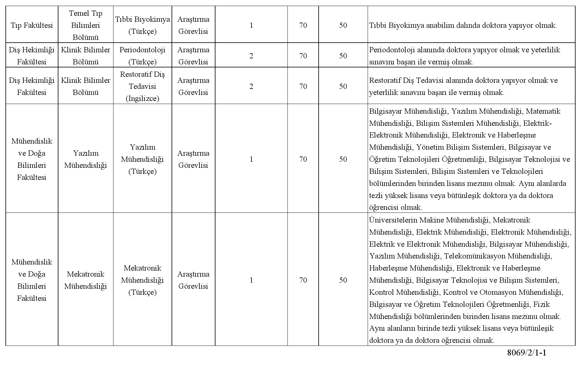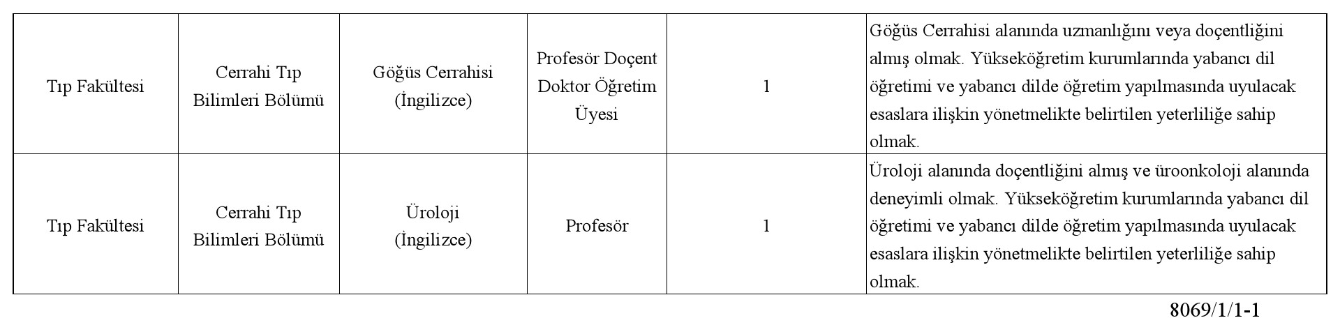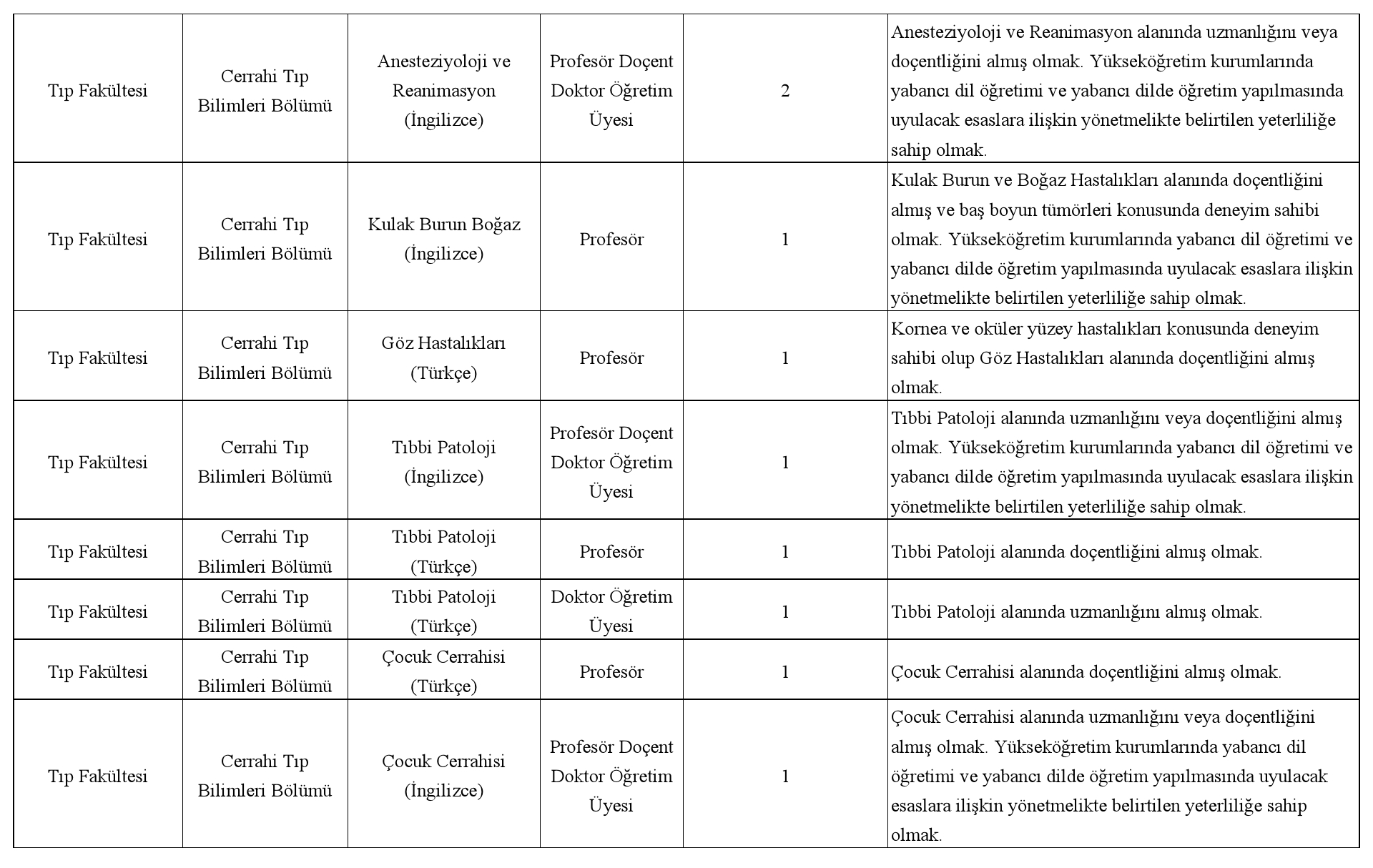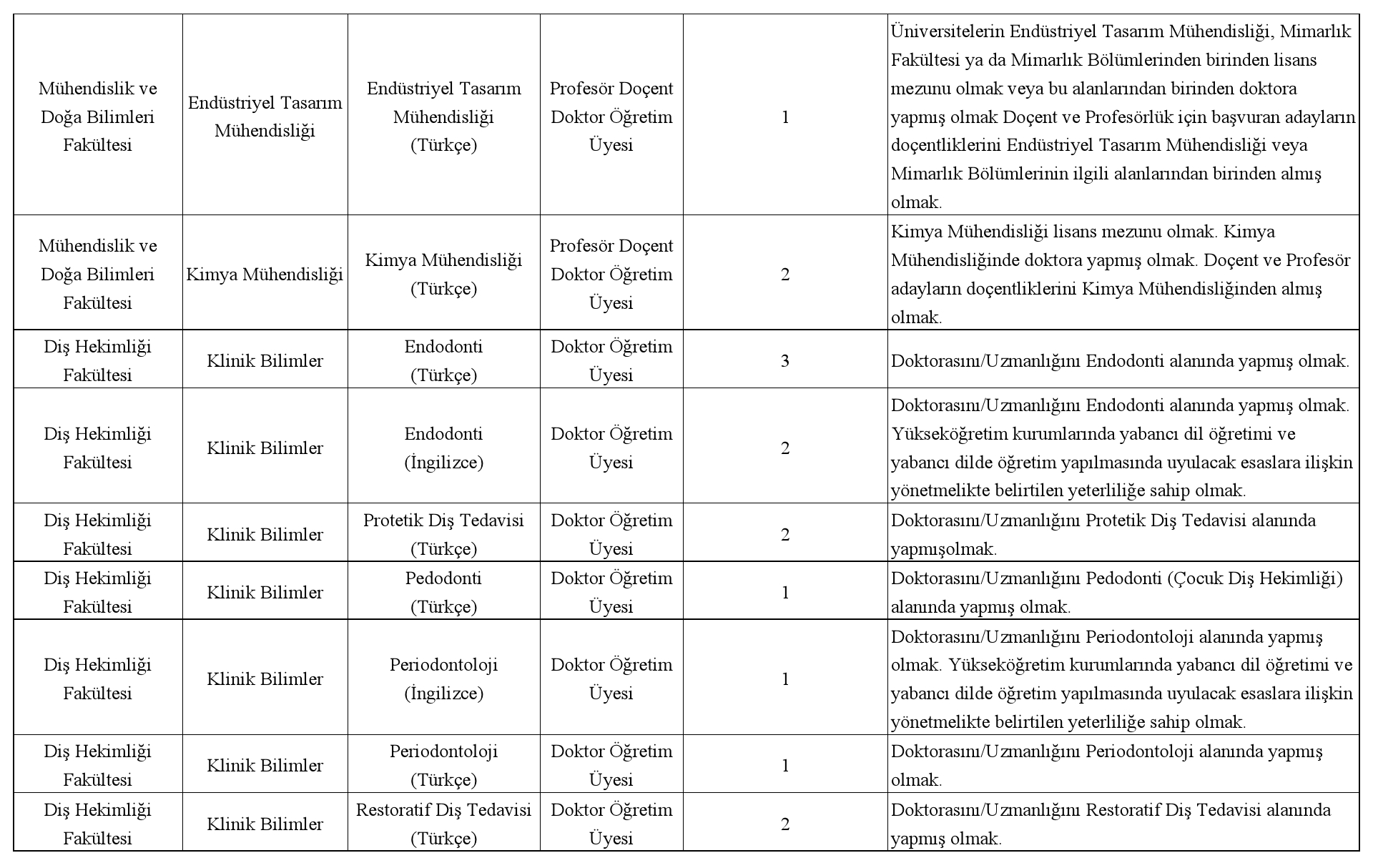Üniversitemiz 2547 sayılı Yüksek Öğretim Kanunu Öğretim Üyeliğine Yükseltilme ve Atanma Yönetmeliği hükümlerinde aranan koşulları yerine getirmiş olmak kaydı ile aylık ve özlük hakları yönünden 4857 sayılı İş Kanunu hükümlerine tabi olarak, Üniversitemizin aşağıda belirtilen akademik birimlerine öğretim üyesi alınacaktır.
