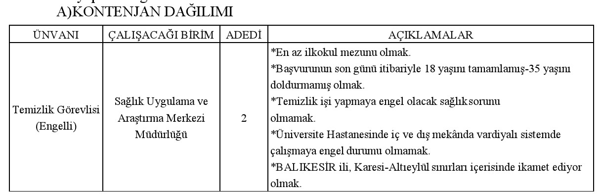 -Balıkesir Üniversitesi Sağlık Uygulama ve Araştırma Merkezi Müdürlüğünde çalıştırılmak üzere, 657 sayılı Devlet Memurları Kanunun 4/D maddesi uyarınca Sürekli İşçi kadrosunda çalıştırılmak üzere; 4857 sayılı İş Kanunu ve "Kamu Kurum ve Kuruluşlarına İşçi Alınmasında Uygulanacak Usul ve Esaslar Hakkında Yönetmelik" hükümleri kapsamında Türkiye İş Kurumu (İŞKUR) üzerinden aşağıda yer alan tabloda belirtilen ünvanda "Sürekli İşçi" alınacaktır.