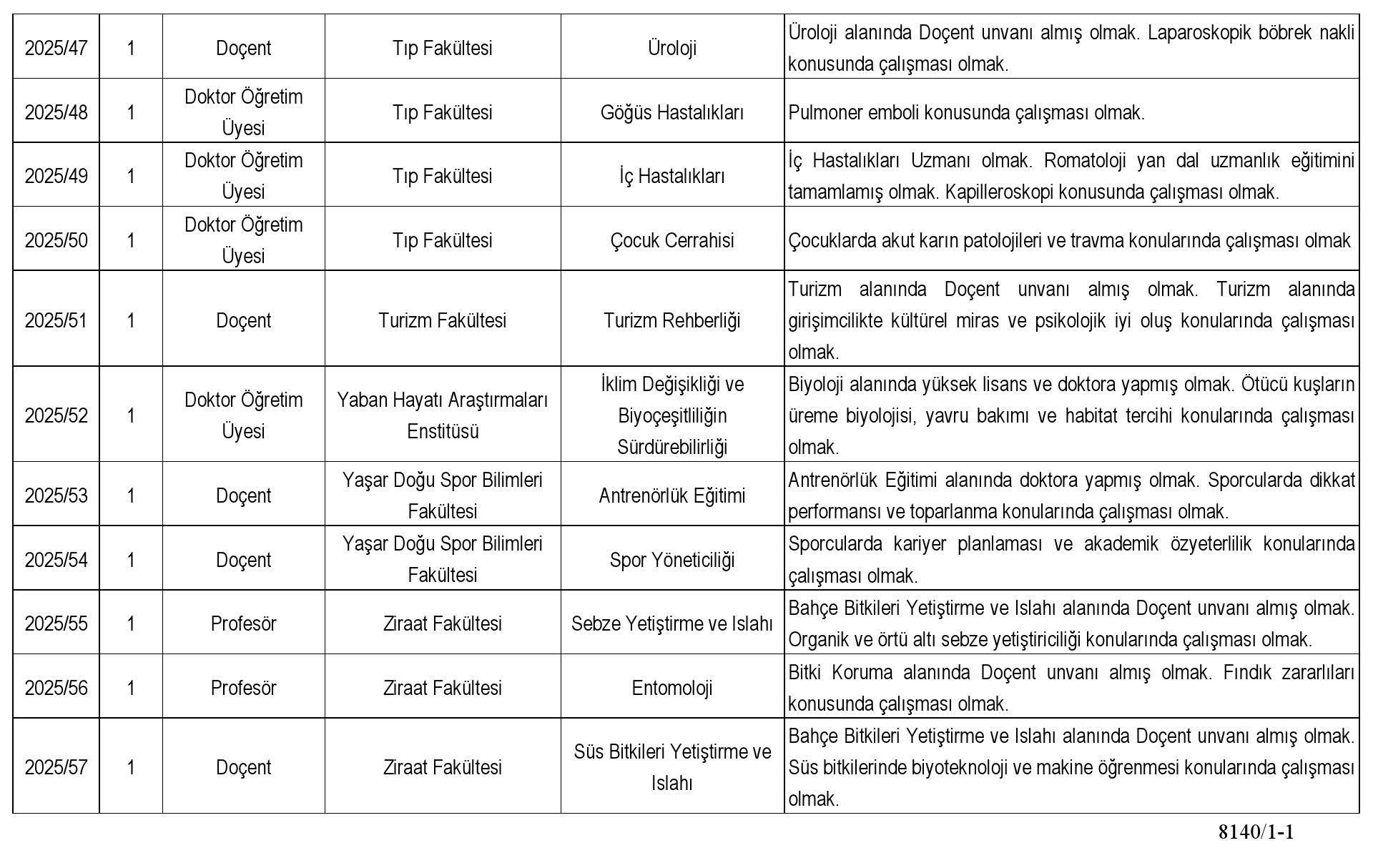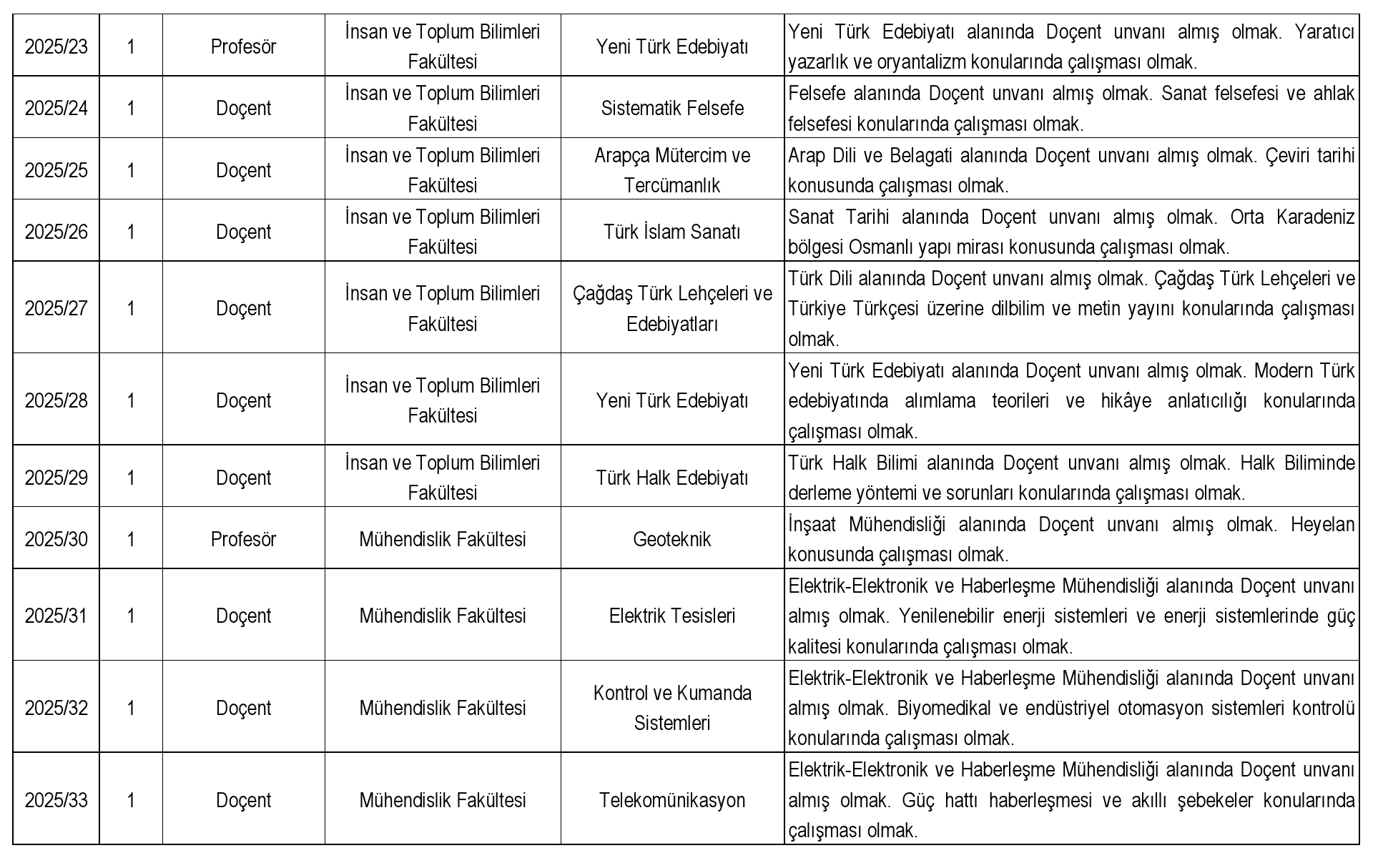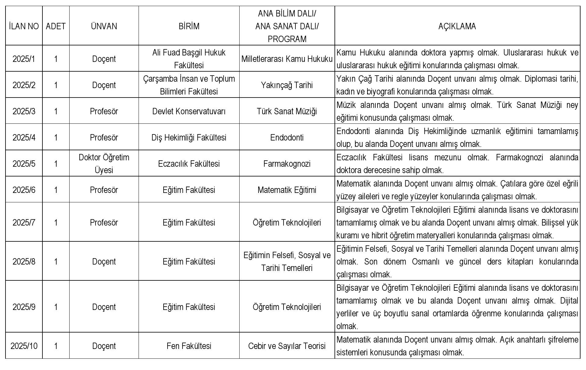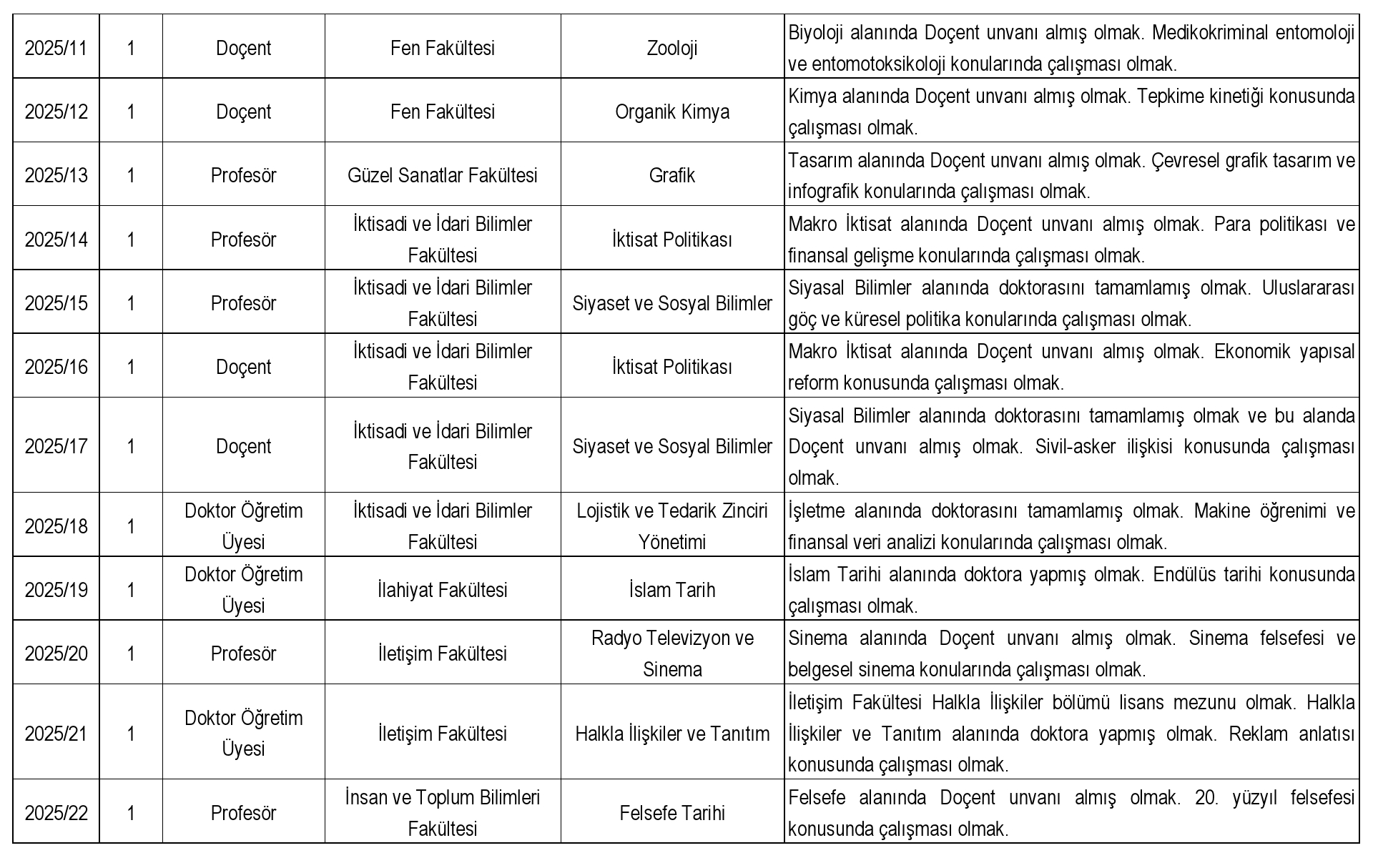 Üniversitemize 2547 sayılı Kanun Hükümlerine göre Öğretim Üyesi alınacaktır. Adayların 657 sayılı Kanunun 48. maddesinde ve diğer ilgili mevzuatlardaki şartları taşımaları gerekmektedir.