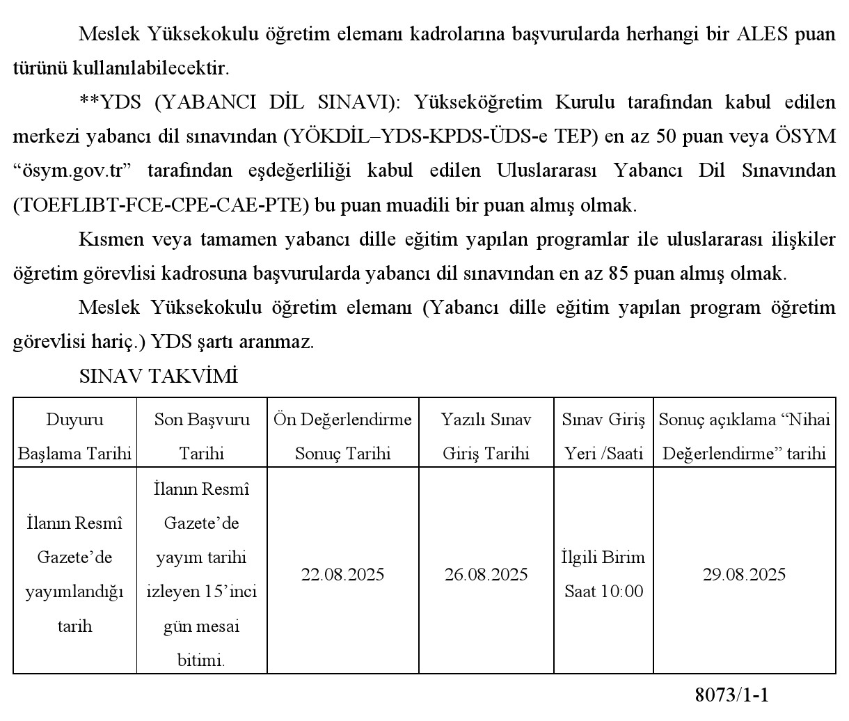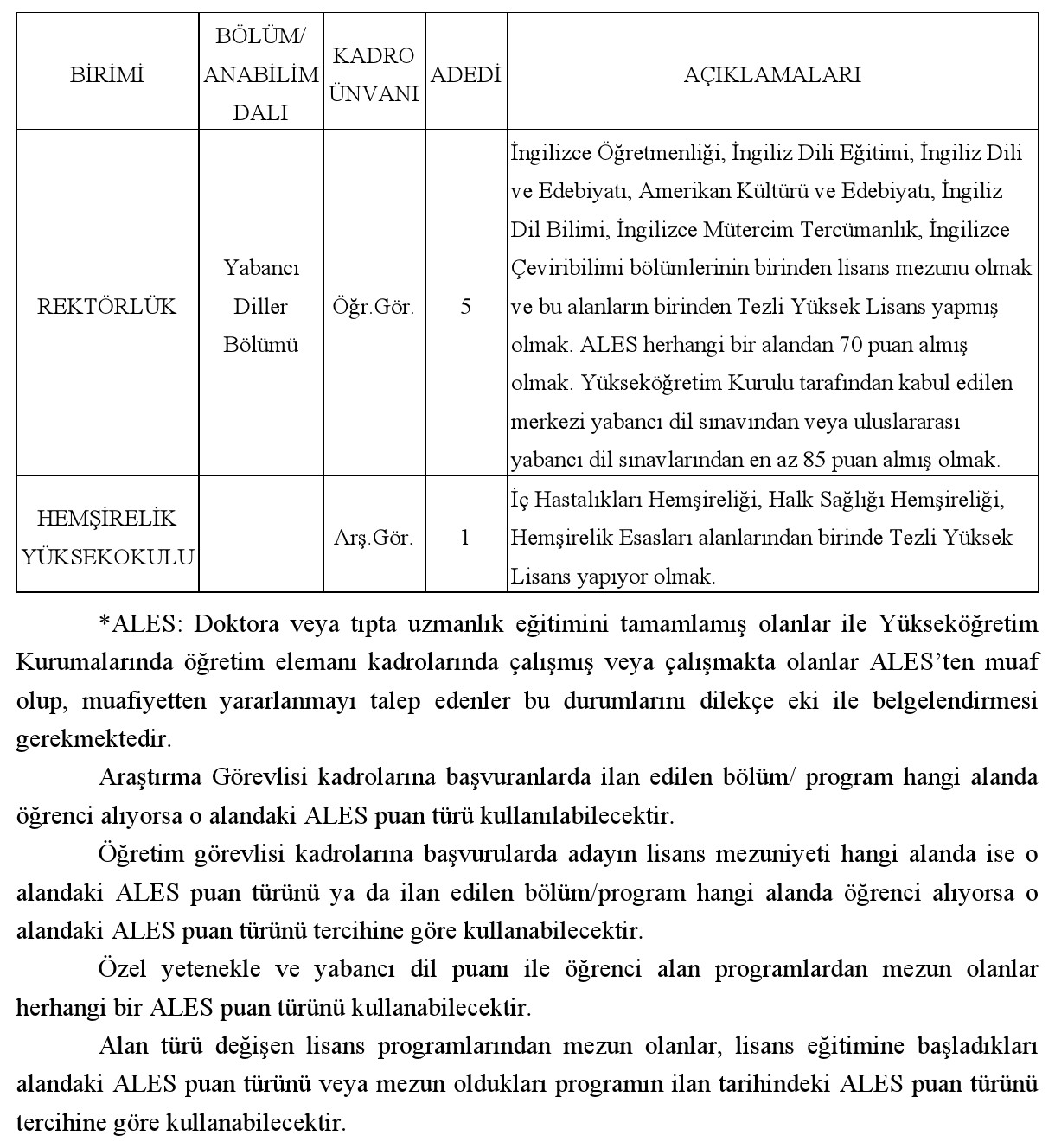 Üniversitemize 2547 sayılı Yükseköğretim Kanunu ve Öğretim Üyesi Dışındaki Öğretim Elemanı Kadrolarına Yapılacak Atamalarda Uygulanacak Merkezi Sınav ile Giriş Sınavına İlişkin Usul ve Esaslar Hakkında Yönetmelik öngörülen koşulları sağlamış olmak şartı ile (Aylık ve diğer hakları yönünden 4857 sayılı İş Kanunu hükümlerine tabi olmak üzere) daimi statüde görev almak üzere öğretim elemanı alınacaktır.