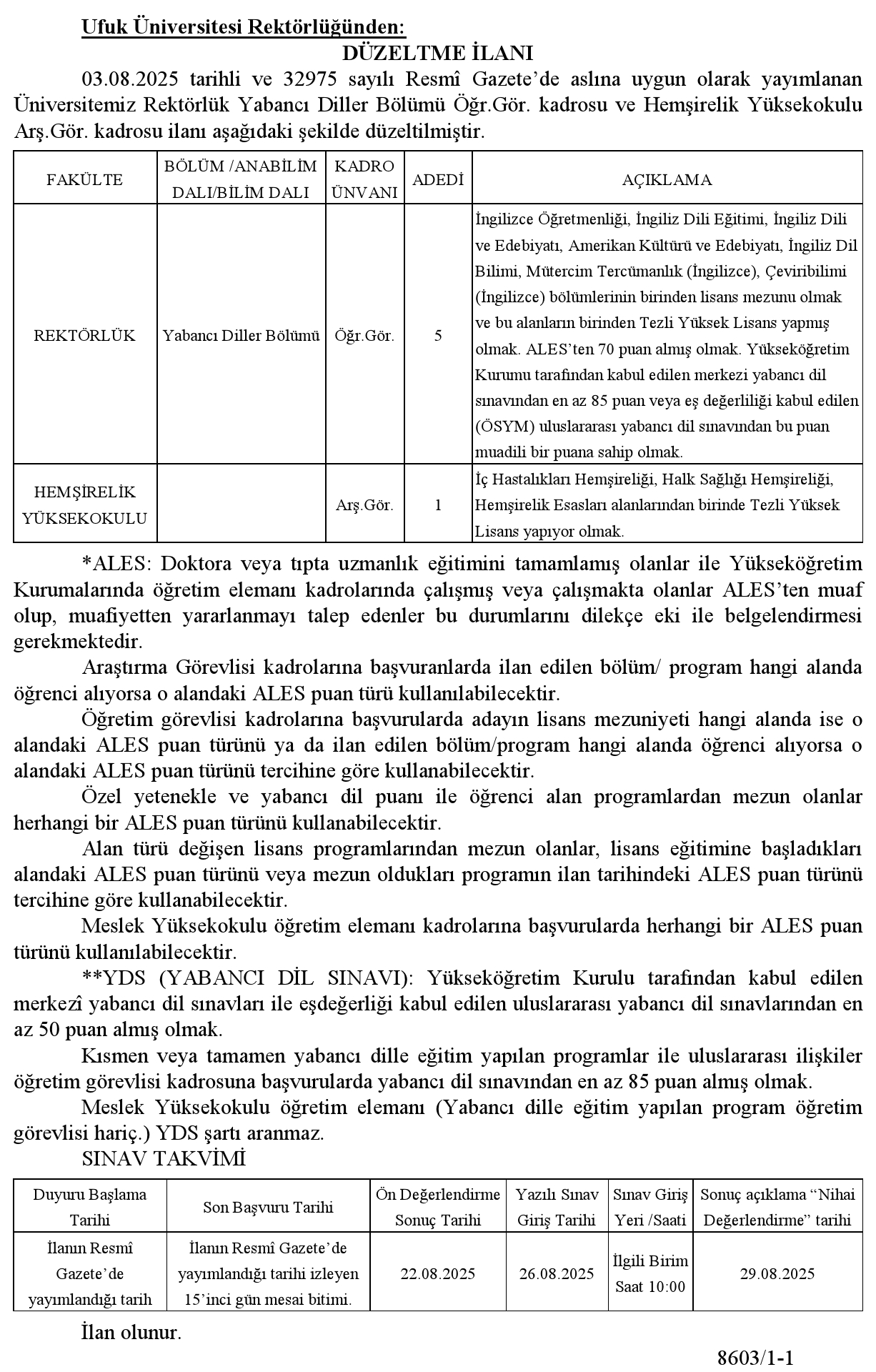 Ufuk Üniversitesi Öğretim Elemanı Alım İlanı. Son başvuru tarihi 17 ağustos 2025