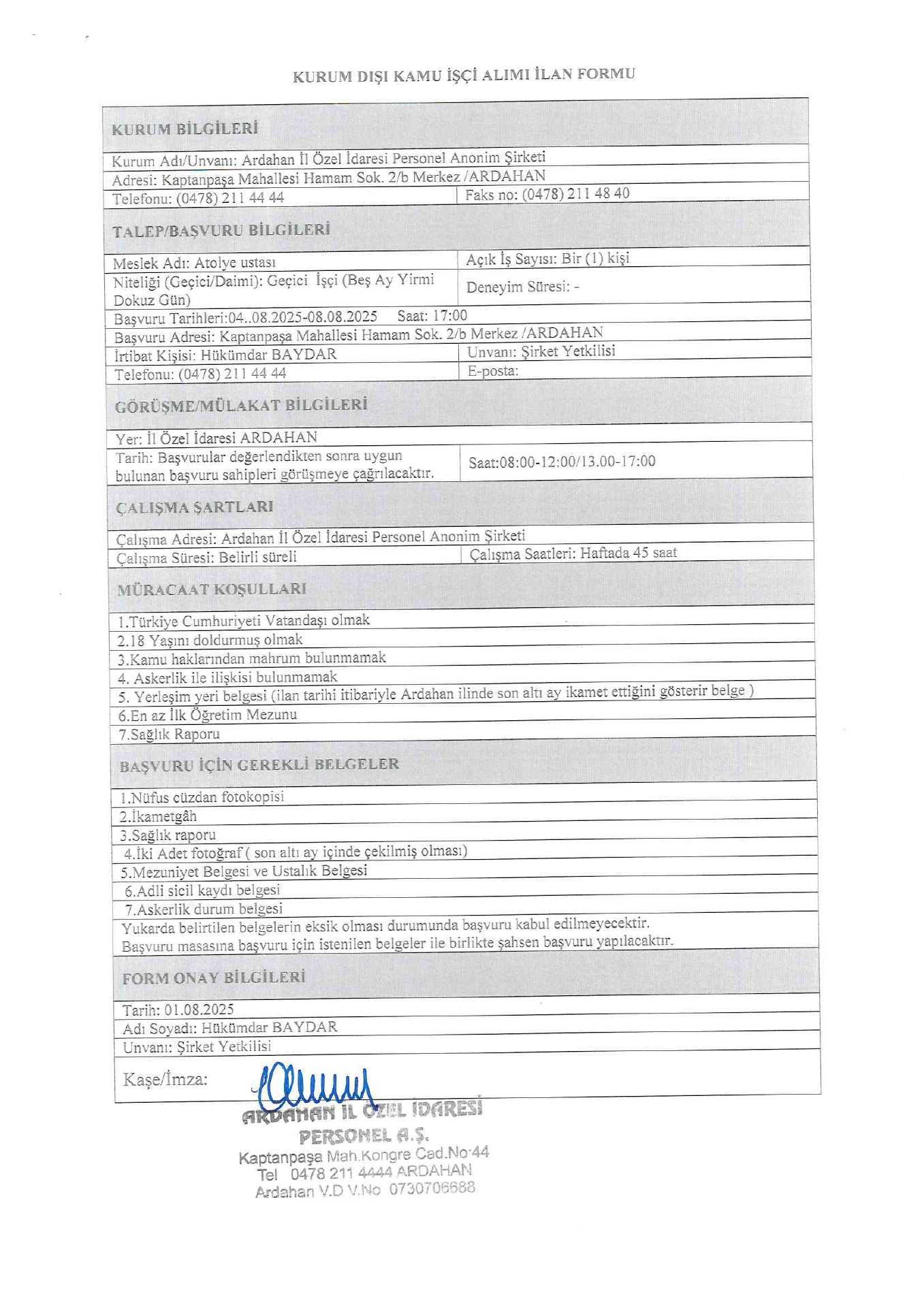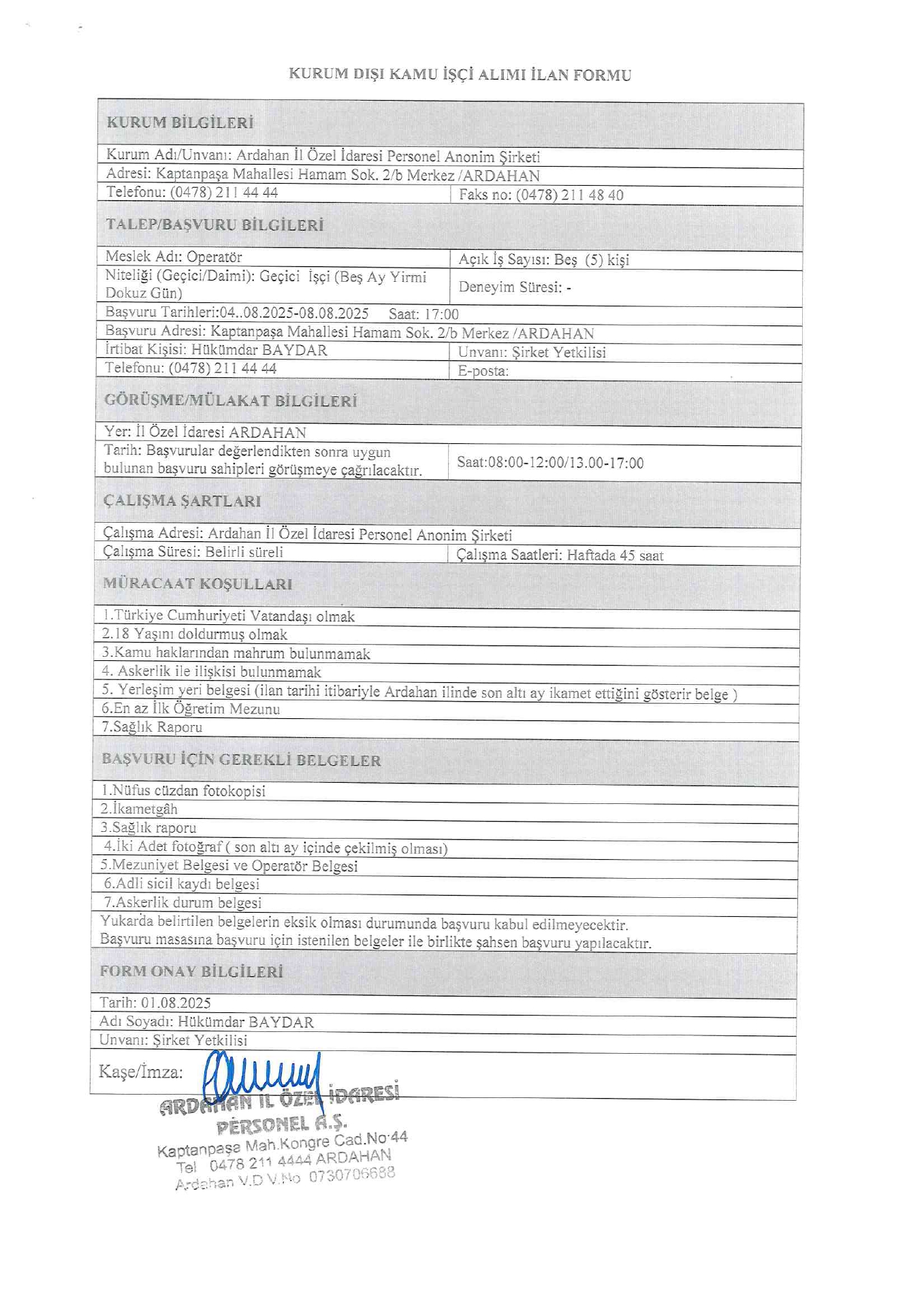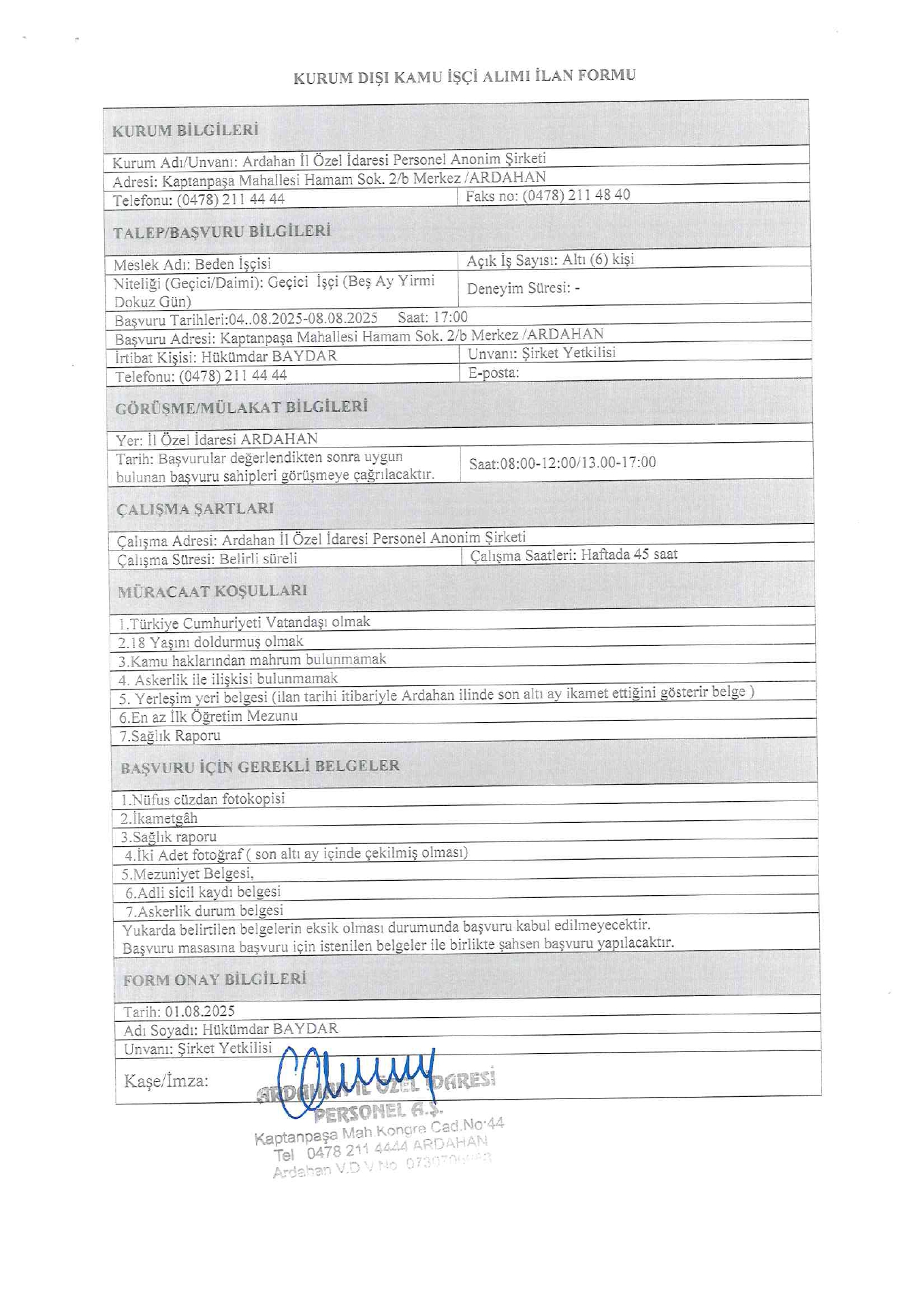 Ardahan İl Özel İdaresi Geçici 24 İşçi Alacak. Son başvuru tarihi 8 ağustos 2025