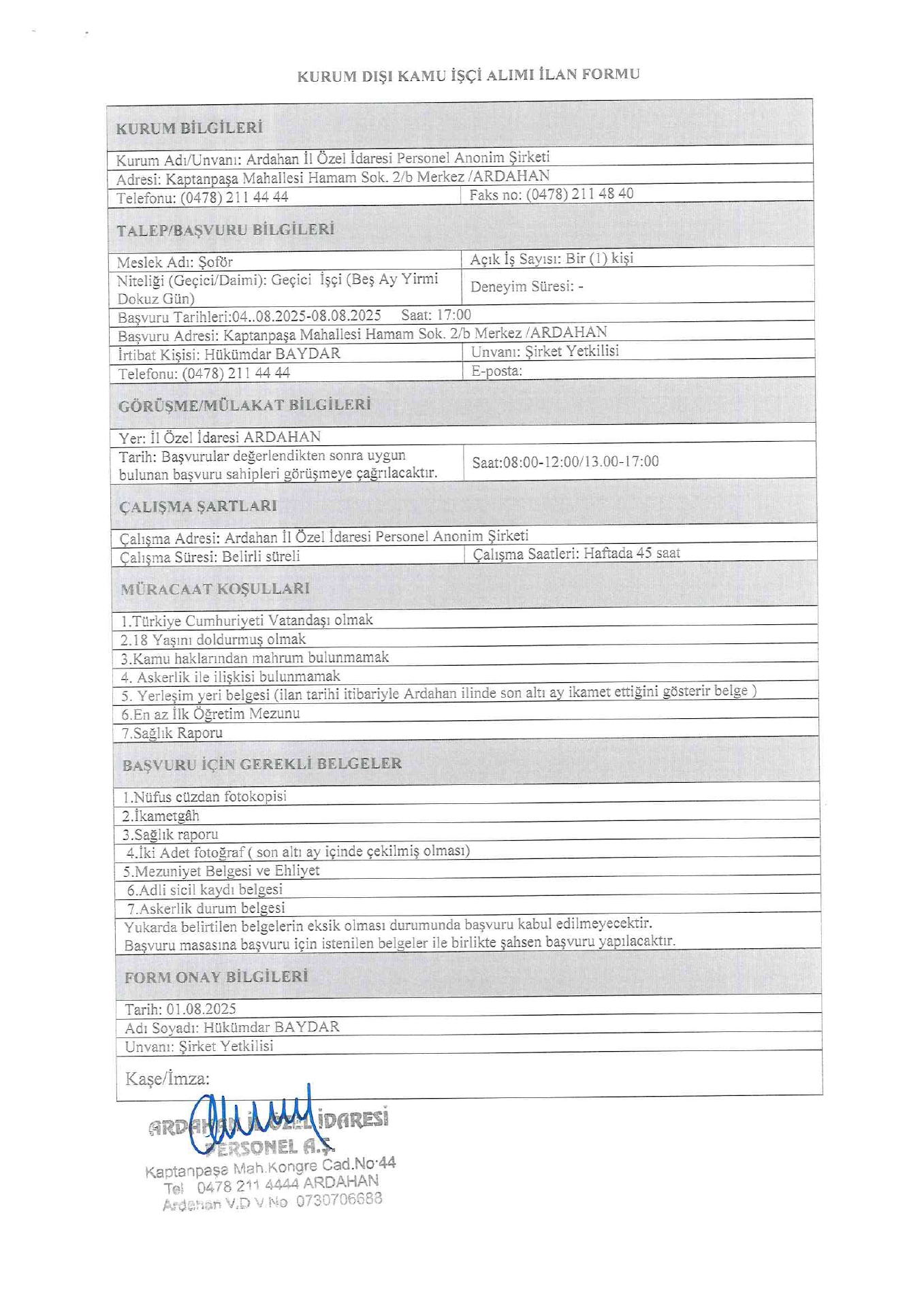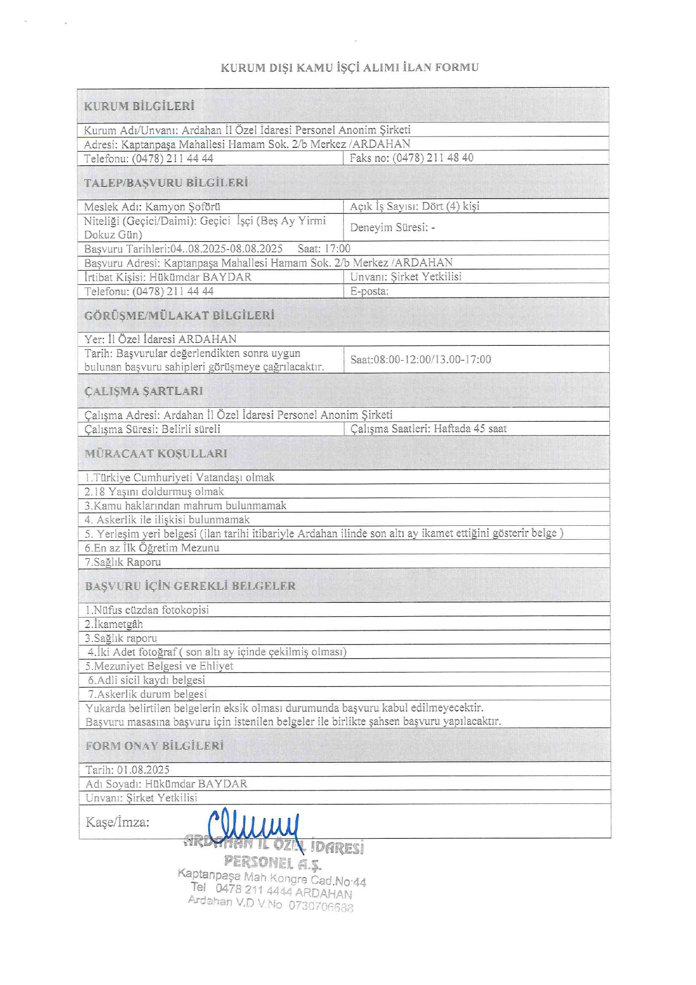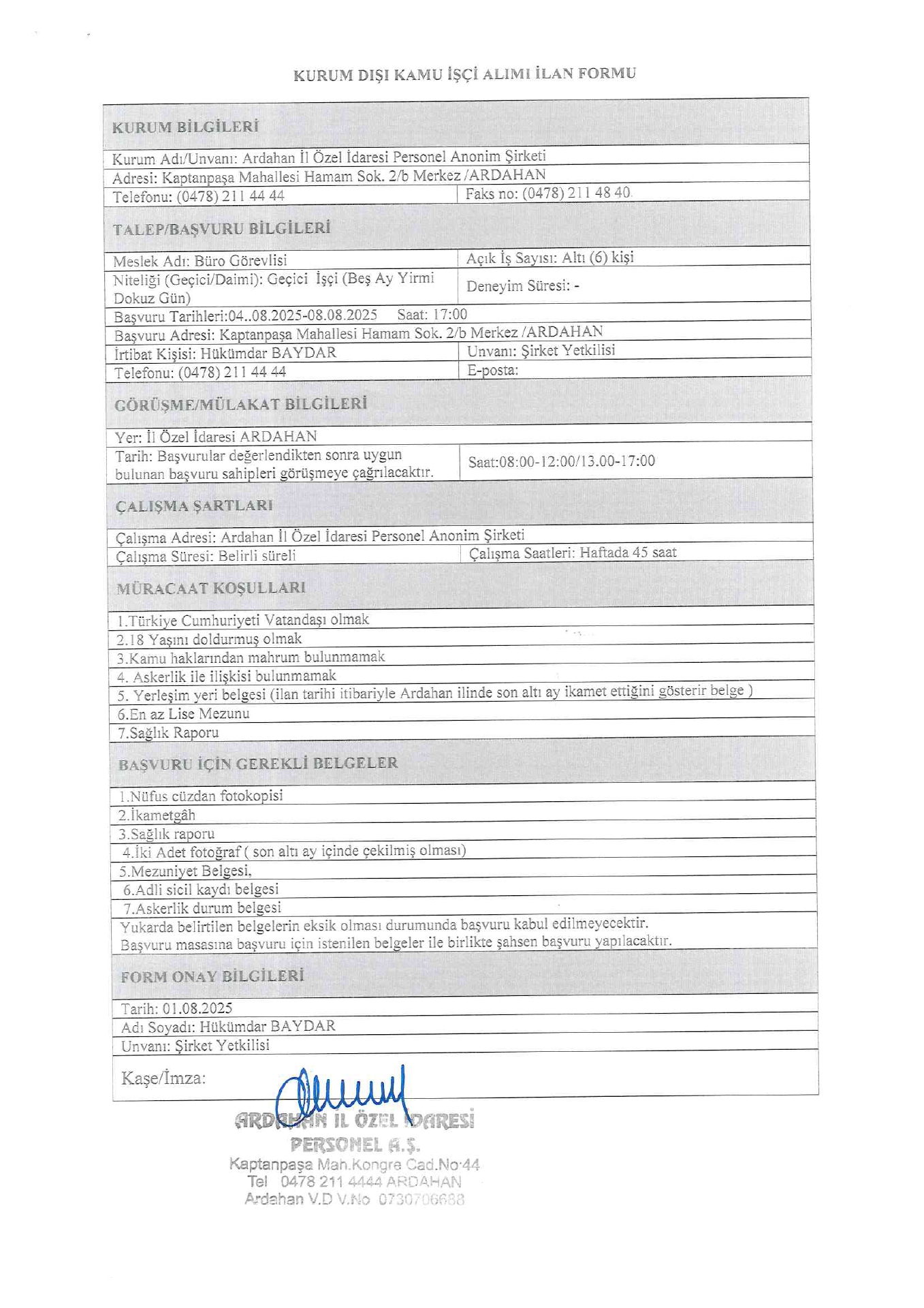 Ardahan İl Özel İdaresi Geçici 24 İşçi Alacak. Son başvuru tarihi 8 ağustos 2025