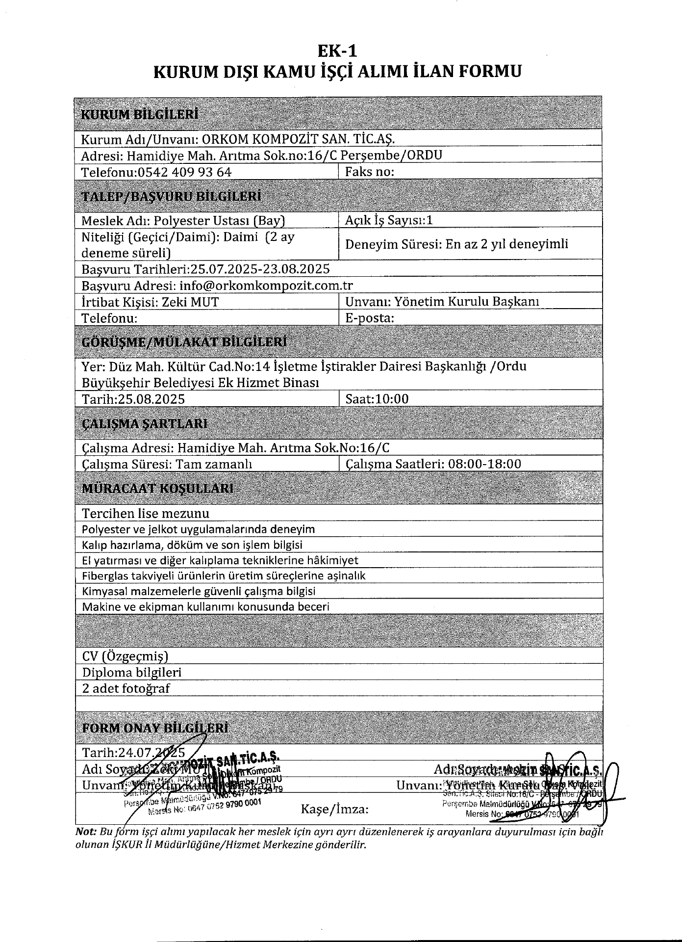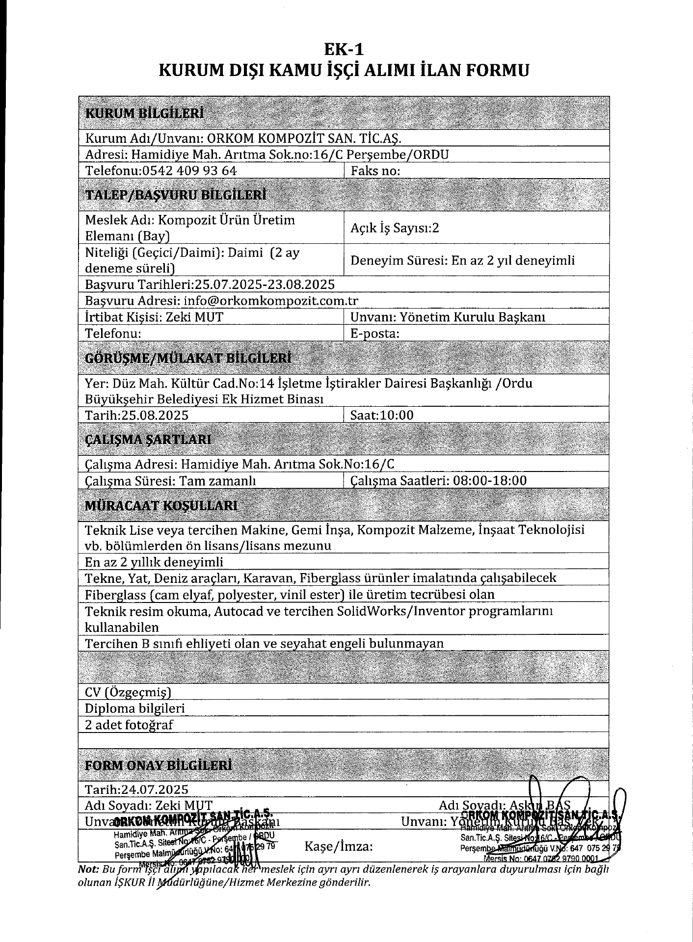 Ordu Orkom 3 İşçi Alacak. Son başvuru tarihi 23 ağustos 2025