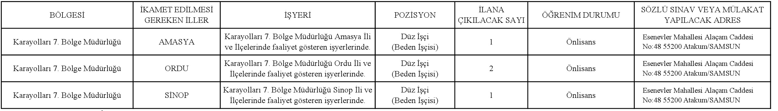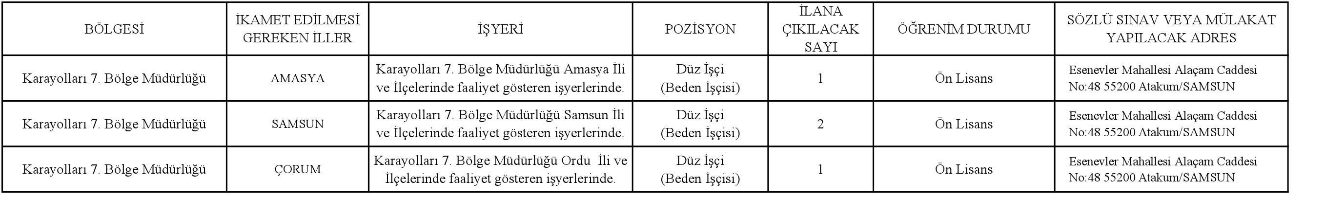 7.Ataması yapılacak adaylardan Tehlikeli ve Çok Tehlikeli İşlerde Çalışabilir Sağlık Raporu (Kurumumuzda yerleştirildiği görevi yapmasına engel akıl ve beden hastalığı bulunmadığına, seyahat etmesine, arazide ve vardiyalı çalışmaya uygun olduğuna dair ifadelerin yer alması gerekmektedir) istenecektir.(Sınavda başarılı olup atananlar Düz İşçi (Beden İşçisi) unvanlı işçi pozisyonunda çalıştırılacaktır.) 8.Adayların, başvurunun son günü itibarıyla ihtiyaç duyulan unvana uygun olarak talep edilen eğitim durumu ve özel şartlara haiz olması gerekmektedir.