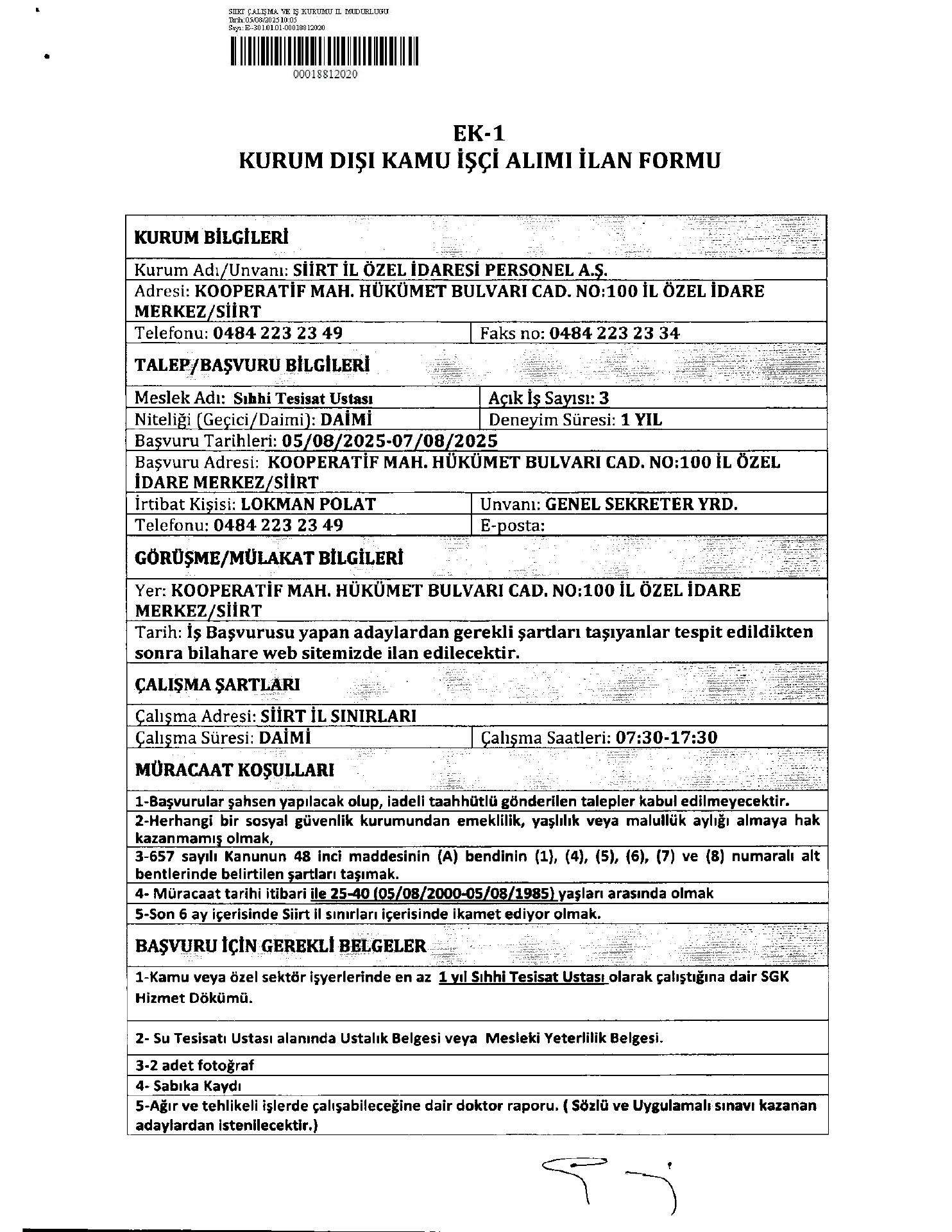 Siir İl Özel İdaresi 3 İşçi Alacak. Son başvuru tarihi 7 ağustos 2025