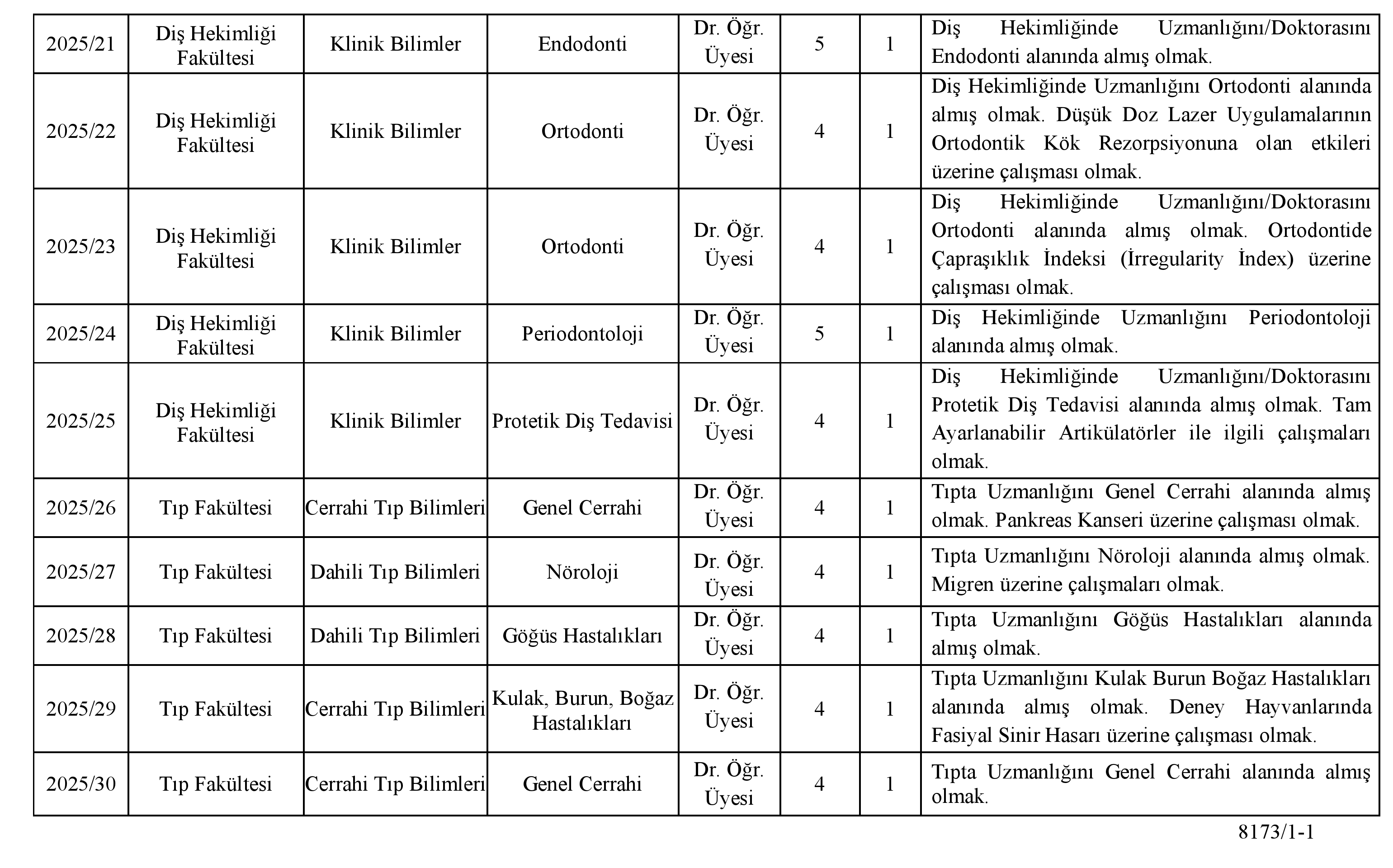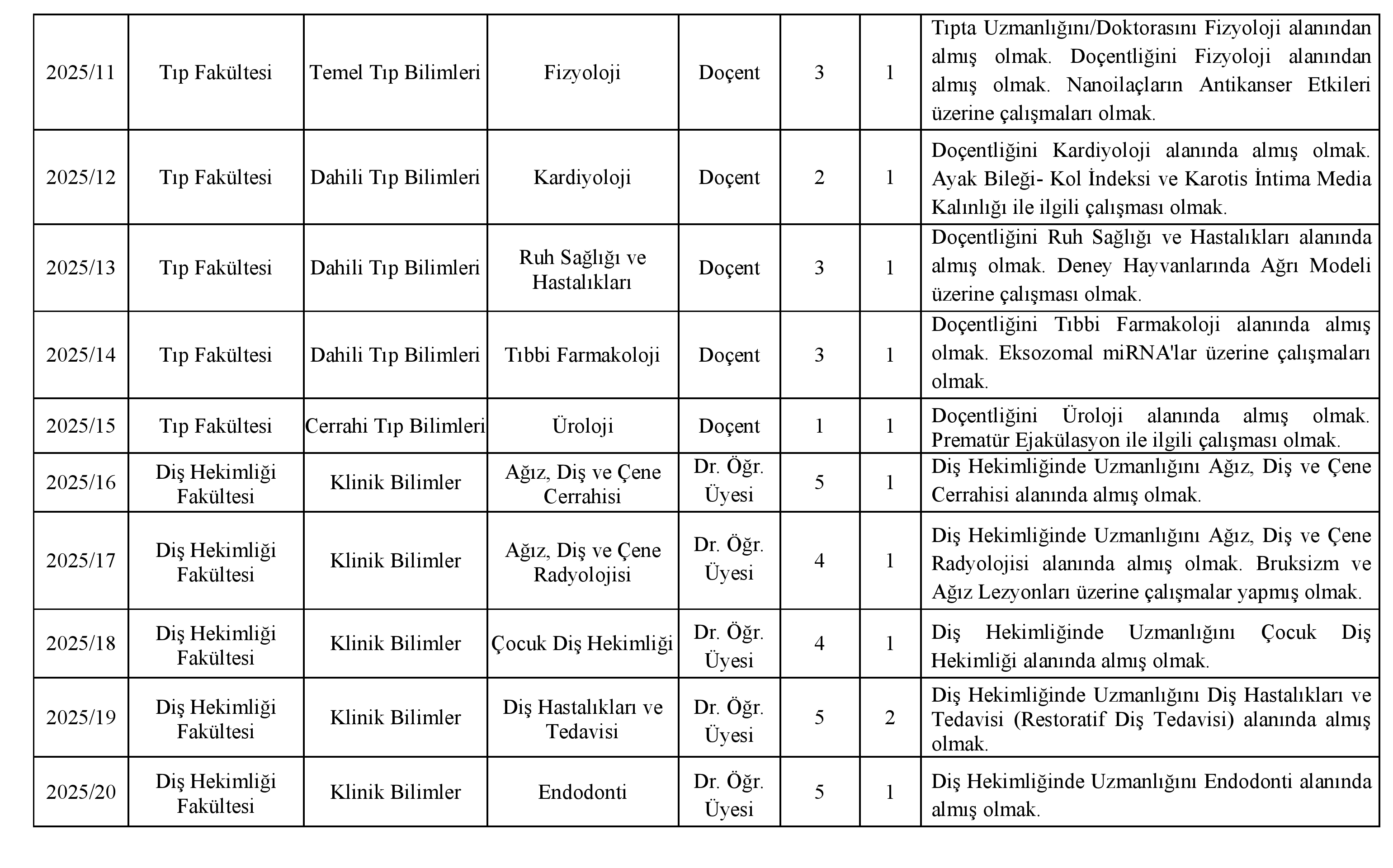 - Tıp ve Diş Hekimliği Fakültelerinin ilanlarında "Özel Şartlar" alanında, istenilmesi halinde, eğitim ve tecrübe durumlarının belgelendirilmesi gerekmektedir.
