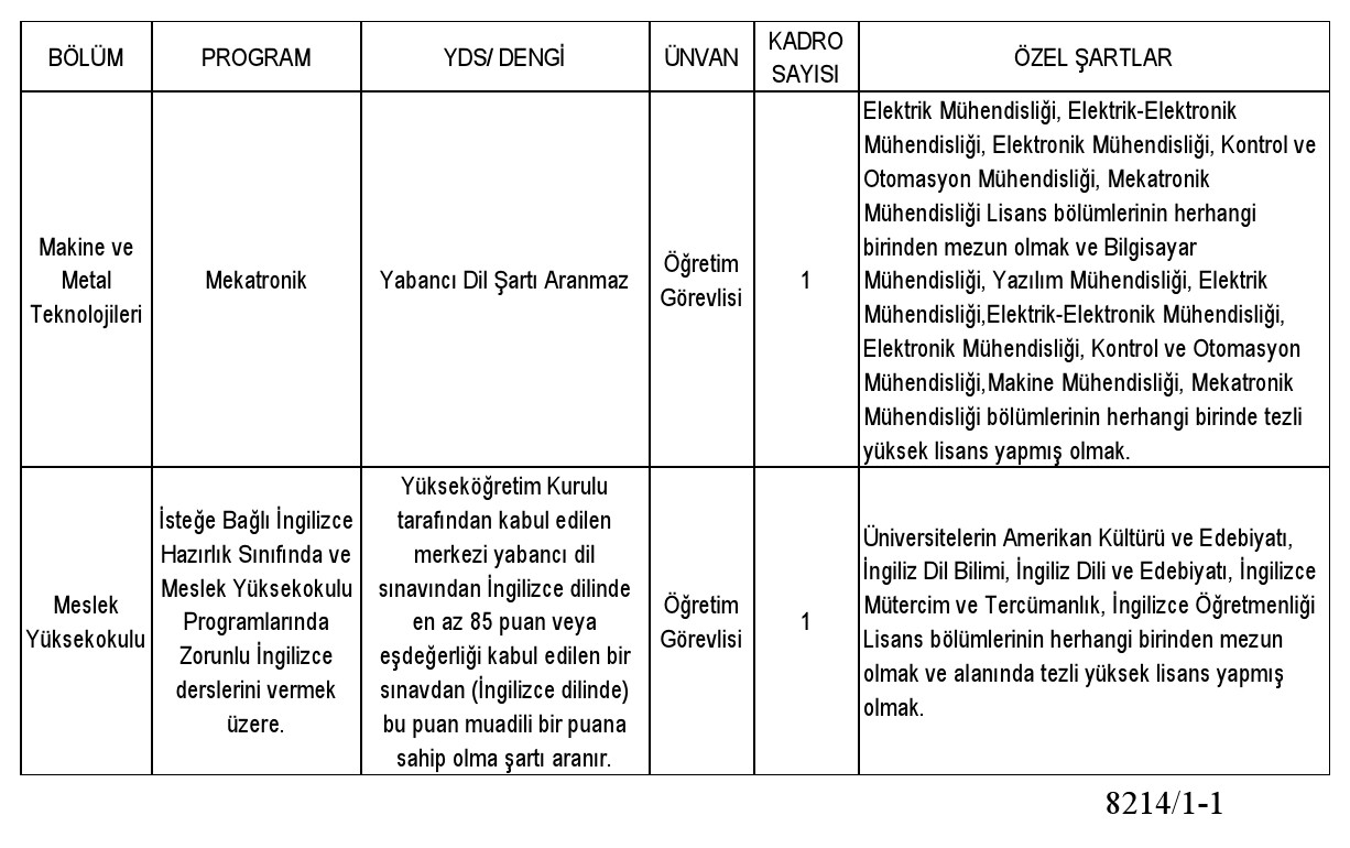 Meslek Yüksekokulumuzun aşağıda belirtilen programlarına 2547 sayılı Kanunun ve Öğretim Üyeliğine Yükseltilme ve Atanma Yönetmeliğinin ilgili maddeleri ile 09.11.2018 tarihli ve 30590 sayılı Resmi Gazete'de yayımlanarak yürürlüğe giren "Öğretim Üyesi Dışındaki Öğretim Elemanları Kadrolarına Yapılacak Atamalarda Uygulanacak Merkezi Sınav ile Giriş Sınavlarına İlişkin Usul ve esaslar Hakkında Yönetmeliğin" ilgili maddeleri uyarınca Öğretim Görevlisi alınacaktır. Adayların 657 sayılı Kanunun 48 inci maddesinde belirtilen şartları taşıması gerekmektedir.