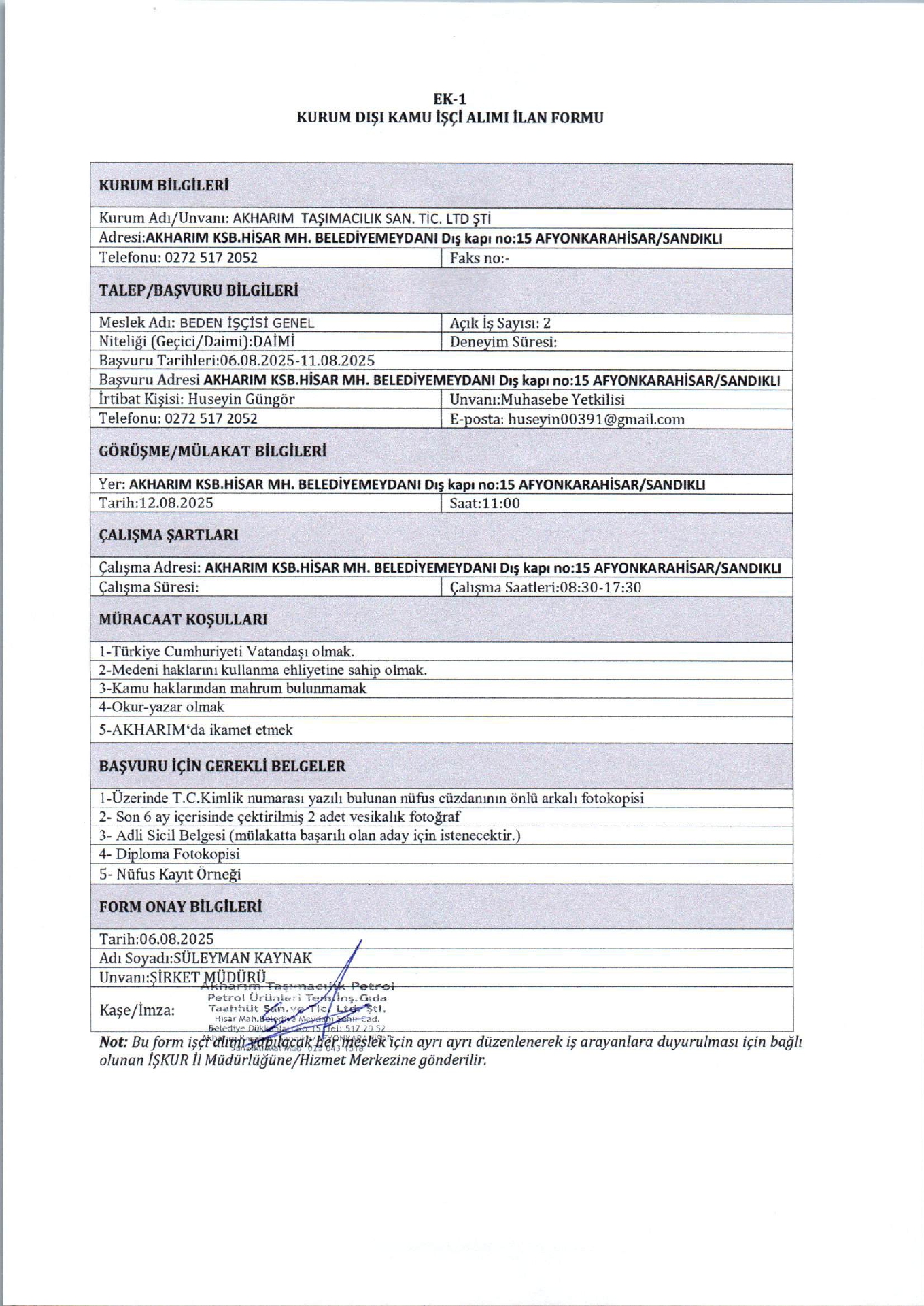 Afyonkarahisar Akharım Taşımacılık 2 İşçi Alacak. Son başuru tarihi 11 ağustos 2025