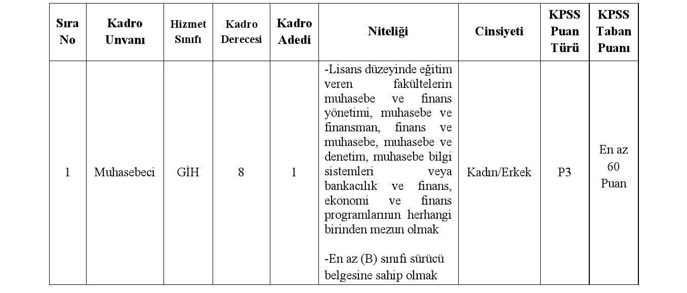 Bartın ili Amasra Belediye Başkanlığı bünyesinde, 657 sayılı Devlet Memurları Kanununa tabi olarak istihdam edilmek üzere; Mahalli İdarelere İlk Defa Atanacaklara Dair Sınav ve Atama Yönetmeliği hükümlerine göre aşağıda unvanı, sınıfı, derecesi, adedi, nitelikleri, KPSS puan türü, KPSS taban puanı ve diğer şartları taşımak kaydıyla belirtilen boş kadrolara açıktan atama yoluyla memur alınacaktır.