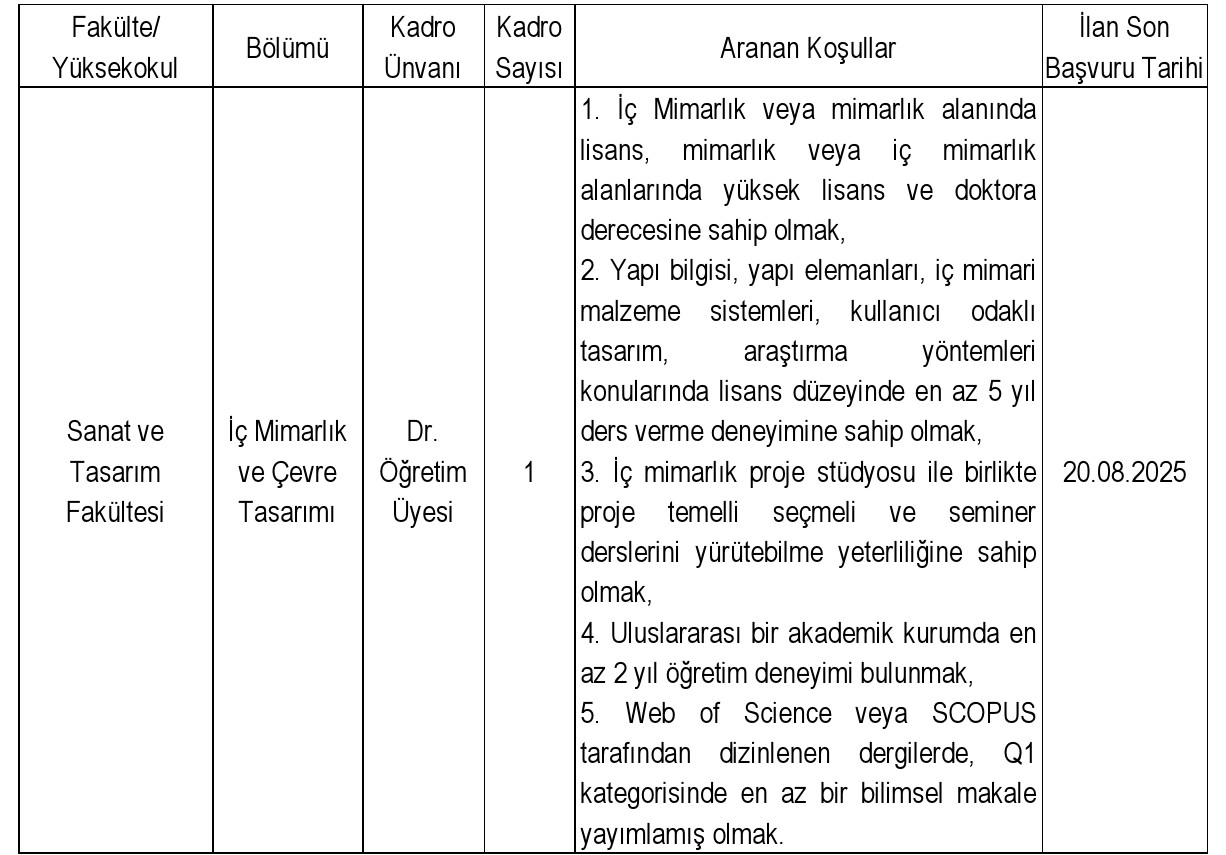 Üniversitemiz Sanat ve Tasarım Fakültesi, İç Mimarlık ve Çevre Tasarımı Bölümü Öğretim Üyesi kadrosuna 2547 sayılı Kanun ile "Öğretim Üyeliğine Yükseltilme ve Atanma Yönetmeliği" nde öngörülen koşullara ek olarak, Üniversitemiz web sayfasında yayınlanan KHAS Akademik Personel İstihdam Yönergesi'nde belirtilen kriterleri sağlamak kaydı ile aylık ve özlük hakları yönünden 4857 sayılı İş Kanunu hükümlerine tabi olarak "Öğretim Üyesi" alınacaktır. İlana konu olan kadro tam zamanlıdır.