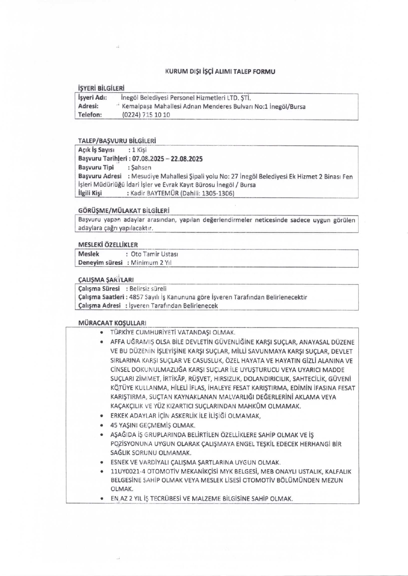Bursa İnegöl Belediyesi 1 İşçi Alacak. Son başvuru tarihi 22 ağustos 2025
