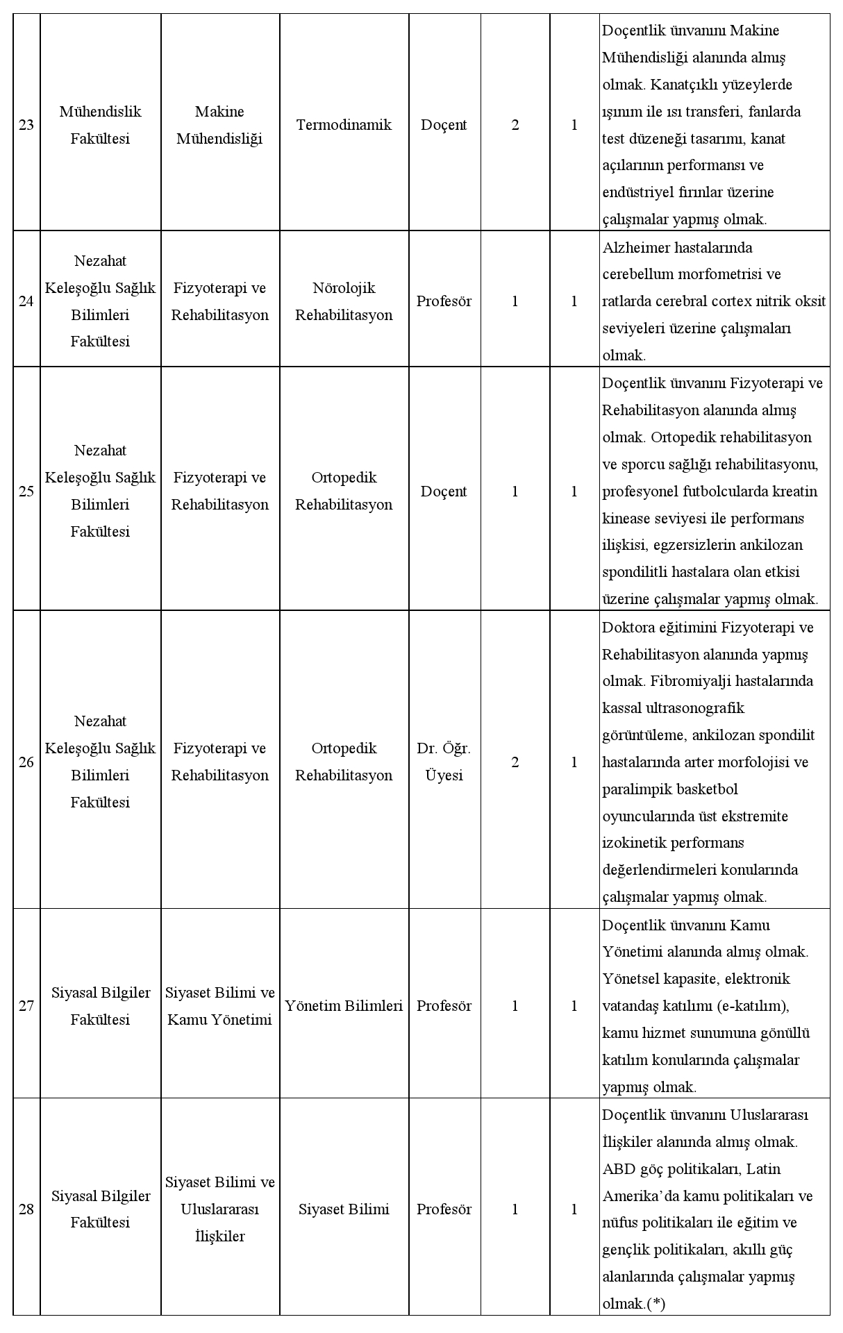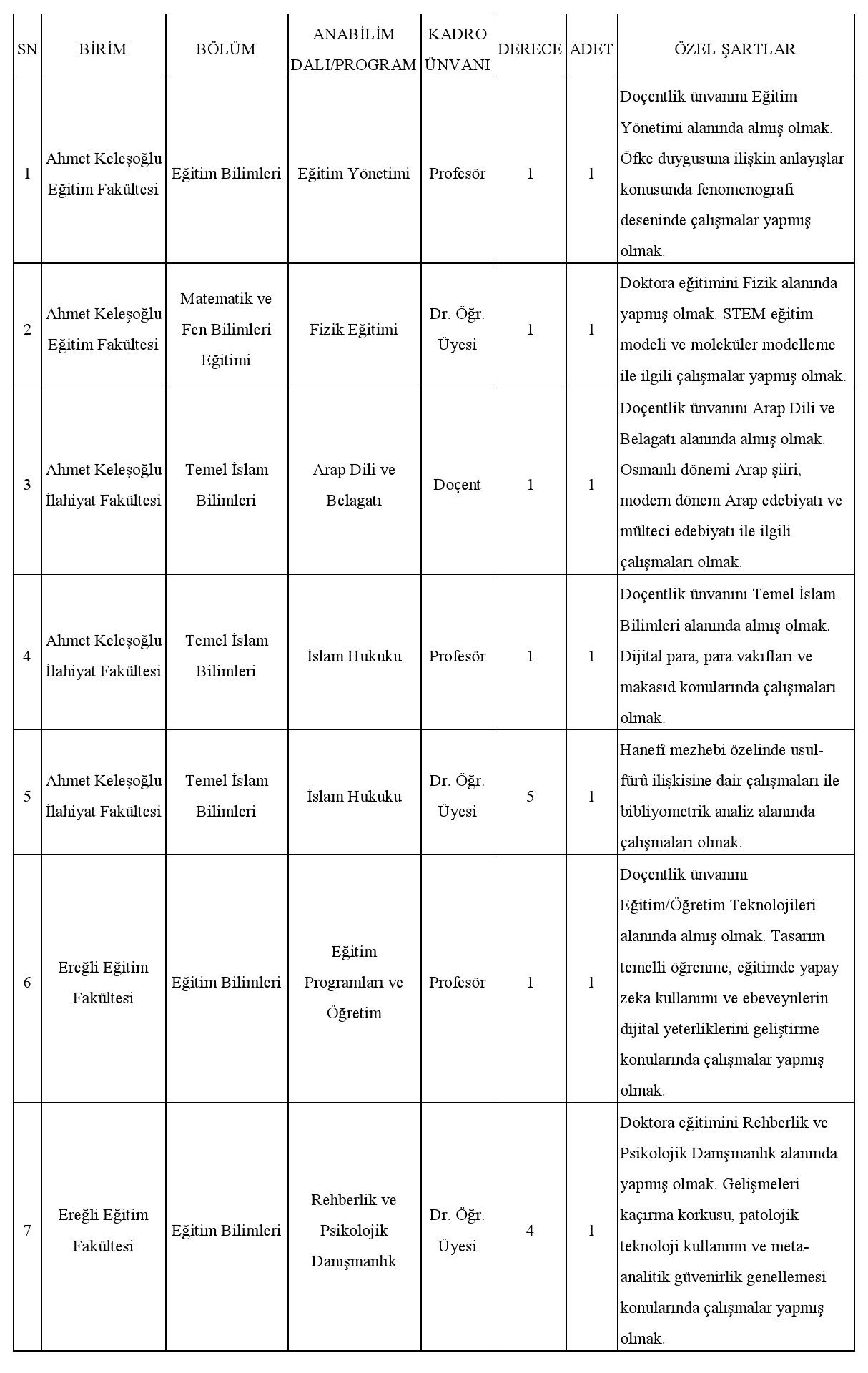 Üniversitemizin aşağıda belirtilen birimlerinde boş bulunan kadrolarına 2547 sayılı Yükseköğretim Kanunu ve Öğretim Üyeliğine Yükseltilme ve Atanma Yönetmeliği'nin ilgili maddeleri ile Üniversitemiz Öğretim Üyeliğine Yükseltilme ve Atanma Yönergesi'nde belirtilen kriterler doğrultusunda öğretim üyesi alınacaktır. İlana başvuracak adayların 657 sayılı Devlet Memurları Kanunu'nun 48. maddesindeki genel şartları, ilanda belirtilen özel şartları taşımaları gerekmektedir. Adaylar; http://www.erbakan.edu.tr internet adresinden erişebilecekleri Üniversitemiz Öğretim Üyeliğine Yükseltilme ve Atanma Yönergesi'ne göre hazırlayacakları puan tablolarını dosyalarına eklemelidir.