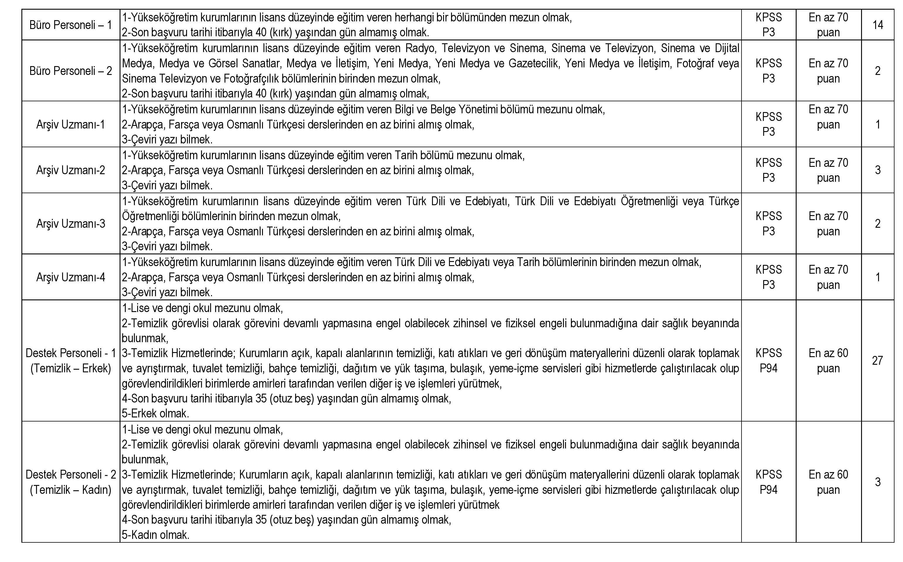 b) Arşiv Uzmanı (1), Arşiv Uzmanı (2), Arşiv Uzmanı (3), Arşiv Uzmanı (4), Kütüphaneci, Büro Personeli (1), Büro Personeli (2), Mühendis (1), Mühendis (2), Mühendis (3), Mühendis (4) ve Mühendis (5) ünvanlı pozisyonlara başvuracaklar için lisans düzeyinde 2024 KPSS (B) grubu sınavına girmiş olmak. Sıralamada 2024 KPSSP3 puanı esas alınacaktır.