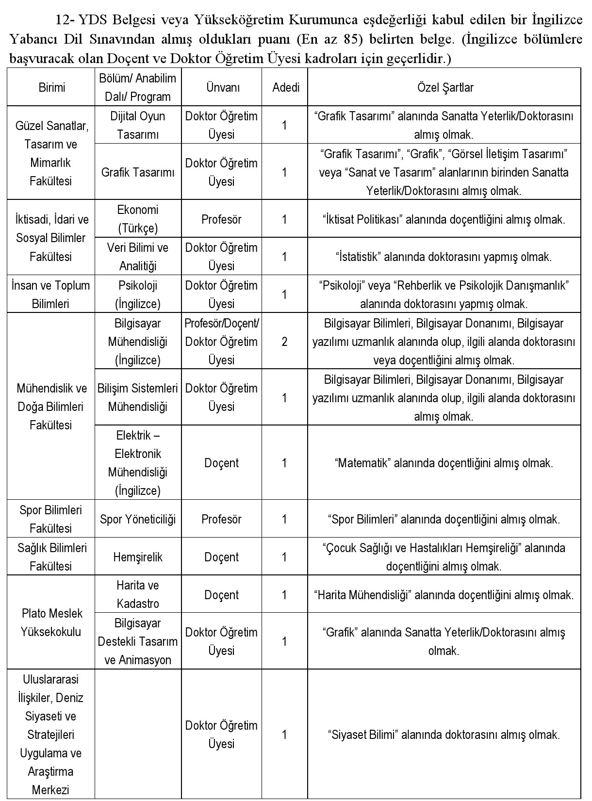 12- YDS Belgesi veya Yükseköğretim Kurumunca eşdeğerliği kabul edilen bir İngilizce Yabancı Dil Sınavından almış oldukları puanı (En az 85) belirten belge. (İngilizce bölümlere başvuracak olan Doçent ve Doktor Öğretim Üyesi kadroları için geçerlidir.)