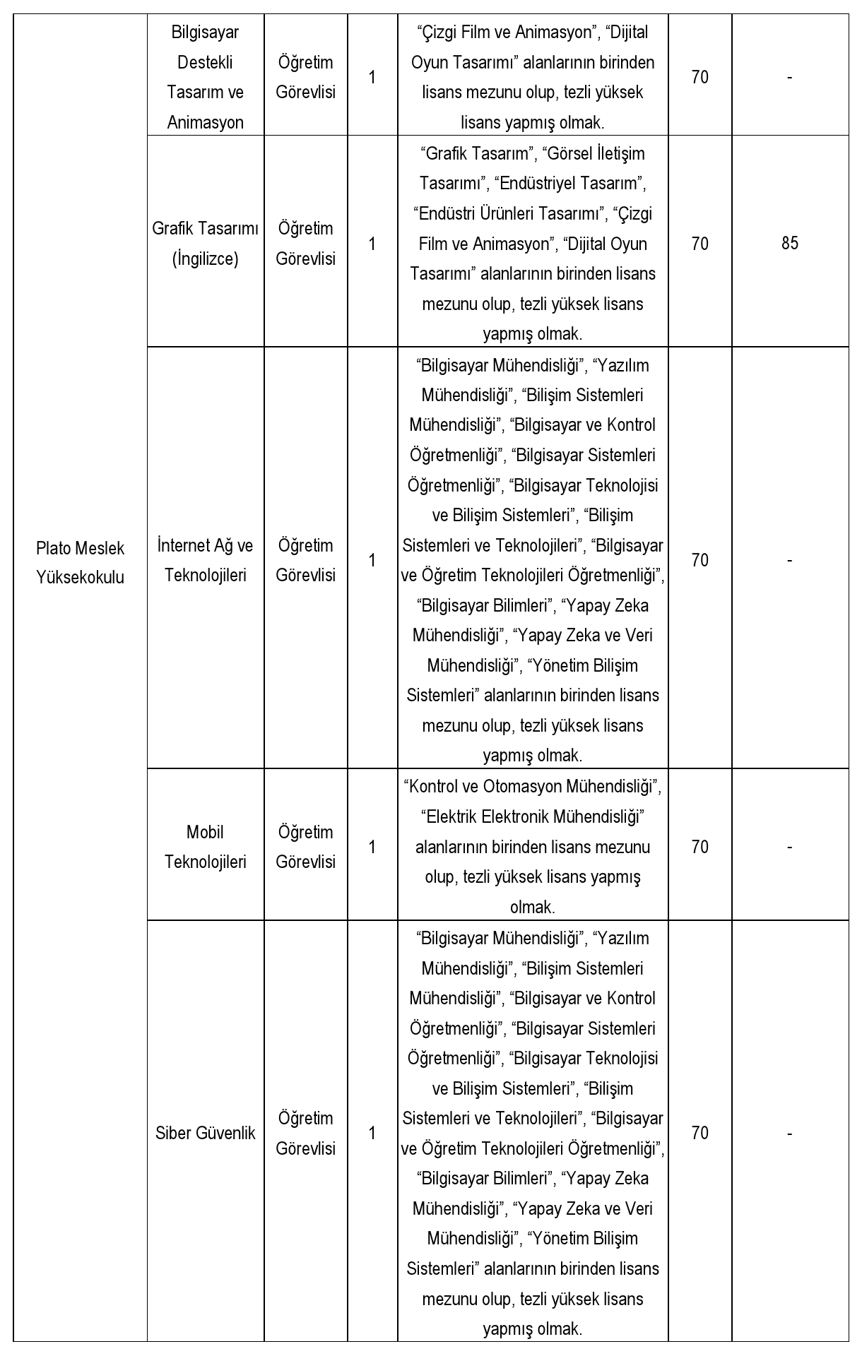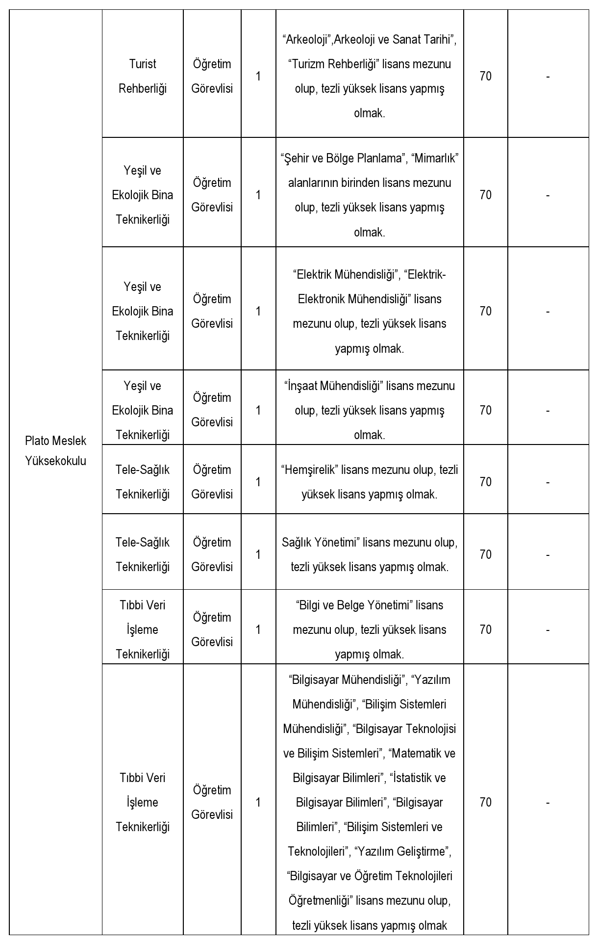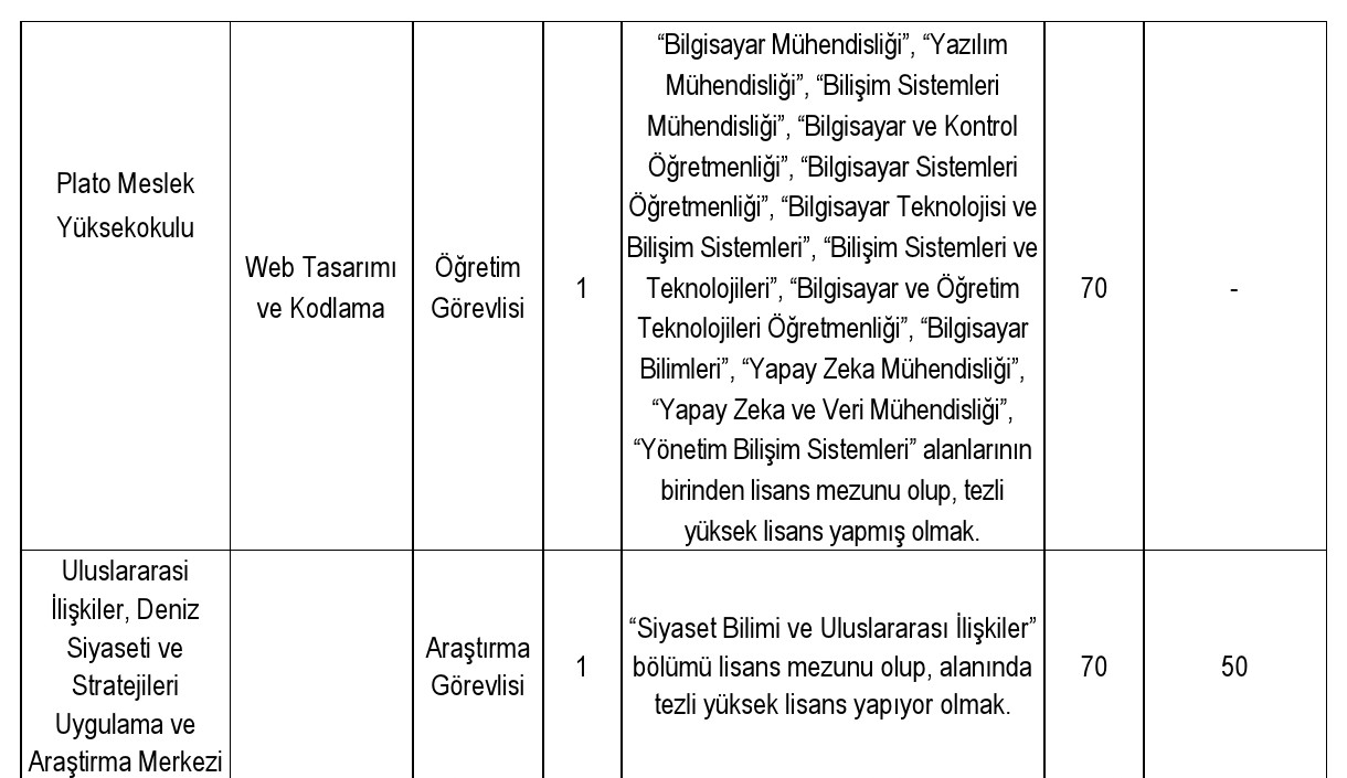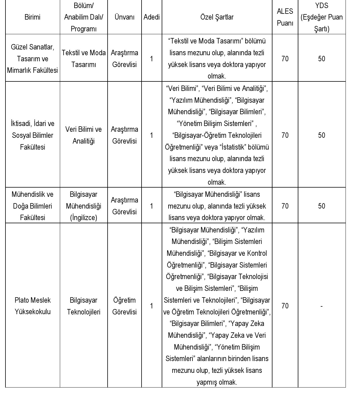Üniversitemizin aşağıda belirtilen birimlerine 2547 sayılı Yükseköğretim Kanununun ilgili maddeleri ile 09/11/2018 tarih ve 30590 sayılı Resmi Gazete'de yayımlanan "Öğretim Üyesi Dışındaki Öğretim Elemanı Kadrolarına Yapılacak Atamalarda Uygulanacak Merkezi Sınav ile Giriş Sınavlarına İlişkin Usul ve Esaslar Hakkında Yönetmelik" hükümleri uyarınca aylık ve özlük hakları yönünden 4857 sayılı İş Kanunu hükümlerine tabi tam zamanlı Öğretim Görevlisi ve Araştırma Görevlisi alınacaktır.