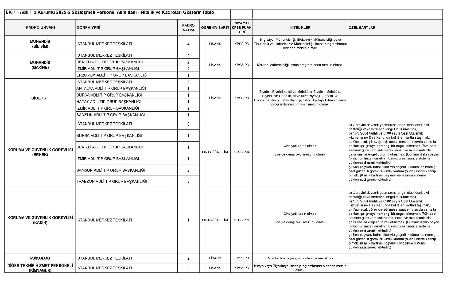 1) Adli Tıp Kurumu Merkez ve Taşra Teşkilatında 6/6/1978 tarihli ve 7/15754 sayılı Bakanlar Kurulu Kararıyla yürürlüğe giren "Sözleşmeli Personel Çalıştırılmasına İlişkin Esaslar"a göre, 657 sayılı Devlet Memurları Kanunu'nun 4/B maddesi uyarınca sözleşmeli personel statüsünde istihdam edilmek üzere;