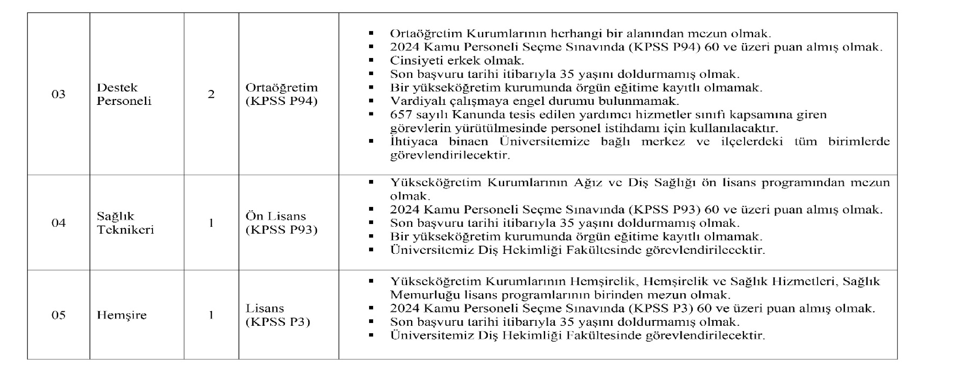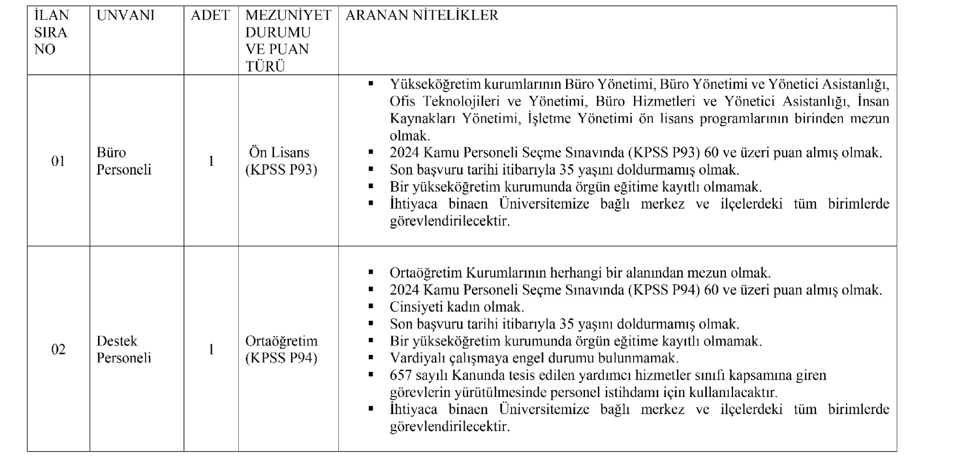 Üniversitemiz birimlerinde 657 sayılı Devlet Memurları Kanunu'nun 4'üncü maddesinin (B) fıkrası uyarınca istihdam edilmek üzere, 06.06.1978 tarihli ve 7/15754 sayılı Bakanlar Kurulu Kararı ile yürürlüğe konulan "Sözleşmeli Personel Çalıştırılmasına İlişkin Esaslar"da yer alan Ek 2 nci maddenin (b) fıkrası gereğince "Yazılı ve/veya sözlü sınav yapılmaksızın, KPSS (B) grubu puan sıralaması esas alınmak suretiyle" 6 (altı) adet sözleşmeli personel alınacaktır.