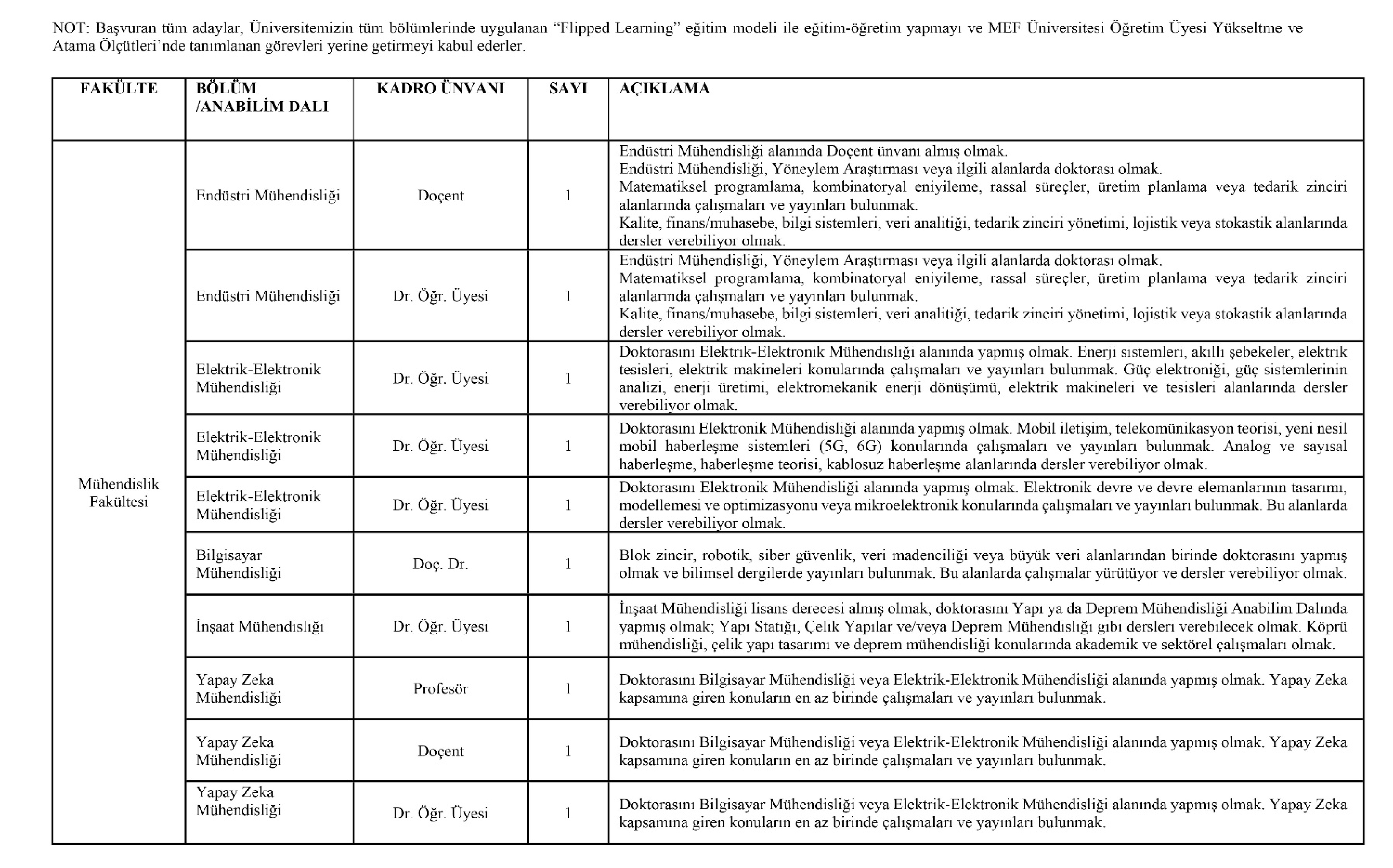 NOT: Başvuran tüm adaylar, Üniversitemizin tüm bölümlerinde uygulanan "Flipped Learning" eğitim modeli ile eğitim-öğretim yapmayı ve MEF Üniversitesi Öğretim Üyesi Yükseltme ve Atama Ölçütleri'nde tanımlanan görevleri yerine getirmeyi kabul ederler.
