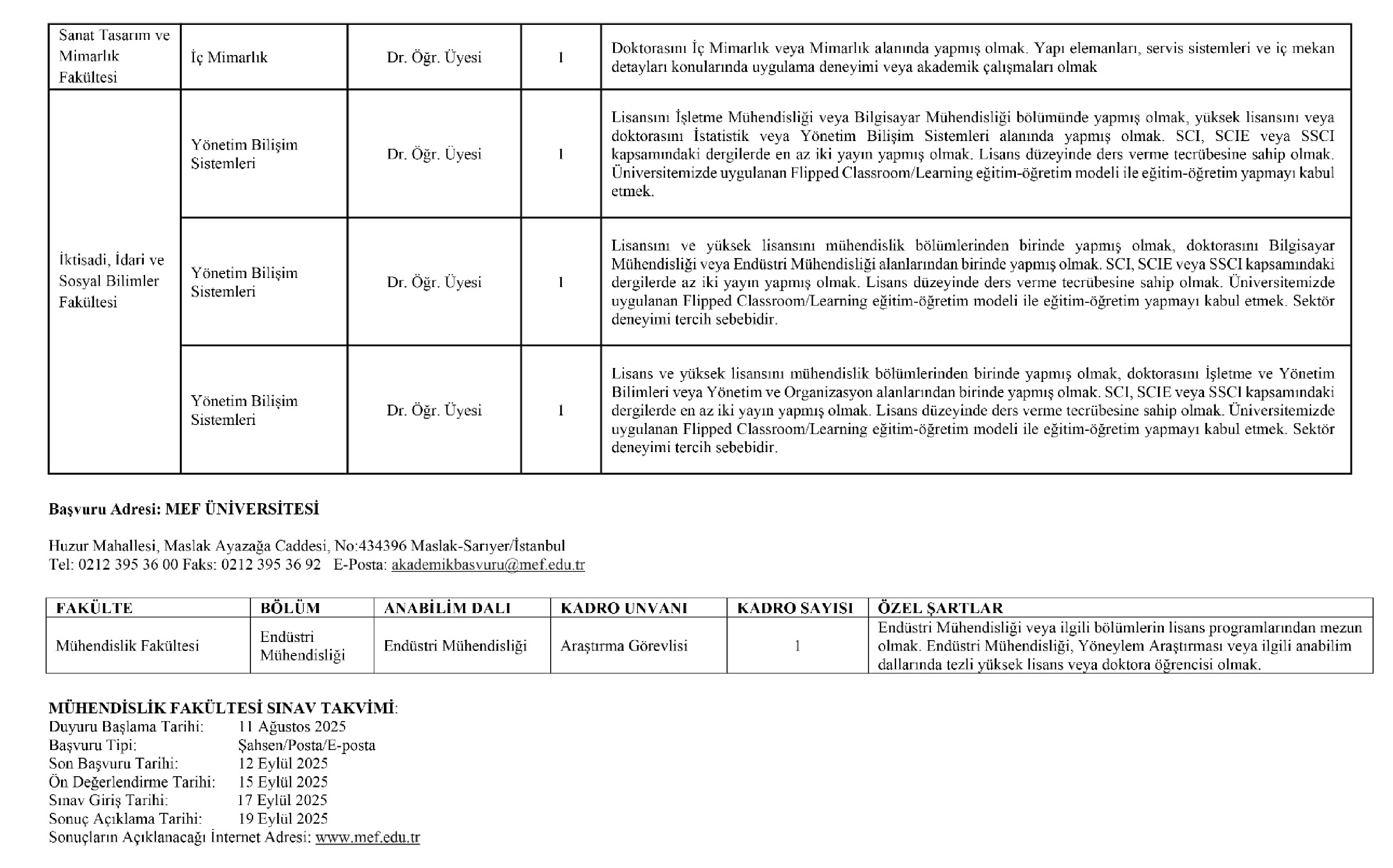 MEF Üniversitesi Öğretim Üyesi ve Elemanı Alım İlanı. Son başvuru tarihi 25 ağustos 2025