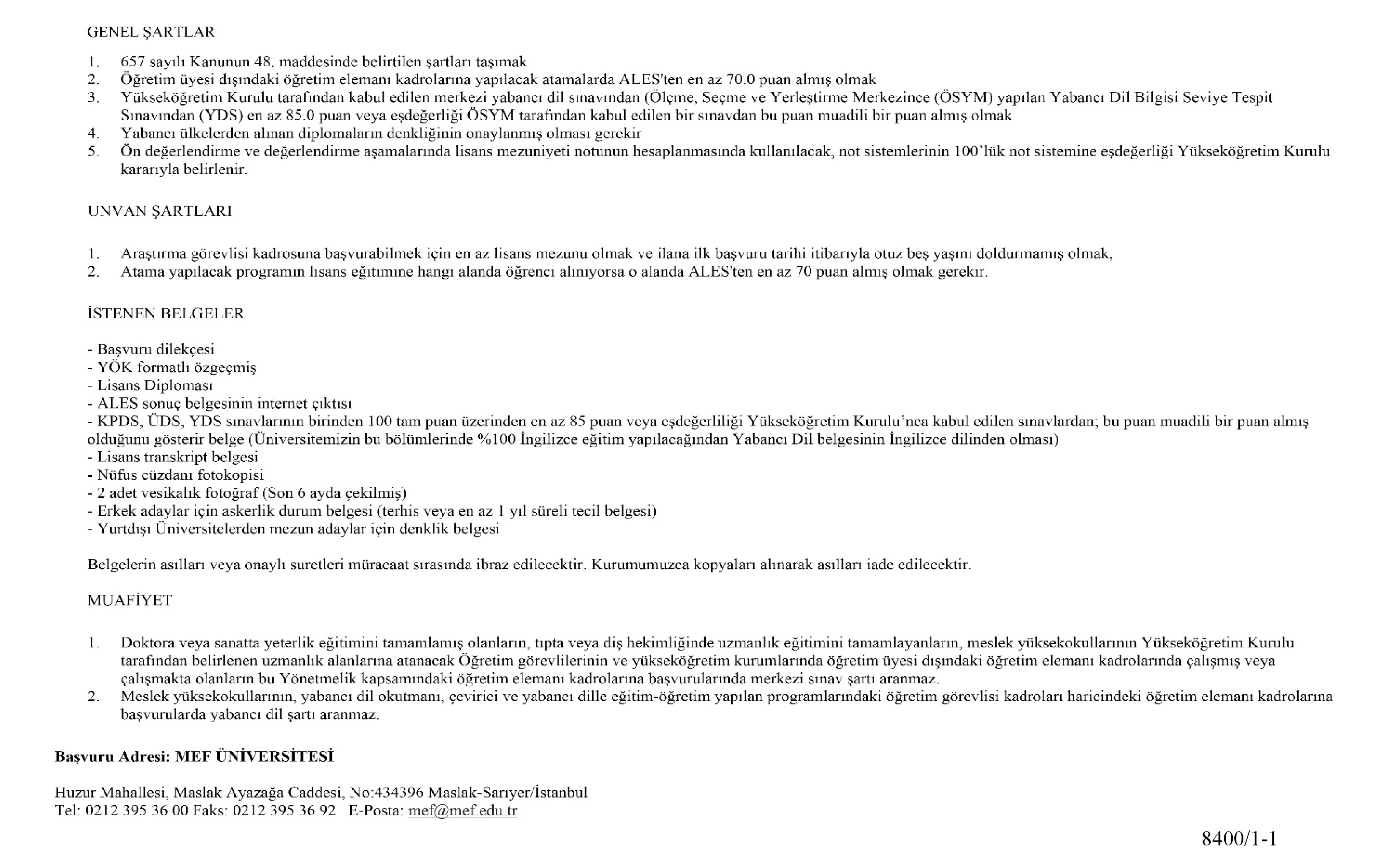 MEF Üniversitesi Öğretim Üyesi ve Elemanı Alım İlanı