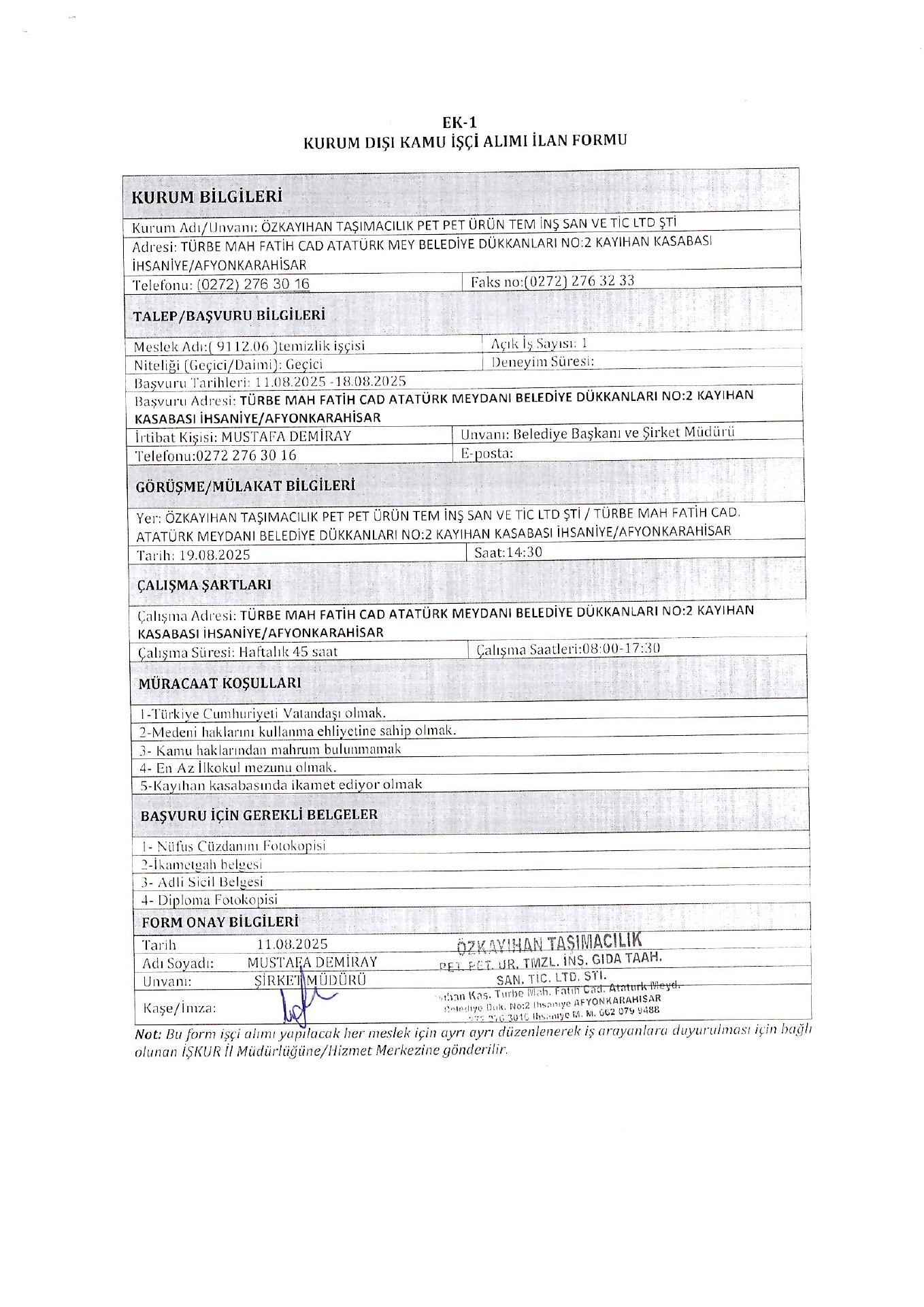Afyonkarahisar Özkayıhan Taşımacılık Geçici 1 İşçi Alacak. Son başvuru tarihi 18 ağıstos 2025