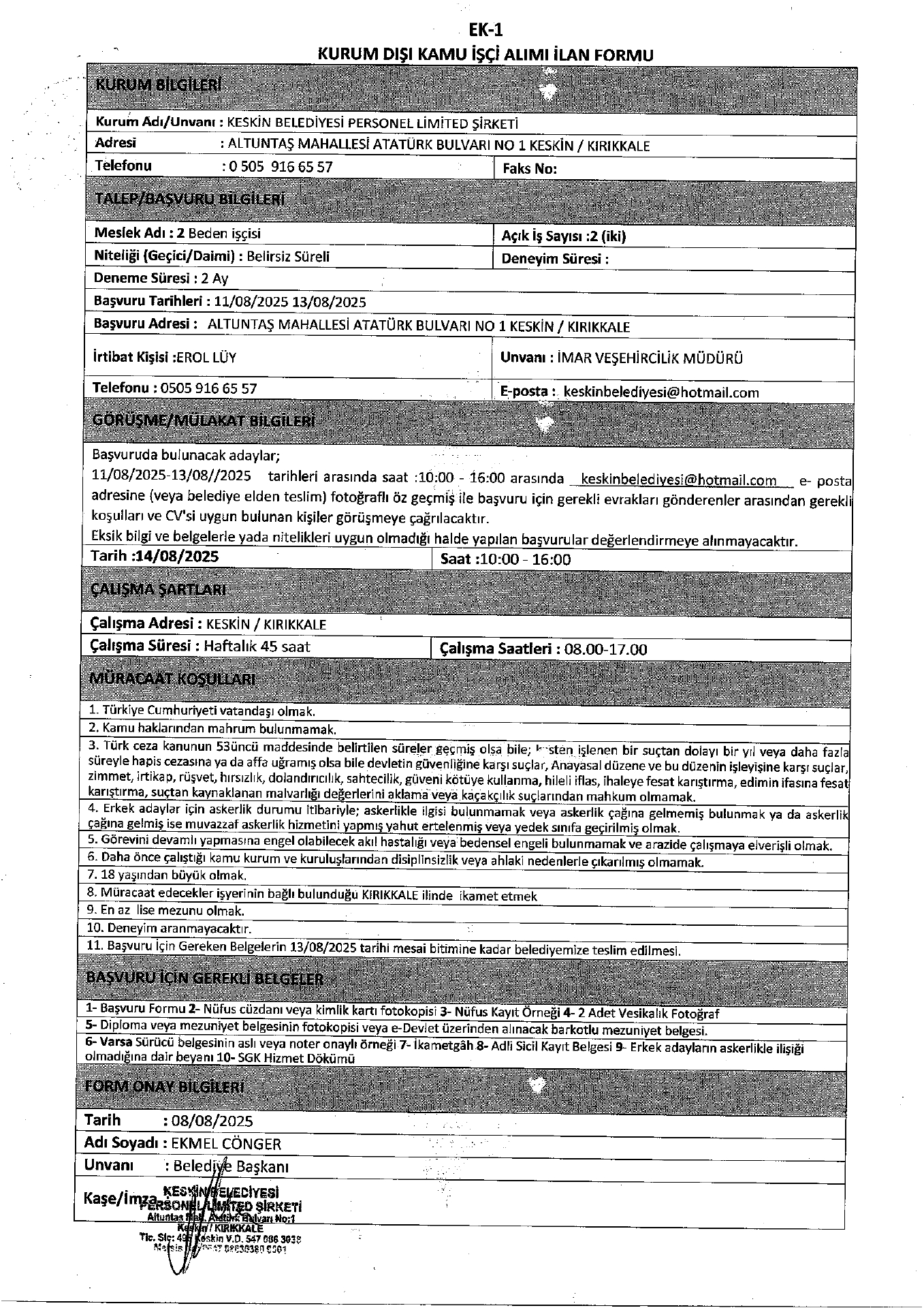 Kırıkkale Keskin Belediyesi 2 İşçi Alacak. Son başvuru tarihi 13 ağustos 2025