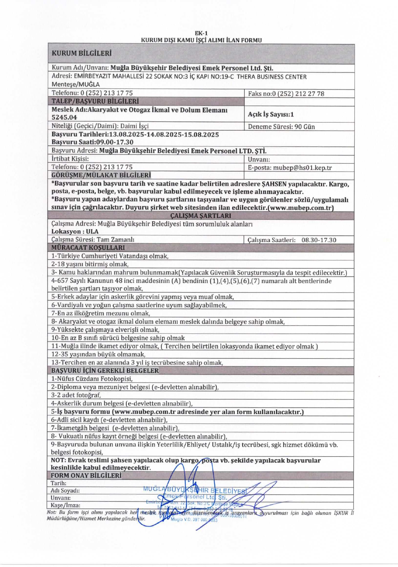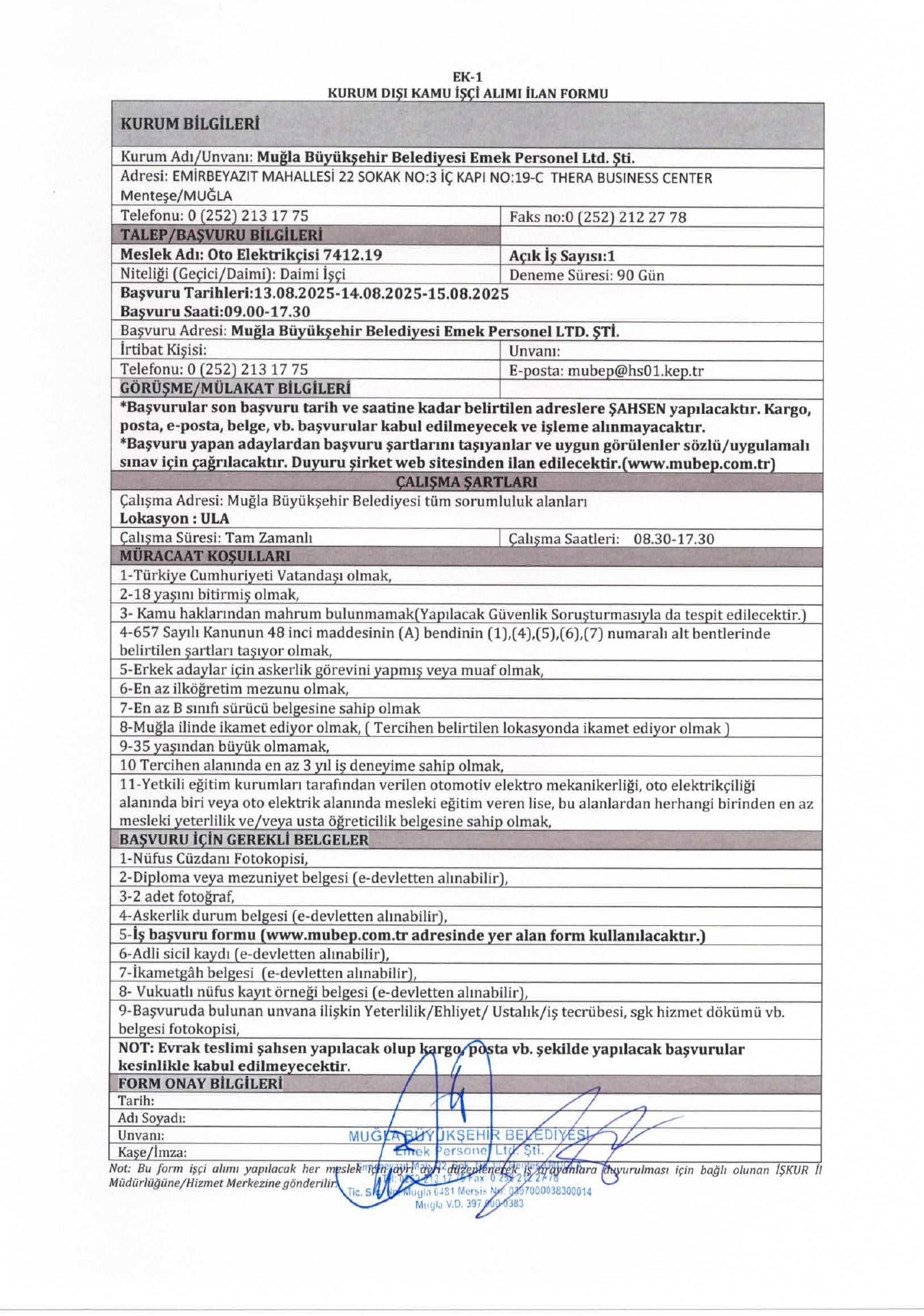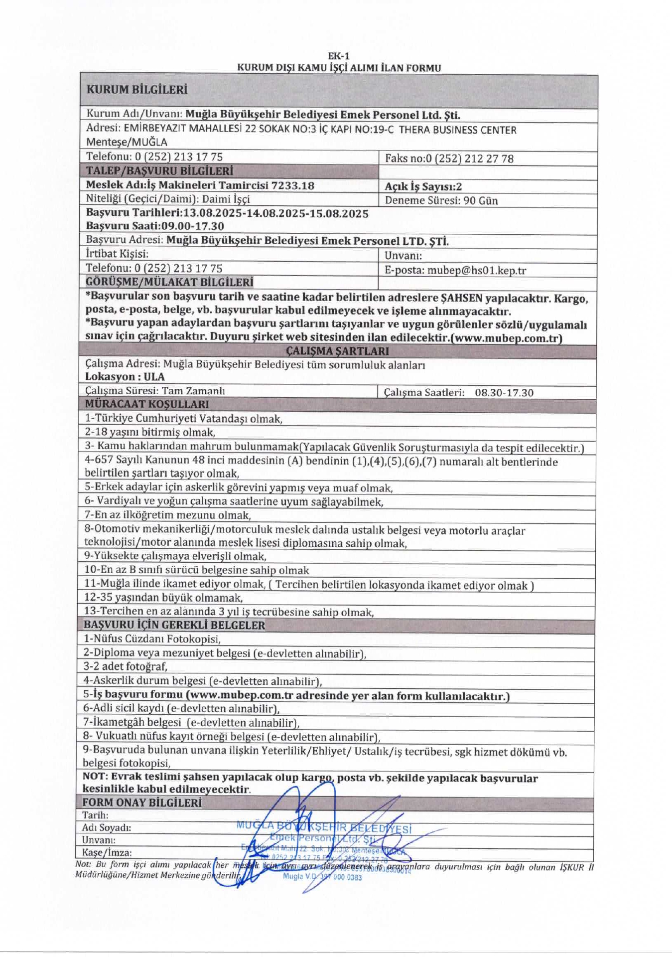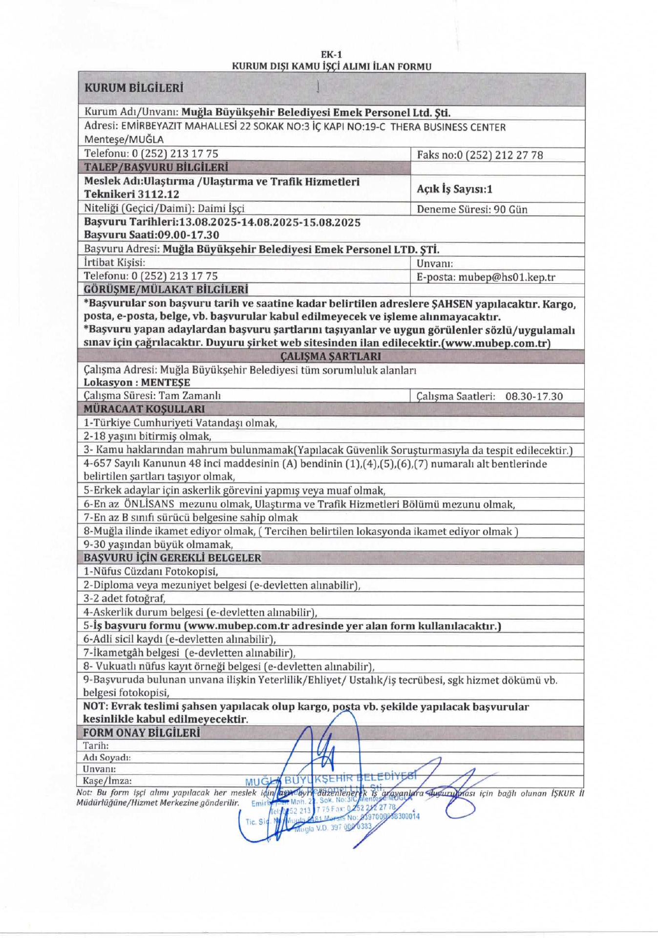 Muğla Büyükşehir Belediyesi 12 İşçi Alacak. Son başvuru tarihi 15 ağustos 2025