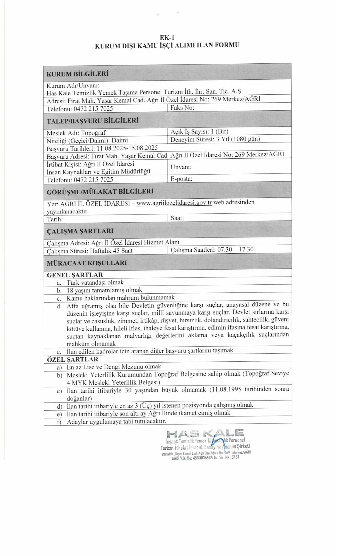 Ağrı Has Kale Temizlik 1 İşçi Alacak. Son başvuru tarihi 15 ağustos 2025