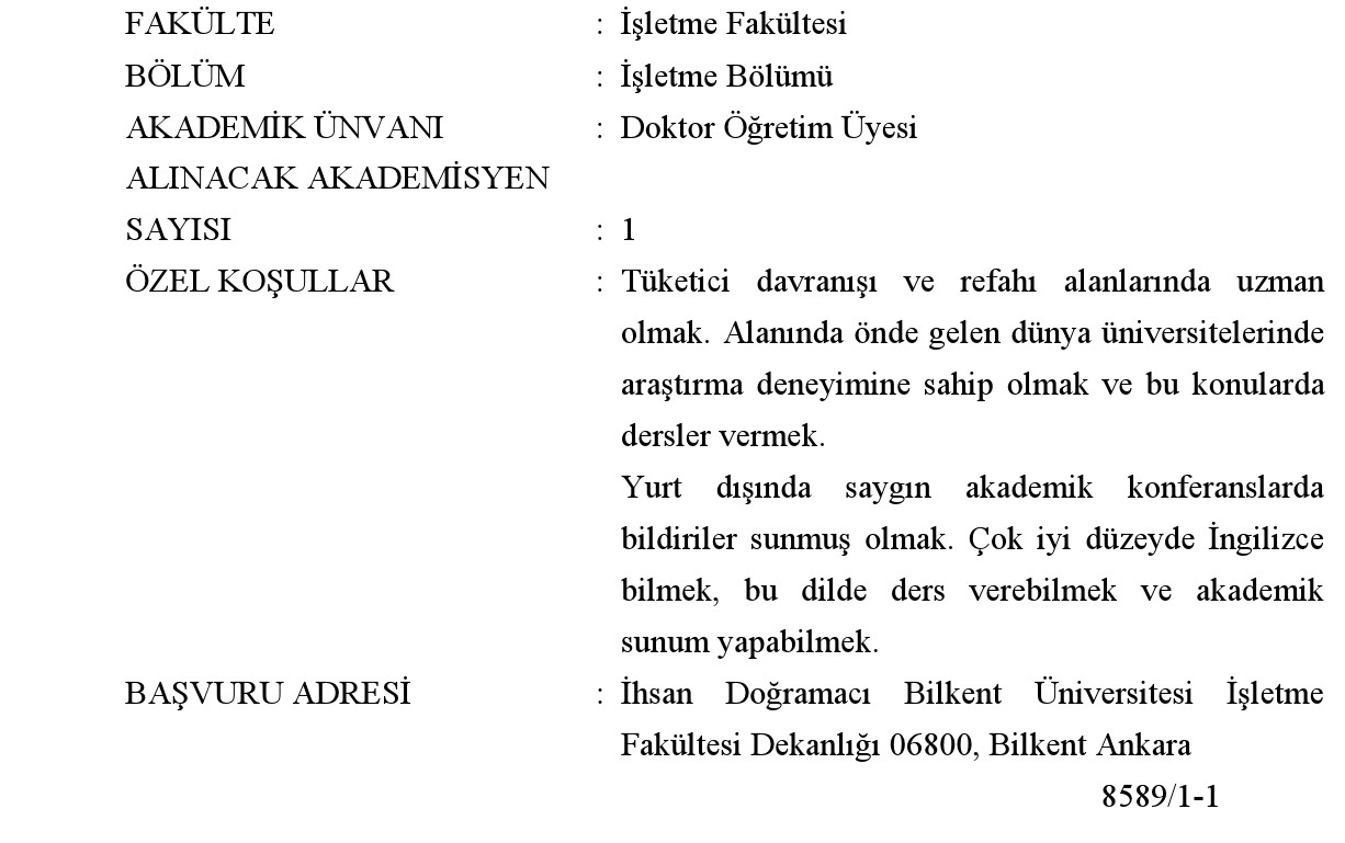 2547 sayılı Yüksek Öğretim Kanununun 23. maddesi, 12 Haziran 2018 tarih ve 30449 sayılı Resmi Gazete'de yayınlanmış olan "Öğretim Üyeliğine Yükseltilme ve Atanma Yönetmeliği"nin Doktor Öğretim Üyesi Kadrolarına Atanma koşullarını düzenleyen 4-7. maddeleri hükümlerinde aranan koşulları yerine getirmiş olmak kaydı ile İhsan Doğramacı Bilkent Üniversitesi İşletme Fakültesi, İşletme Bölümü'ne tam gün statüde çalışacak öğretim üyesi alınacaktır.