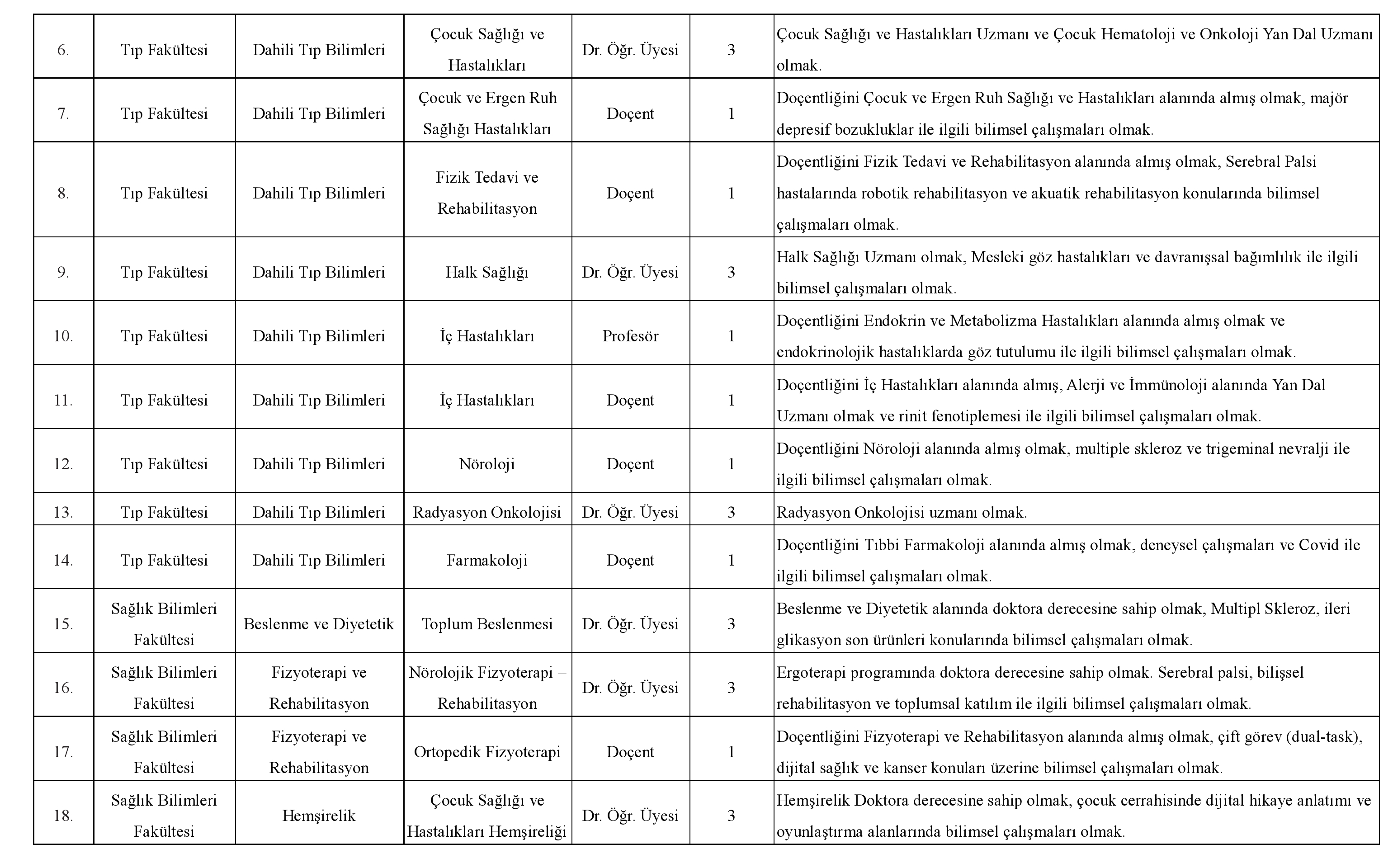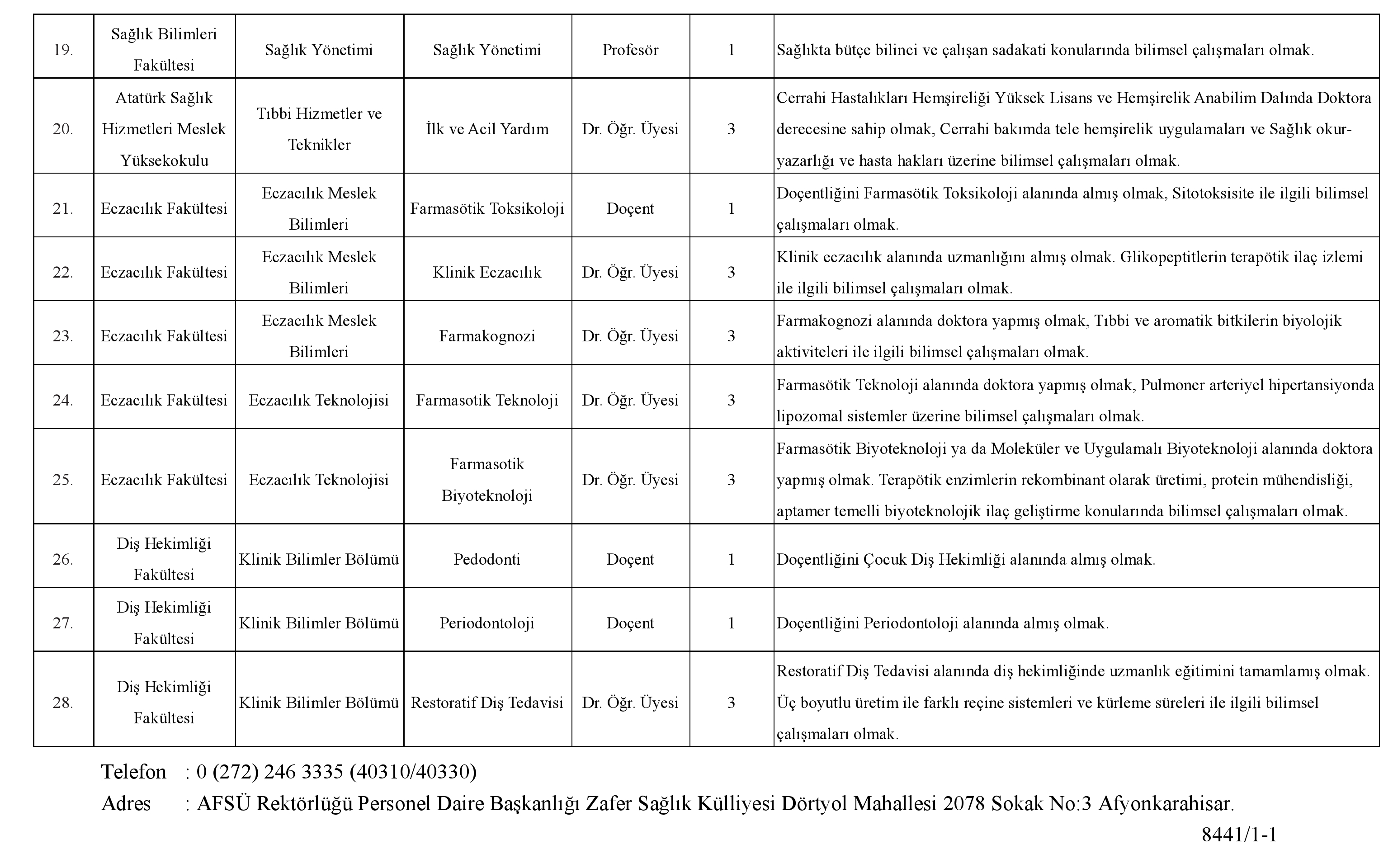Üniversitemizin aşağıda belirtilen birimlerine 2547 sayılı Yükseköğretim Kanunu, Öğretim Üyeliğine Yükseltilme ve Atanma Yönetmeliği ve Afyonkarahisar Sağlık Bilimleri Üniversitesi Öğretim Üyeliğine Yükseltilme ve Atanma Yönergesinin ilgili maddelerine göre öğretim üyesi alınacaktır. İlan edilen kadrolar aşağıda belirtilmiş olup, istenen evraklara ilişkin detaylı bilgilere www.afsu.edu.tr web sayfasından erişilebilecektir.