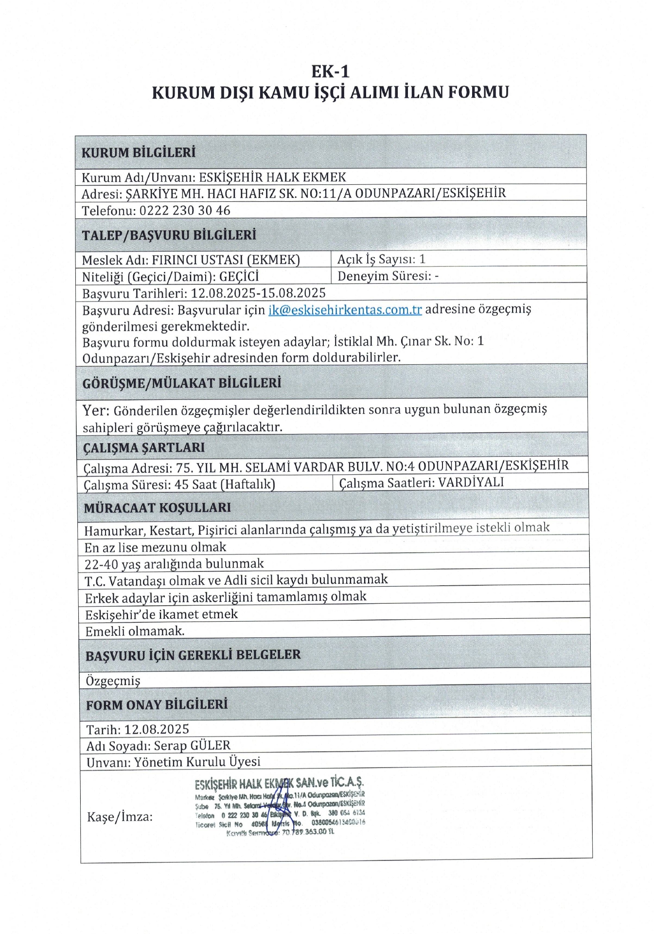 Eskişehir Halk Ekmek 1 İşçi Alacak. Son başvuru tarihi 15 ağustos 2025