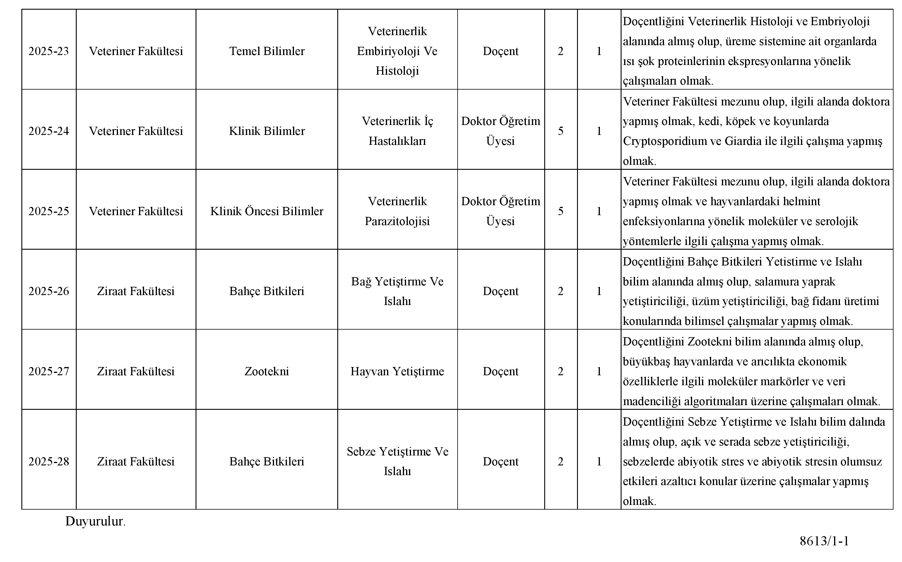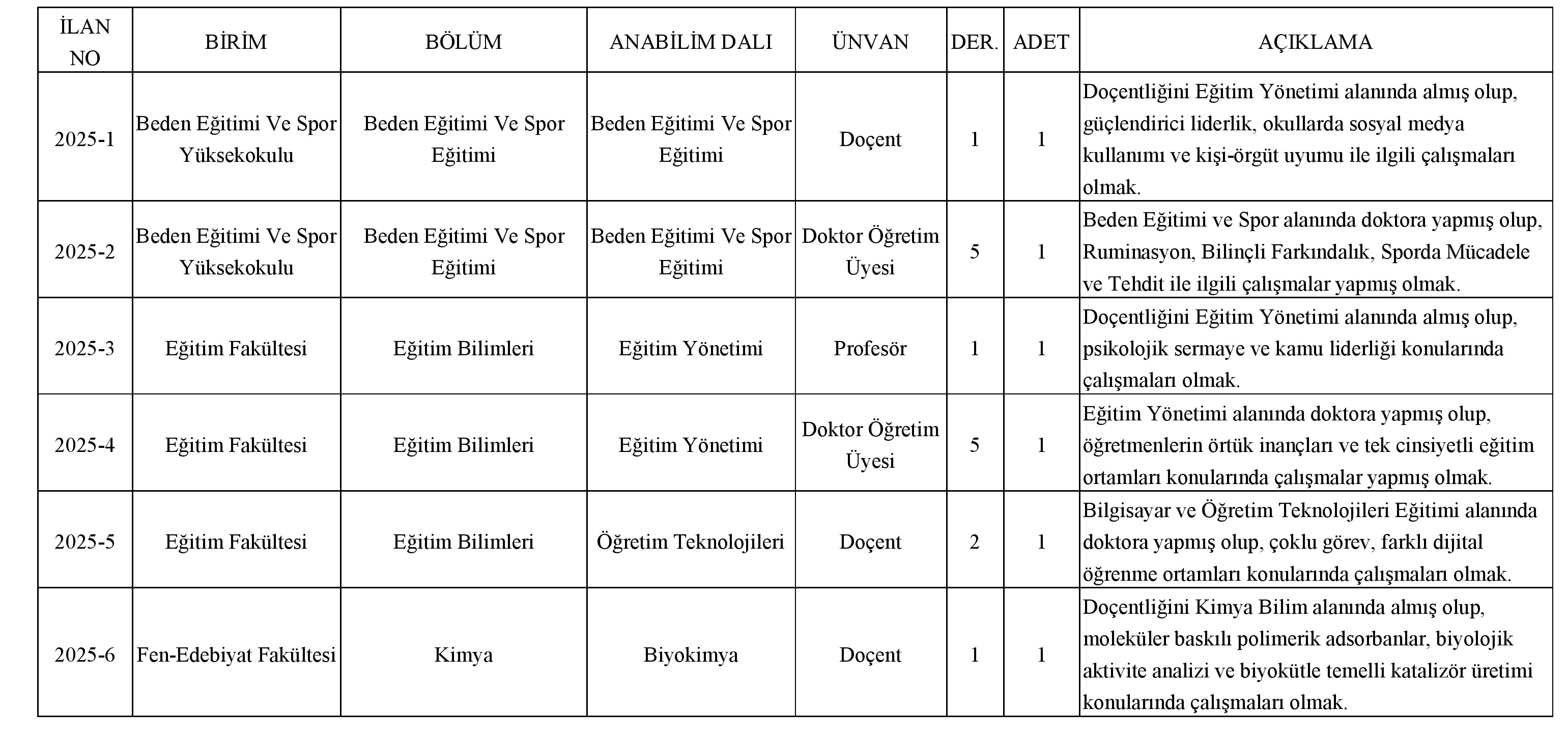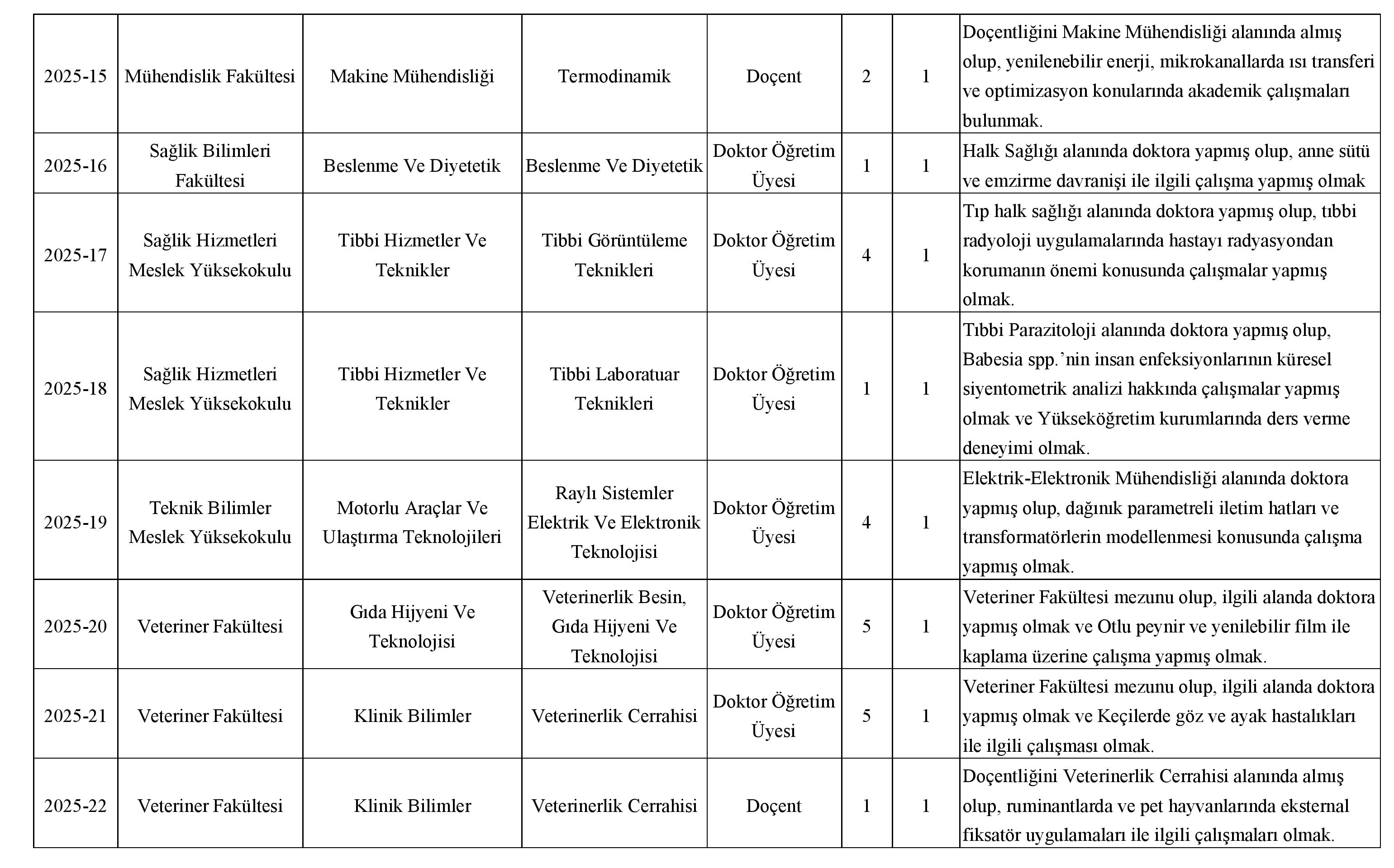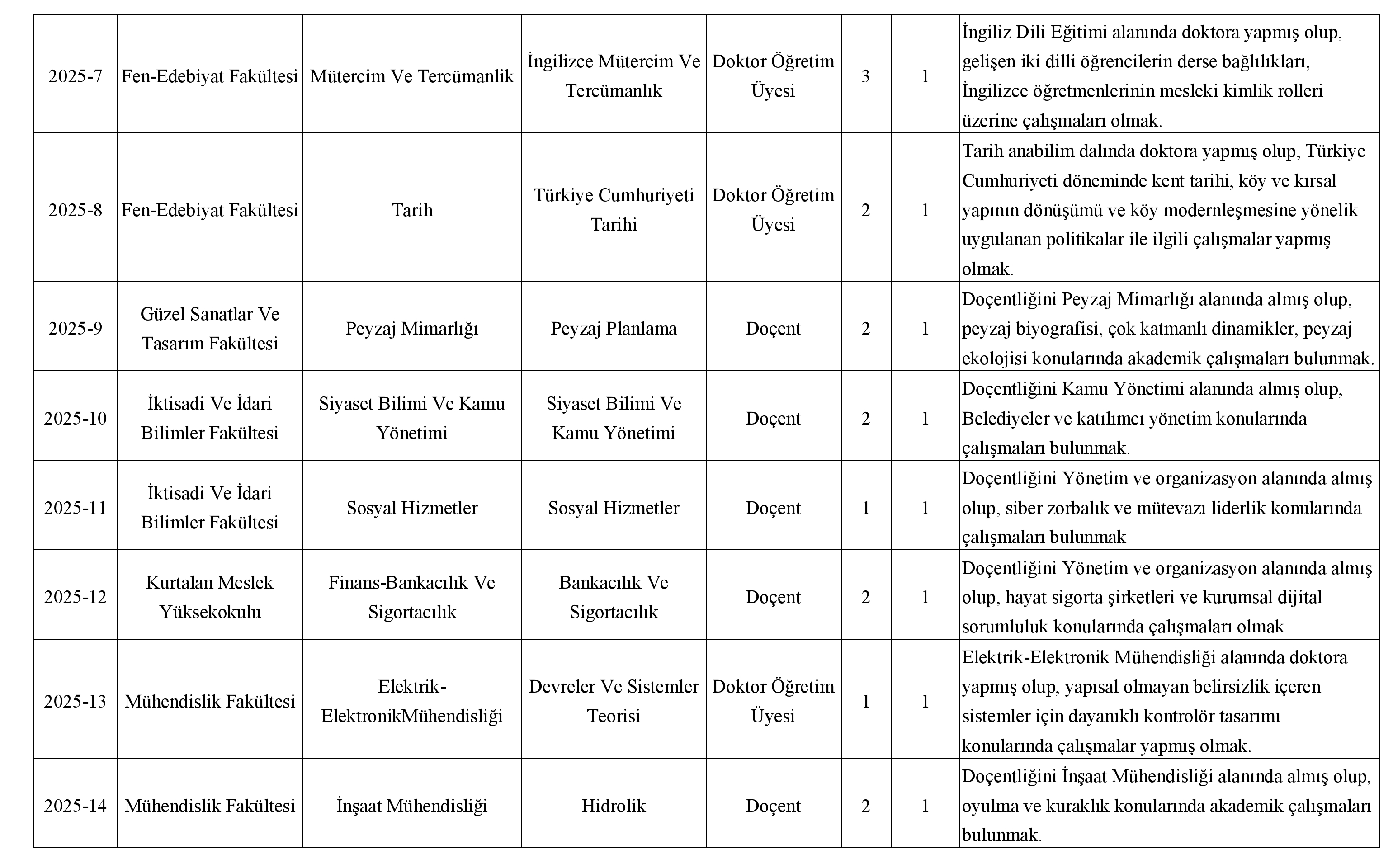 Üniversitemizin aşağıda belirtilen birimlerine, 2547 ve 2914 sayılı Kanun, "Öğretim Üyeliğine Yükseltilme ve Atanma Yönetmeliği" nin yürürlükteki ilgili maddeleri ile Üniversitemiz Öğretim Üyeliğine Yükseltilme ve Atanma Kriterlerine göre öğretim üyeleri alınacaktır.