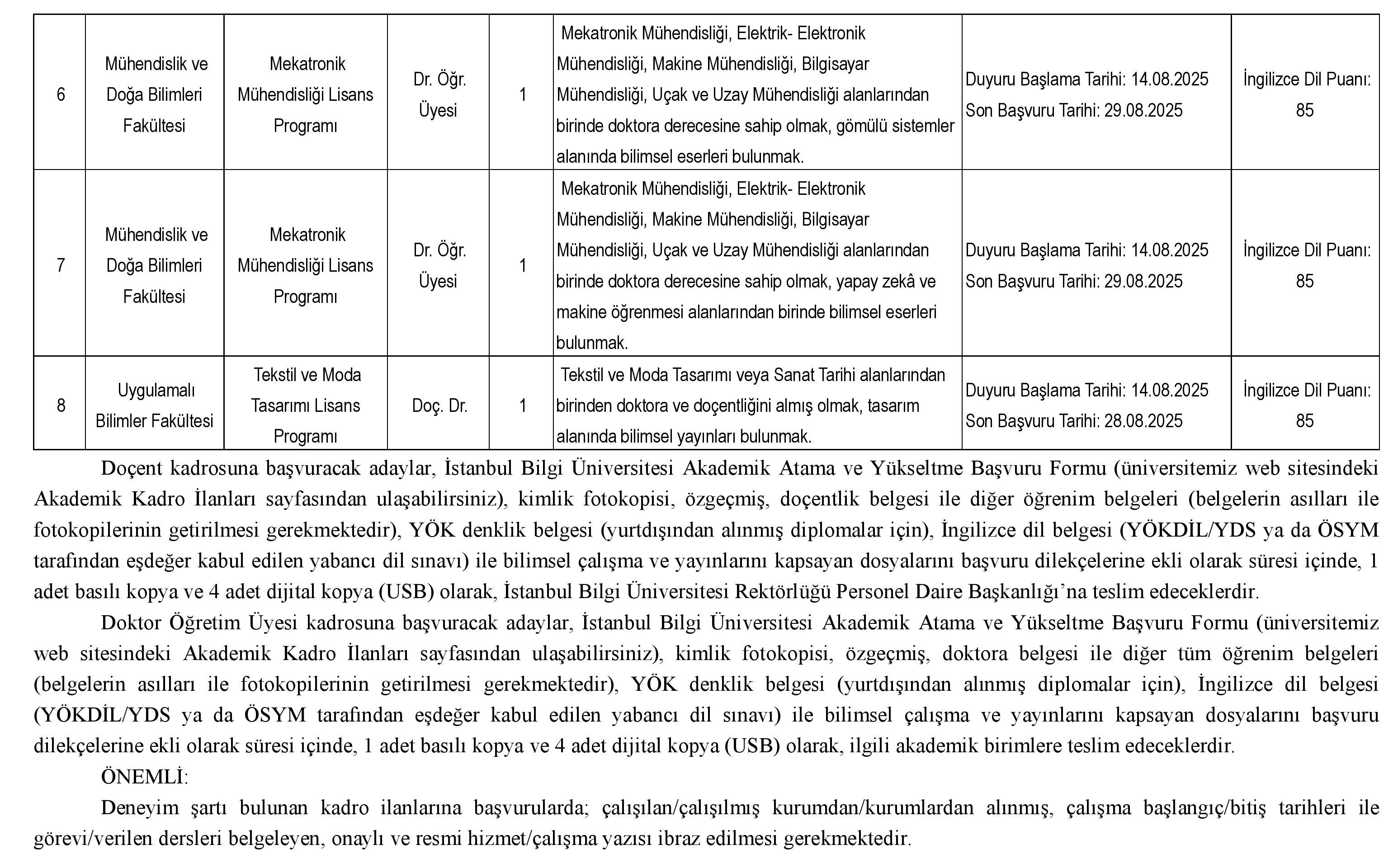 Akademik Kadro İlanları sayfasından ulaşabilirsiniz), kimlik fotokopisi, özgeçmiş, doçentlik belgesi ile diğer öğrenim belgeleri (belgelerin asılları ile fotokopilerinin getirilmesi gerekmektedir), YÖK denklik belgesi (yurtdışından alınmış diplomalar için), İngilizce dil belgesi (YÖKDİL/YDS ya da ÖSYM tarafından eşdeğer kabul edilen yabancı dil sınavı) ile bilimsel çalışma ve yayınlarını kapsayan dosyalarını başvuru dilekçelerine ekli olarak süresi içinde, 1 adet basılı kopya ve 4 adet dijital kopya (USB) olarak, İstanbul Bilgi Üniversitesi Rektörlüğü Personel Daire Başkanlığı'na teslim edeceklerdir.