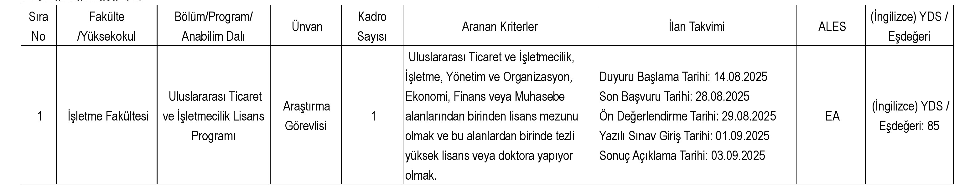 Deneyim şartı bulunan kadro ilanlarına başvurularda; çalışılan/çalışılmış kurumdan/kurumlardan alınmış, çalışma başlangıç/bitiş tarihleri ile görevi/verilen dersleri belgeleyen, onaylı ve resmi hizmet/çalışma yazısı ibraz edilmesi gerekmektedir.