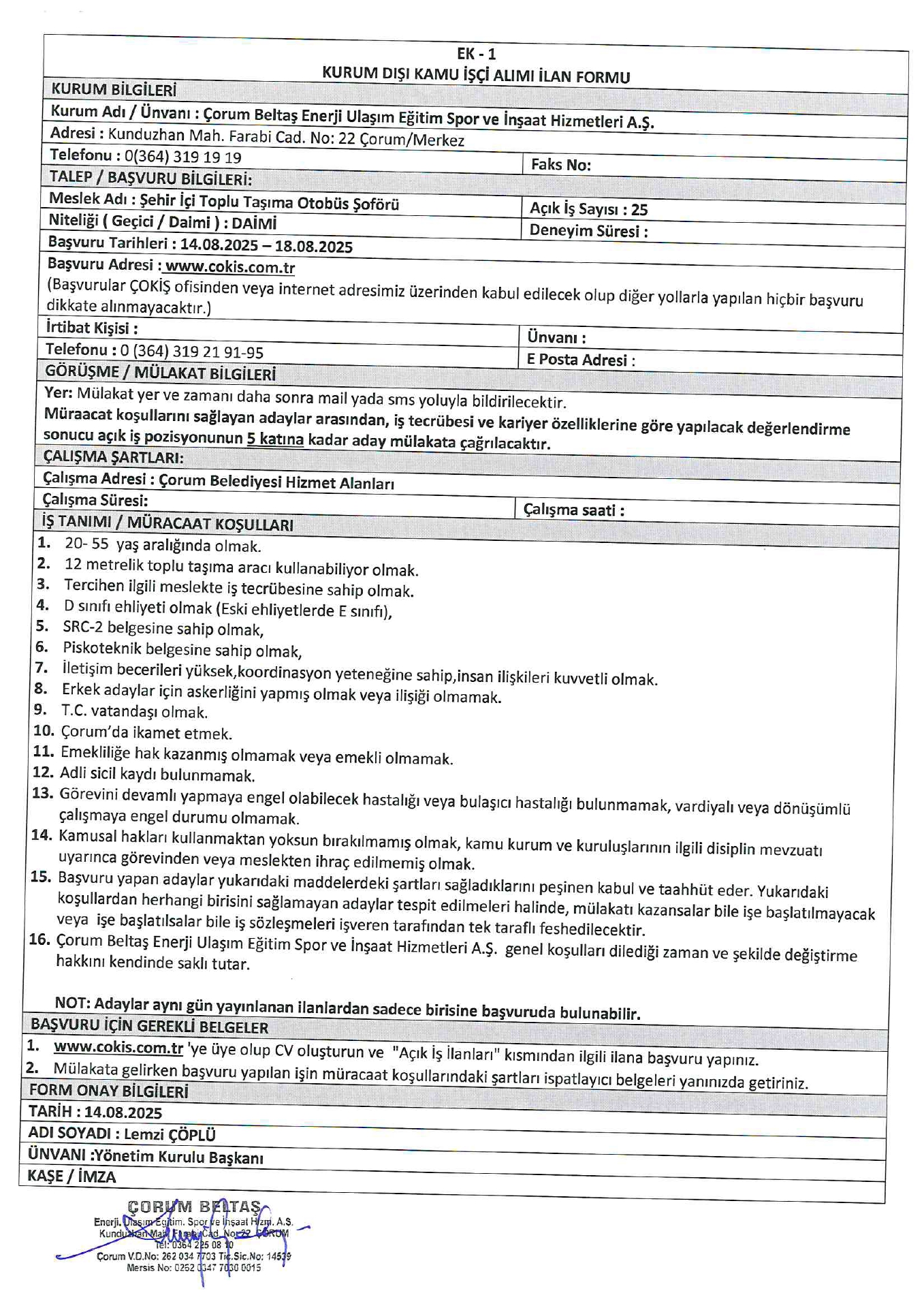 Çorum Beltaş 25 İşçi Alacak. Son başvuru tarihi 18 ağustos 2025