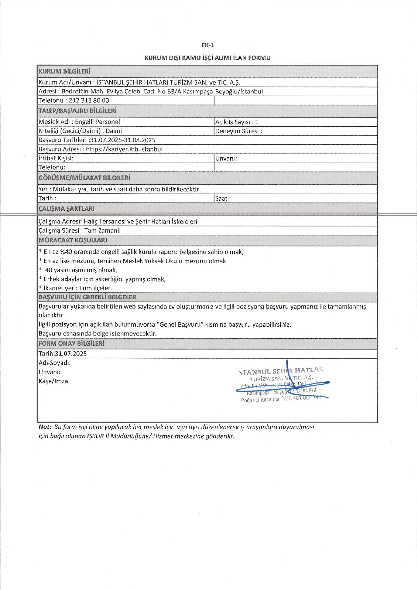 İstanbul Şehir Hatları Turizm 1 İşçi Alacak. Son başvuru tarihi 31 ağustos 2025
