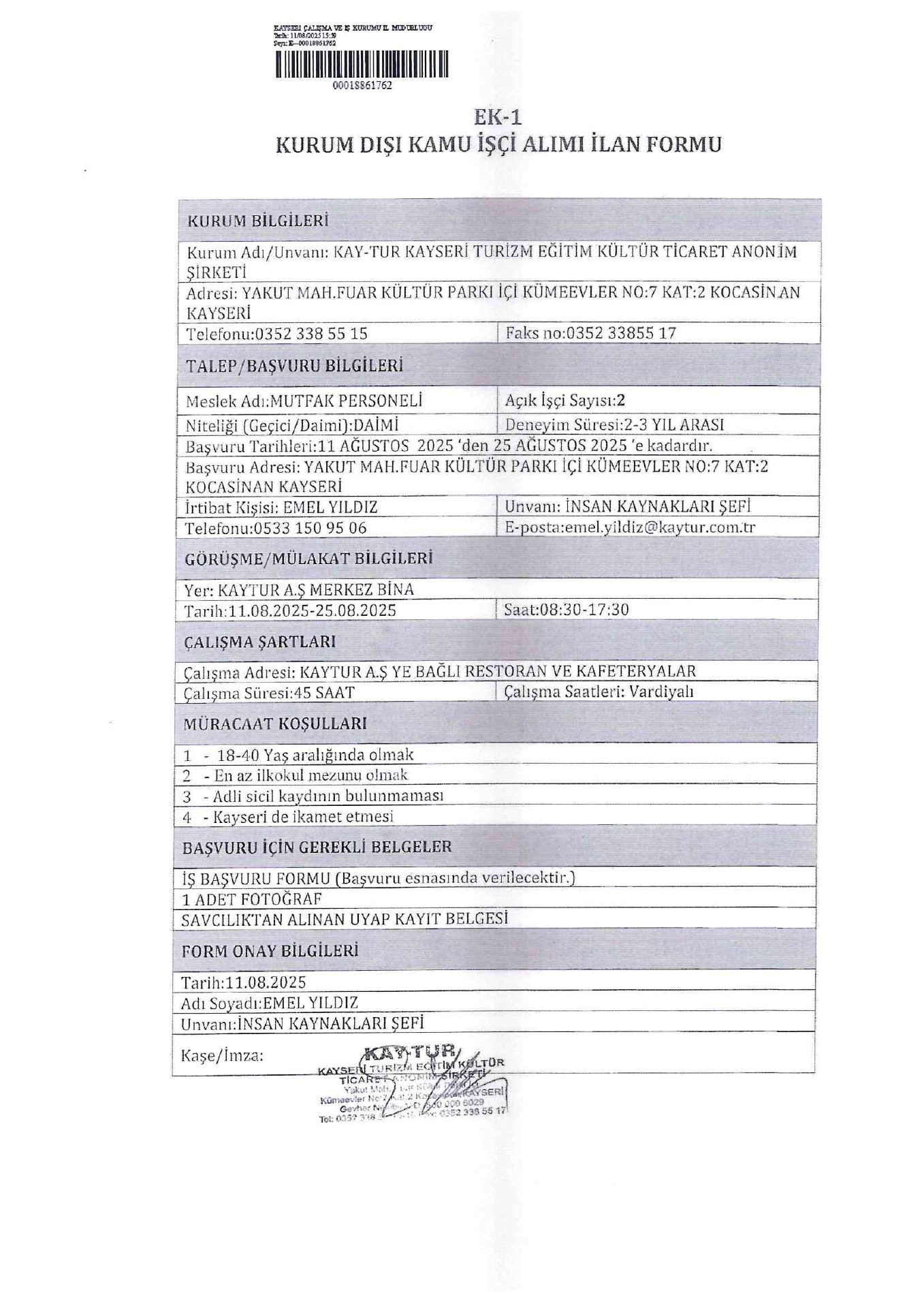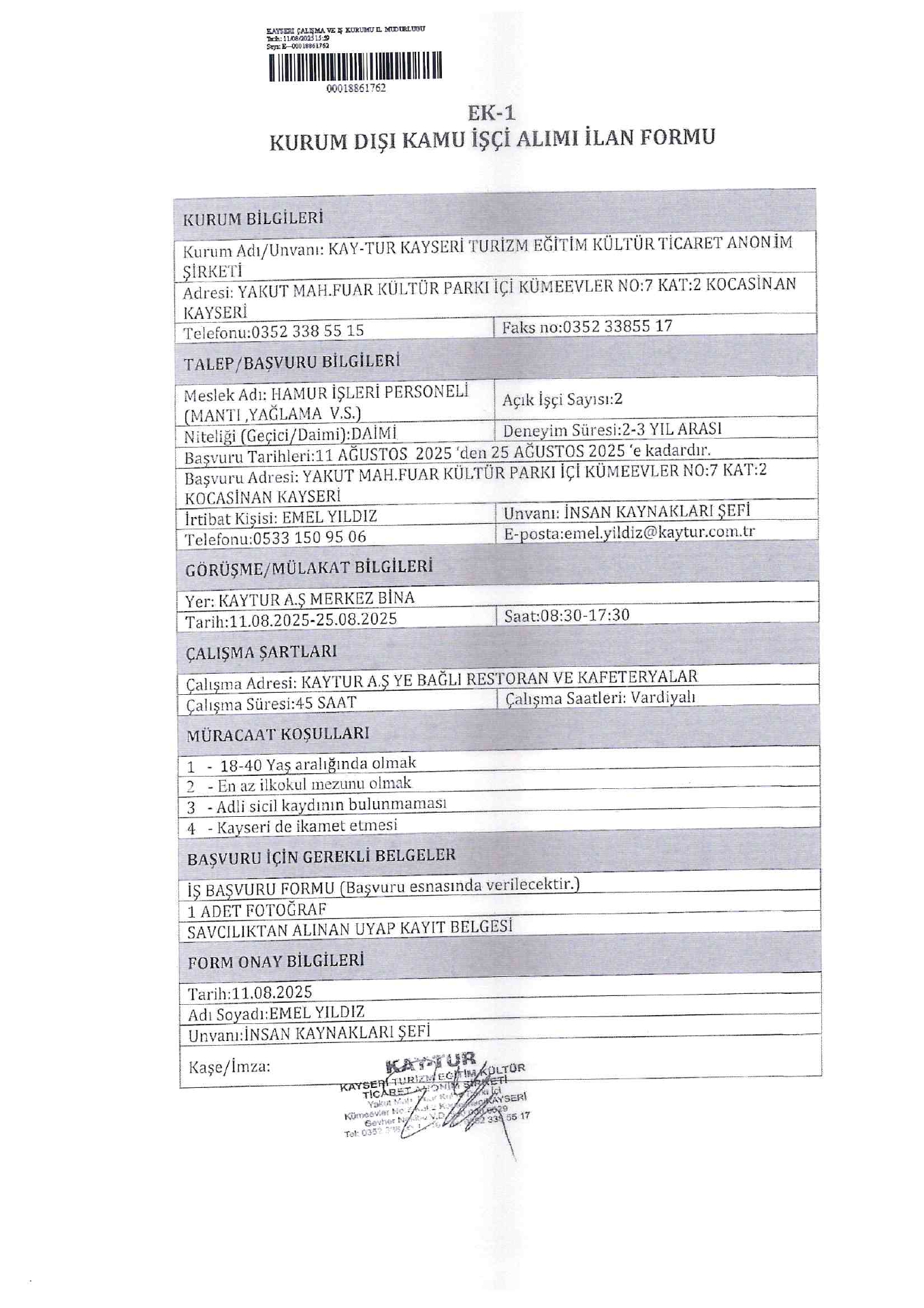 Kayseri KAYTUR 4 İşçi Alacak. Son başvuru tarihi 25 ağustos 2025