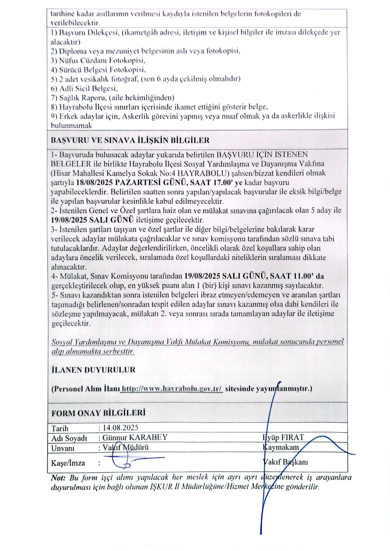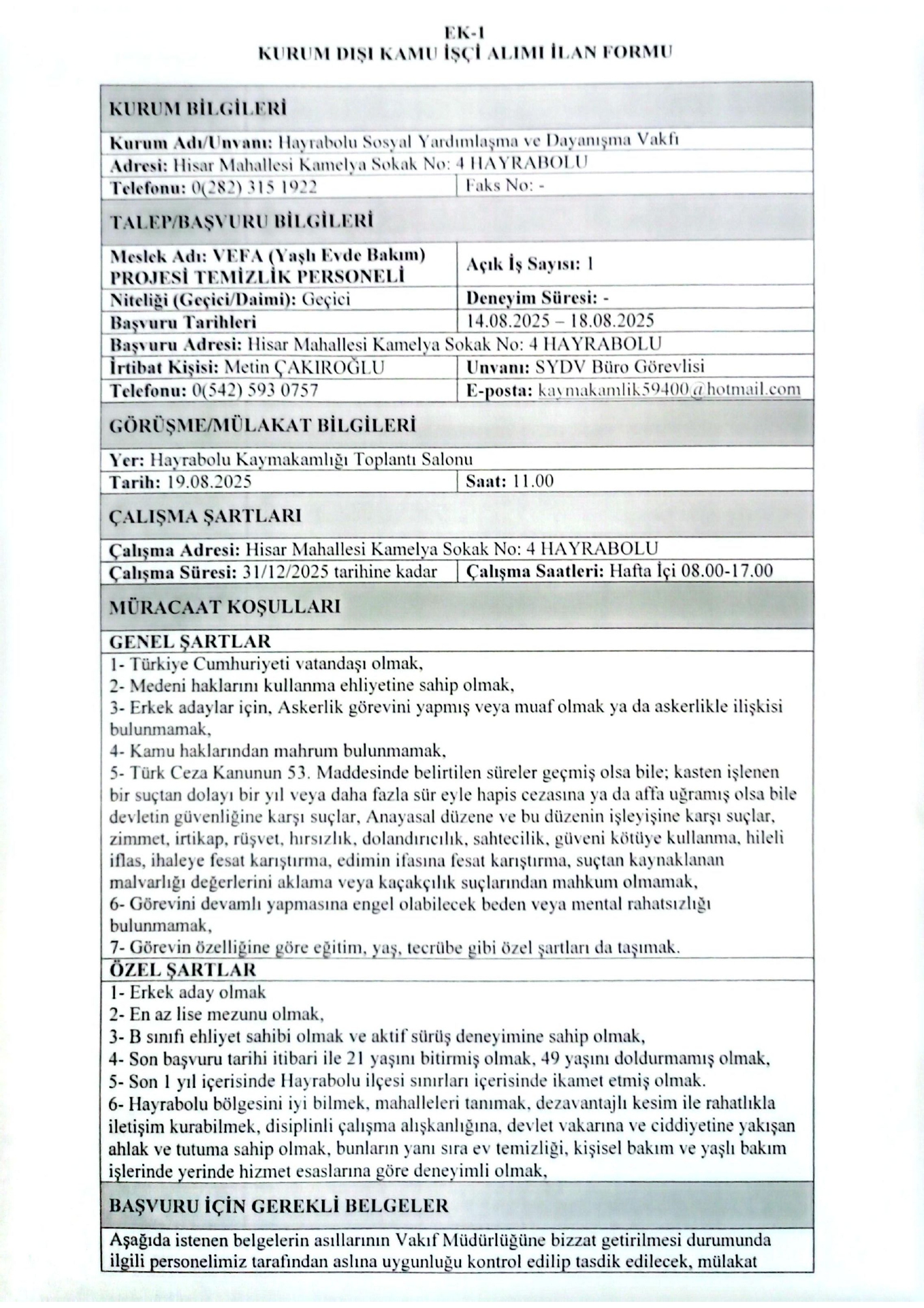 Tekirdağ Hayranbolu SYDV Geçici 1 İşçi Alacak. Son başvuru tarihi 18 ağustos 2025