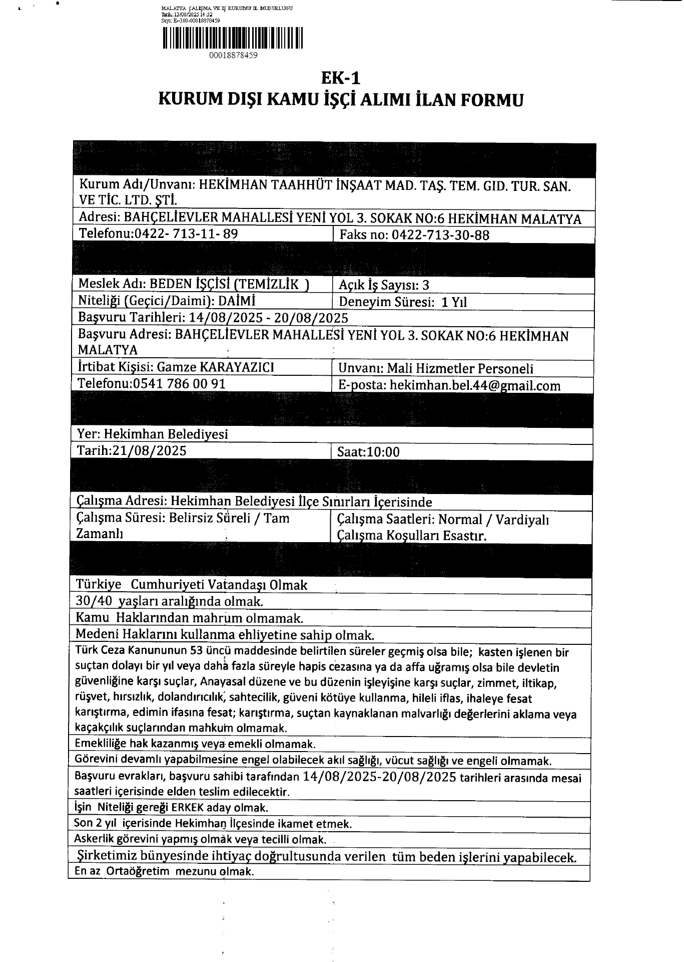Malatya Hekimhan Taahhüt İnşaat 3 İşçi Alacak. Son başvuru tarihi 20 ağustos 2025